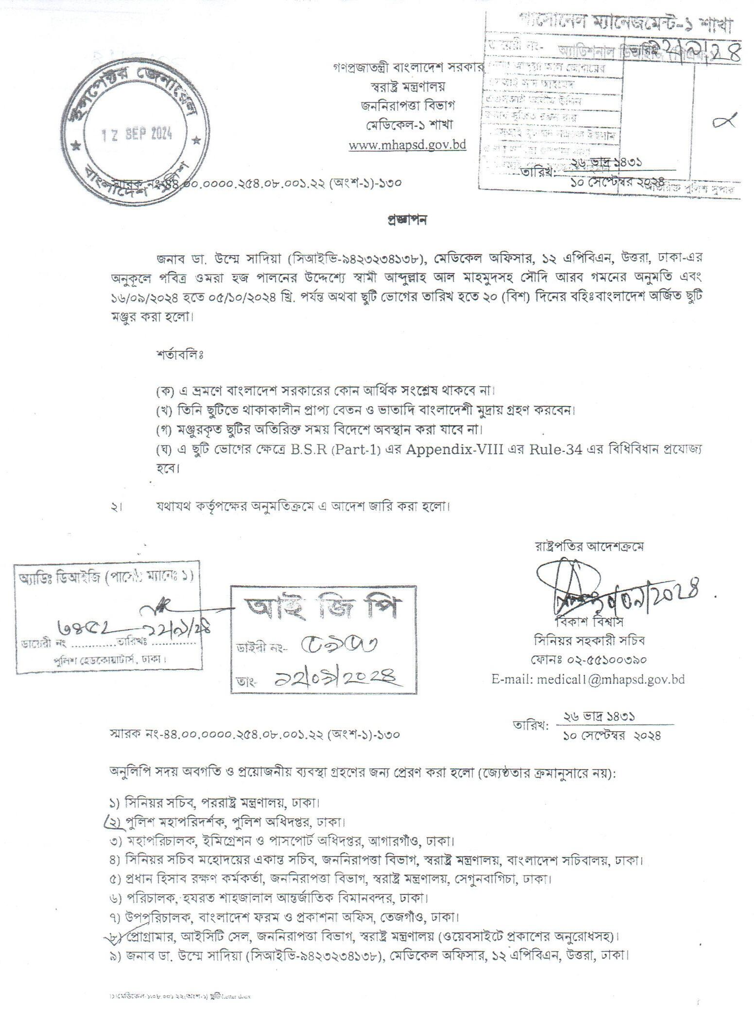 বহিঃ বাংলাদেশ ছুটি, প্রজ্ঞাপন নং- ৮৬৪, তারিখঃ ১৭/০৯/২০২৪ খ্রিঃ