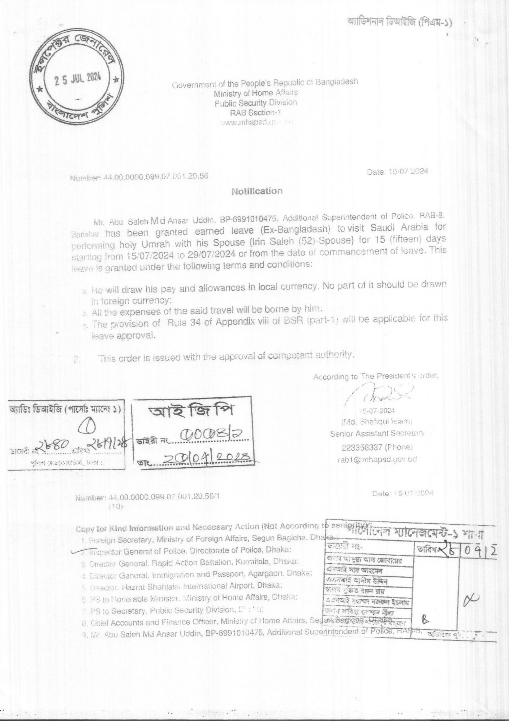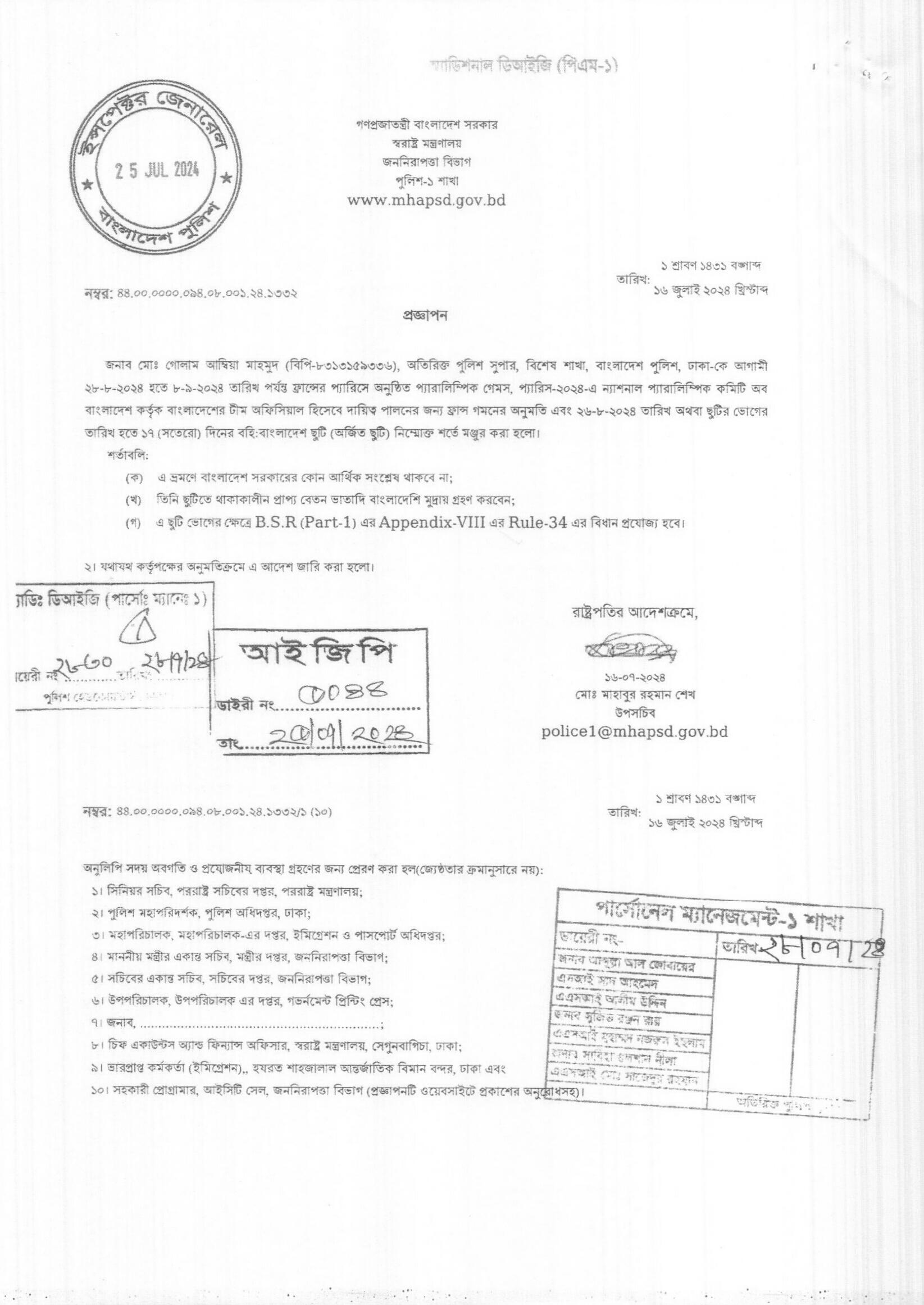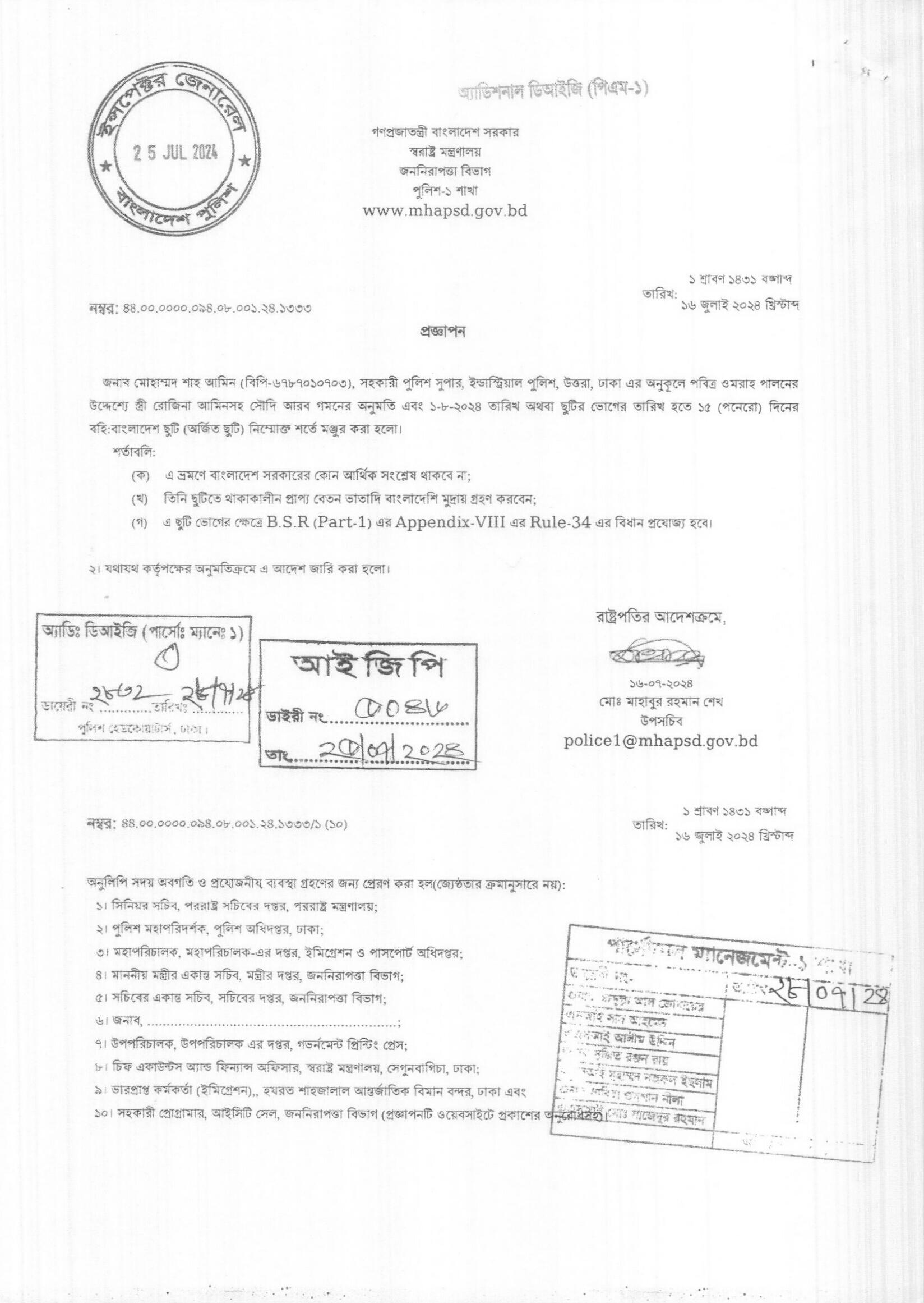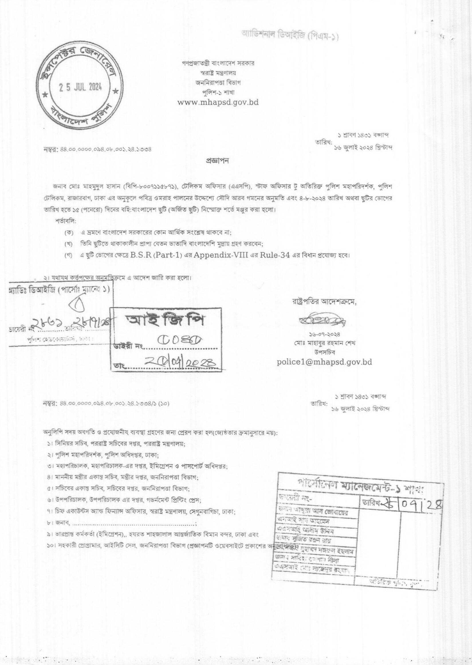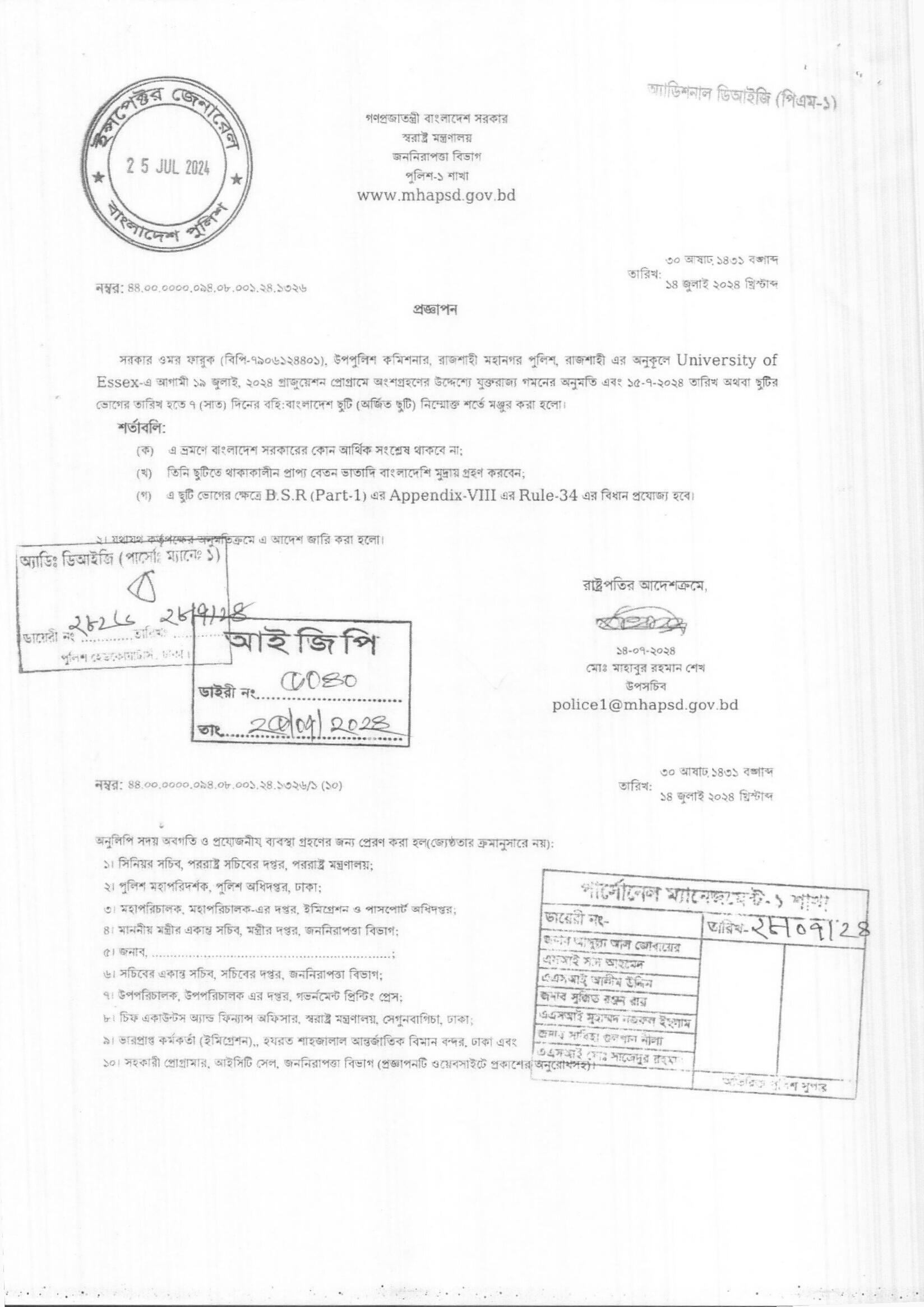 বহিঃ বাংলাদেশ ছুটি, প্রজ্ঞাপন নং- ১৩৩২, তারিখঃ ১৬/০৭/২০২৪ খ্রিঃ