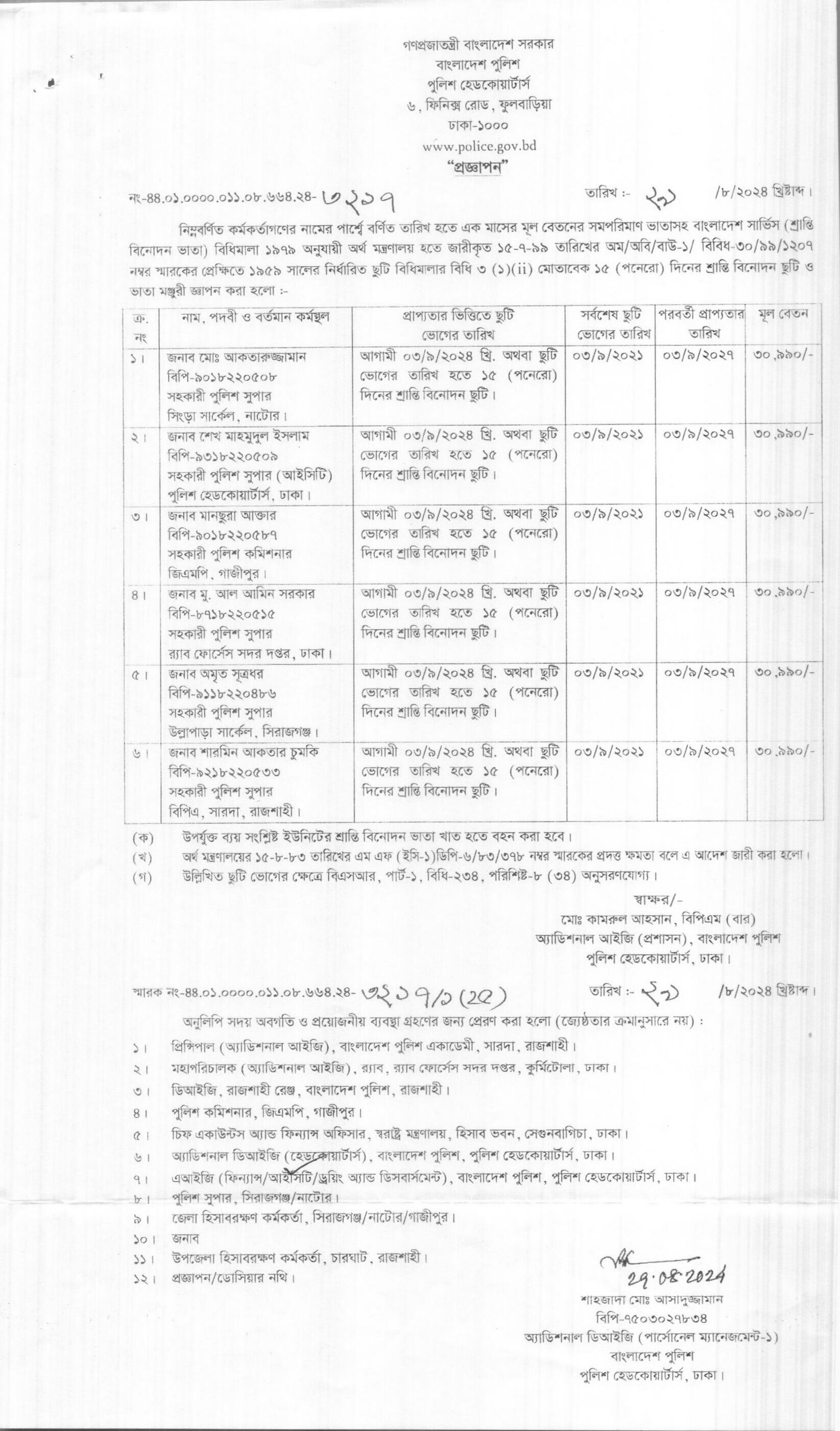 শ্রান্তি বিনোদন ছুটি, প্রজ্ঞাপন নং- ৩২১৭, তারিখঃ ২৯/০৮/২০২৪ খ্রিঃ