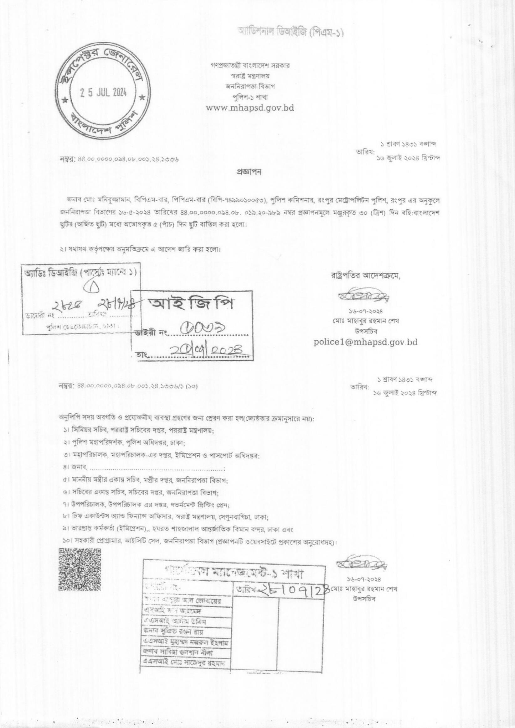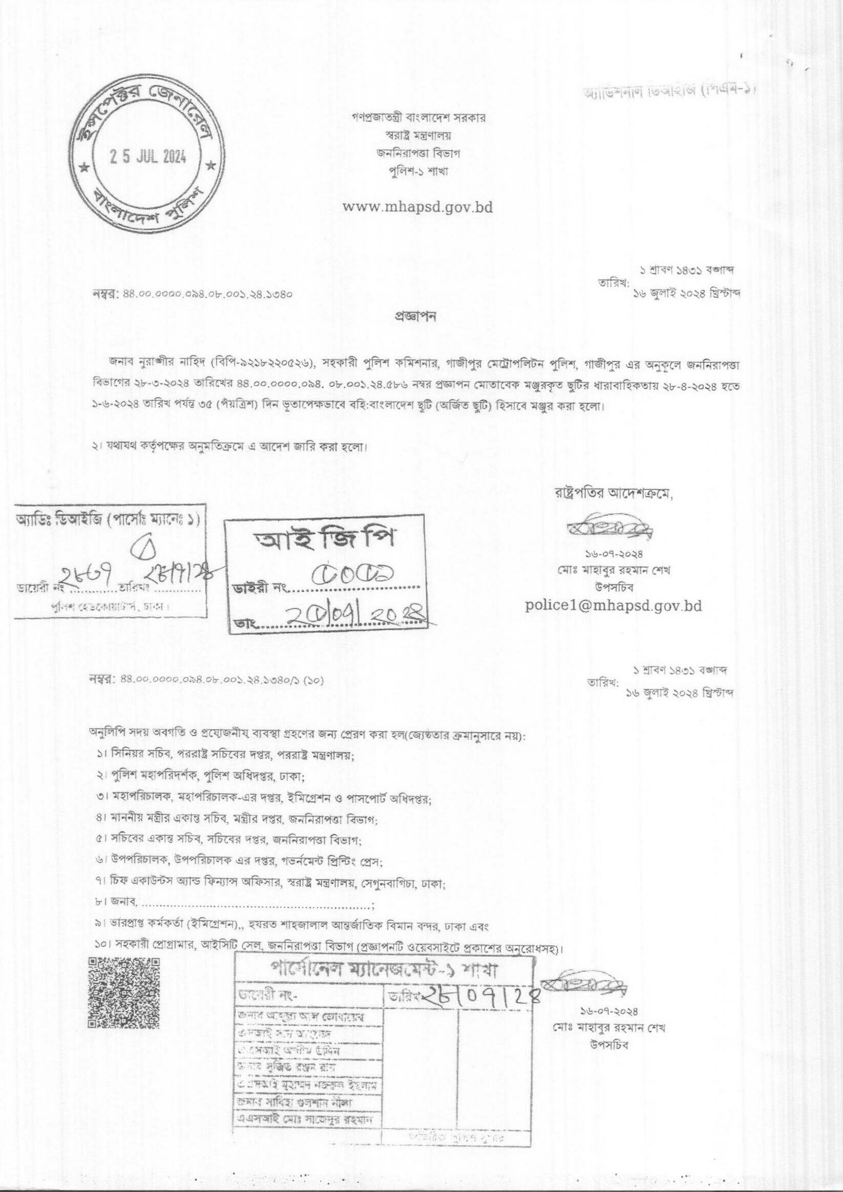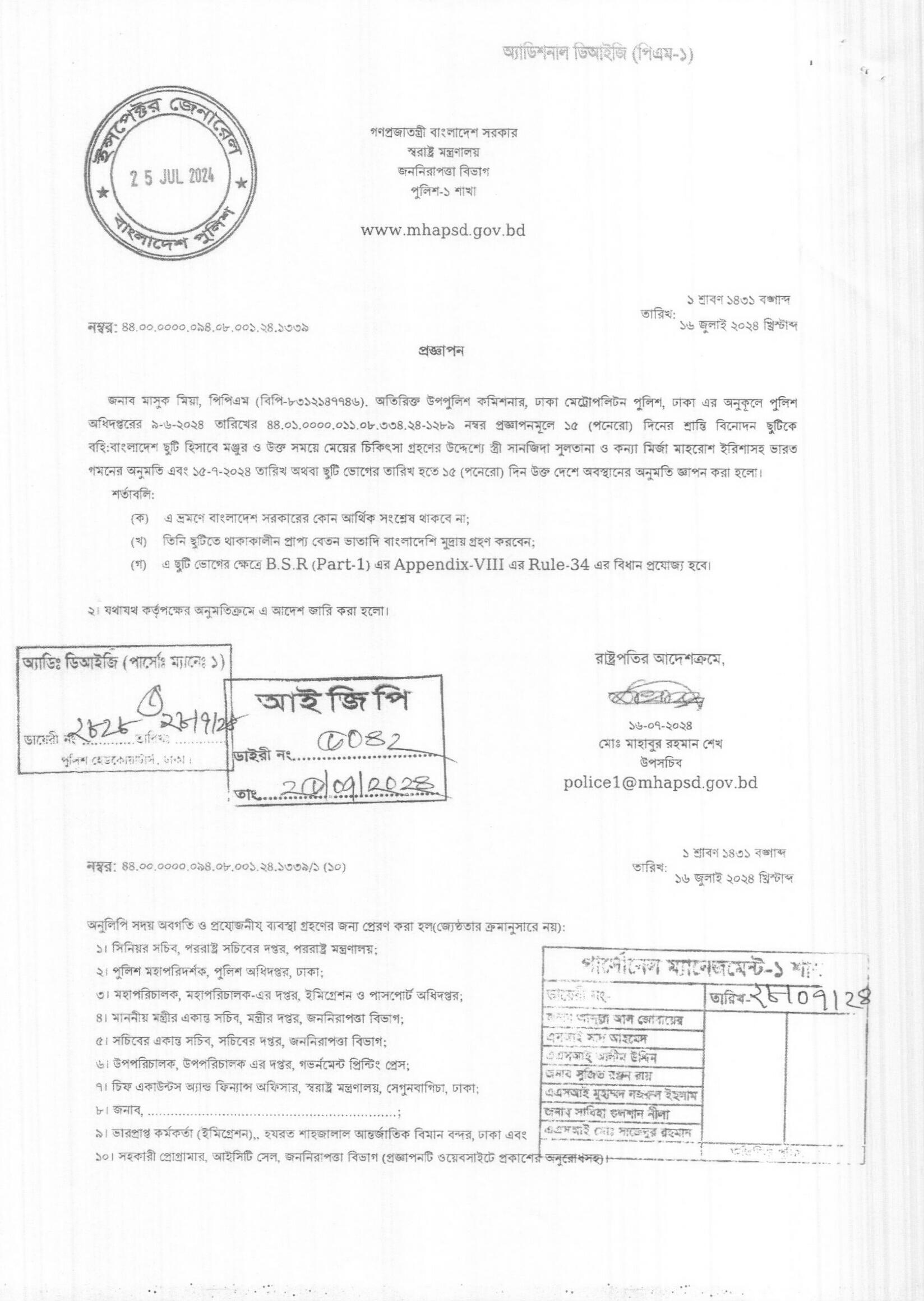 বহিঃ বাংলাদেশ ছুটি, প্রজ্ঞাপন নং- ১৩৪০, তারিখঃ ১৬/০৭/২০২৪ খ্রিঃ