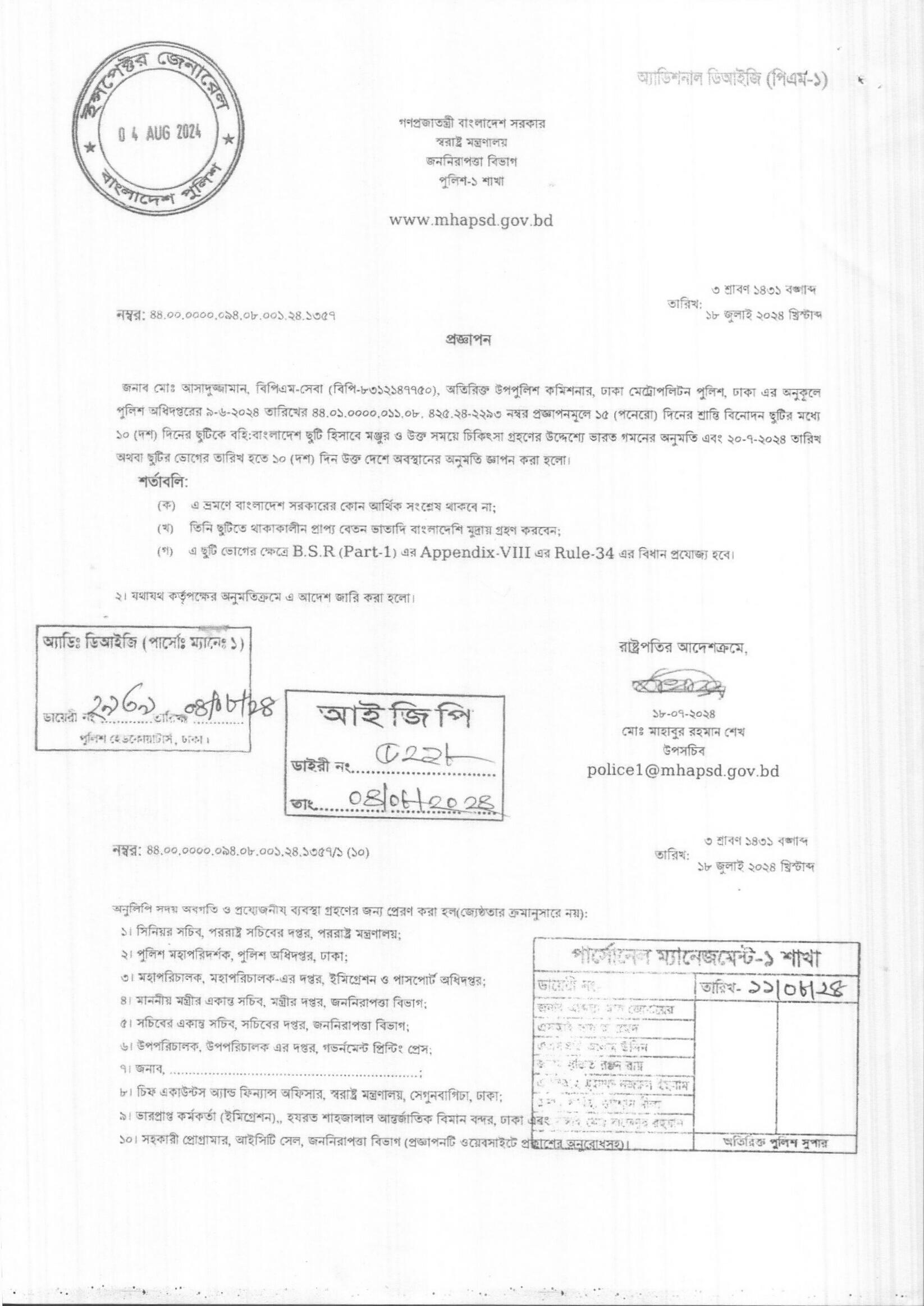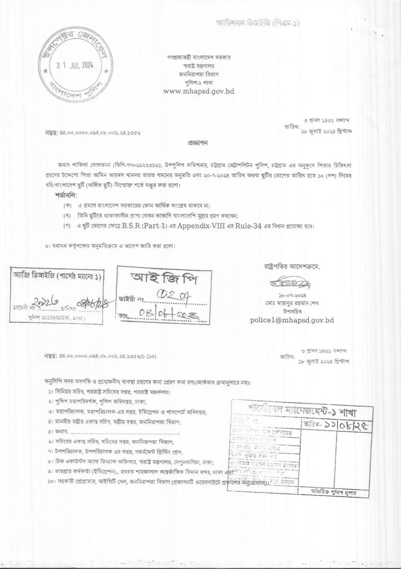 বহিঃ বাংলাদেশ ছুটি, প্রজ্ঞাপন নং- ১৩৫৫, তারিখঃ ১৮/০৭/২০২৪ খ্রিঃ