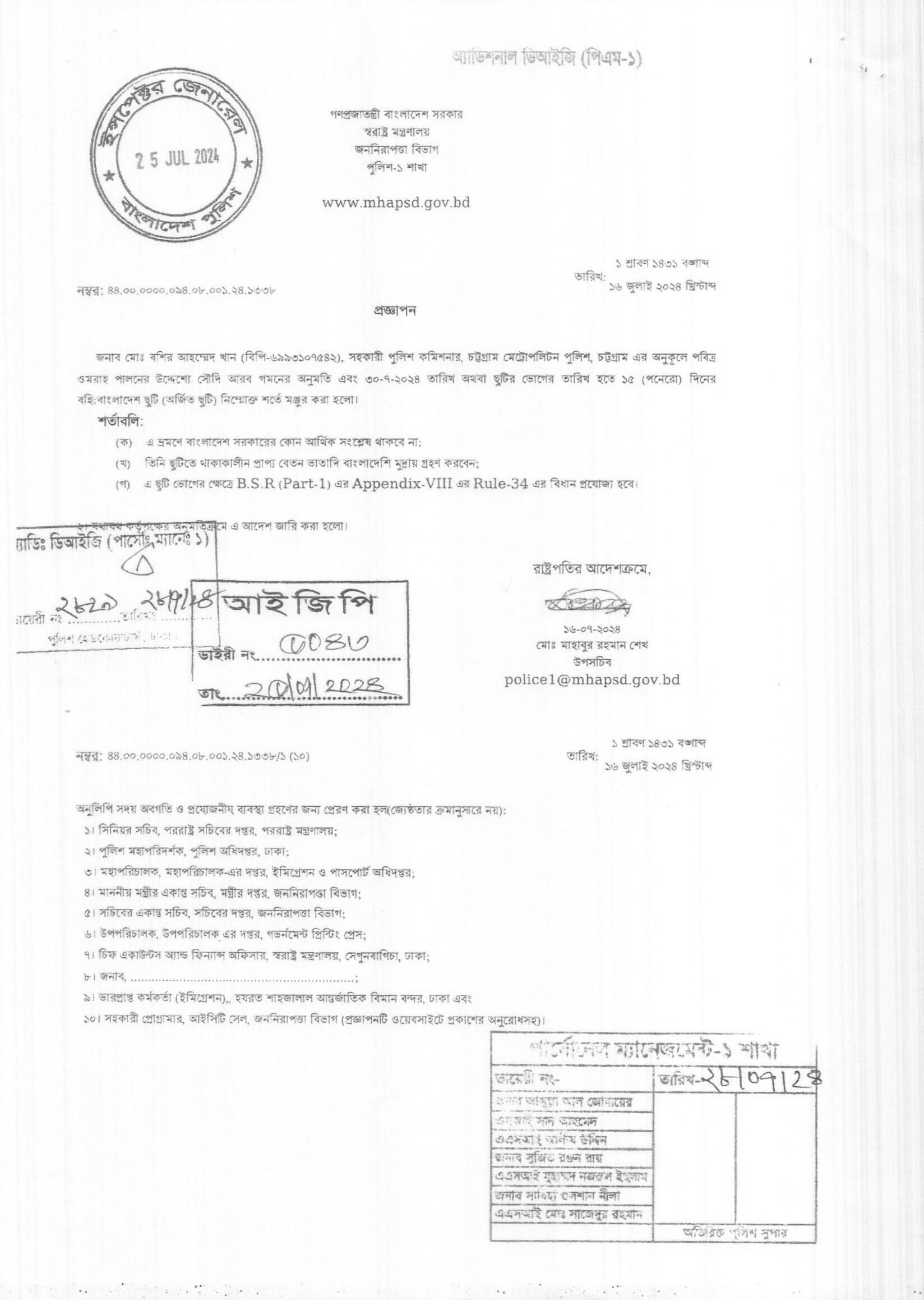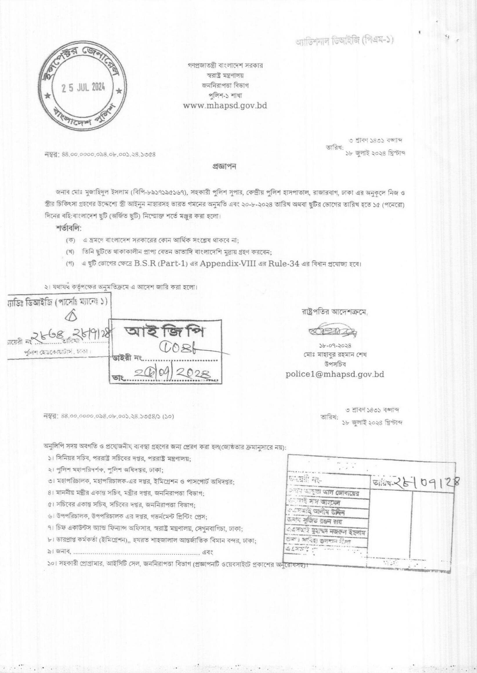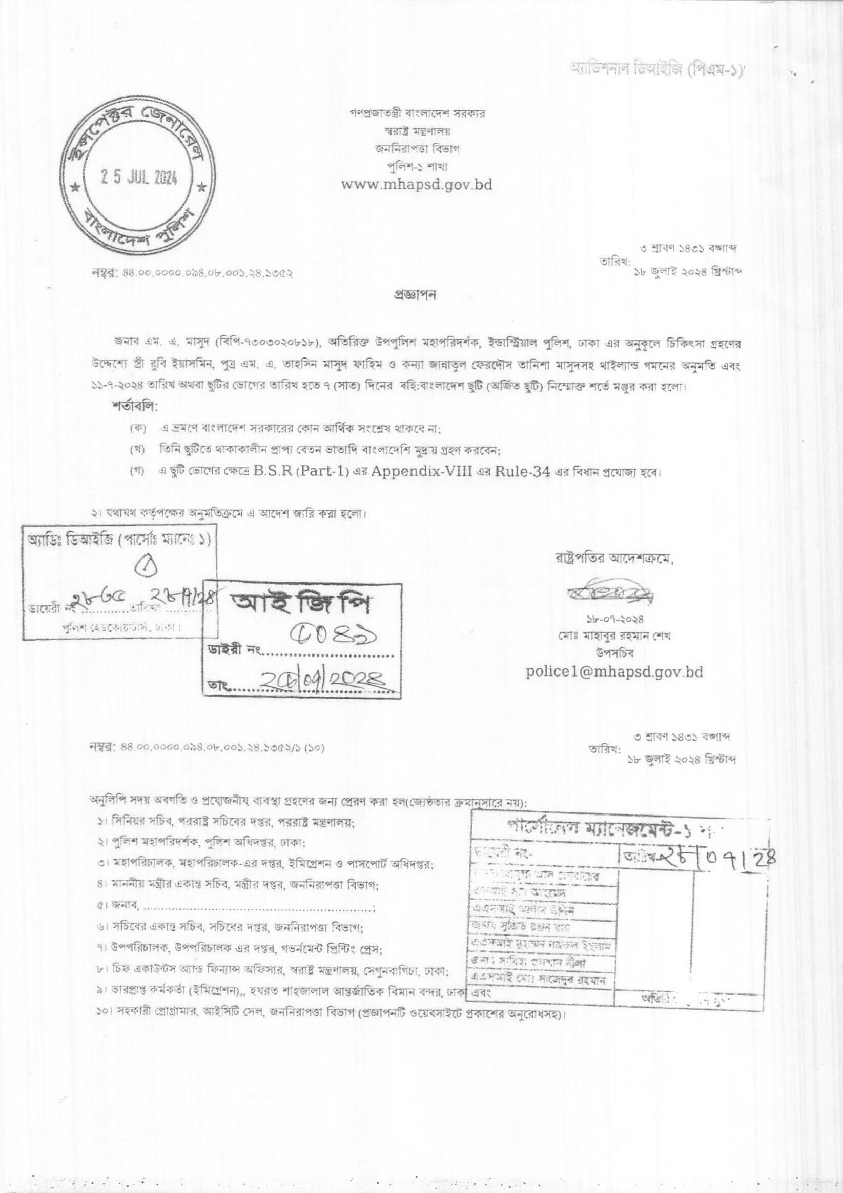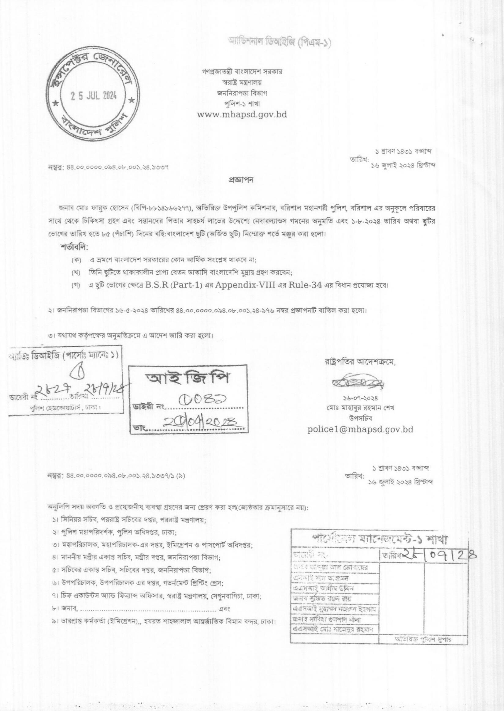 বহিঃ বাংলাদেশ ছুটি, প্রজ্ঞাপন নং- ১৩৩৮, তারিখঃ ১৬/০৭/২০২৪ খ্রিঃ