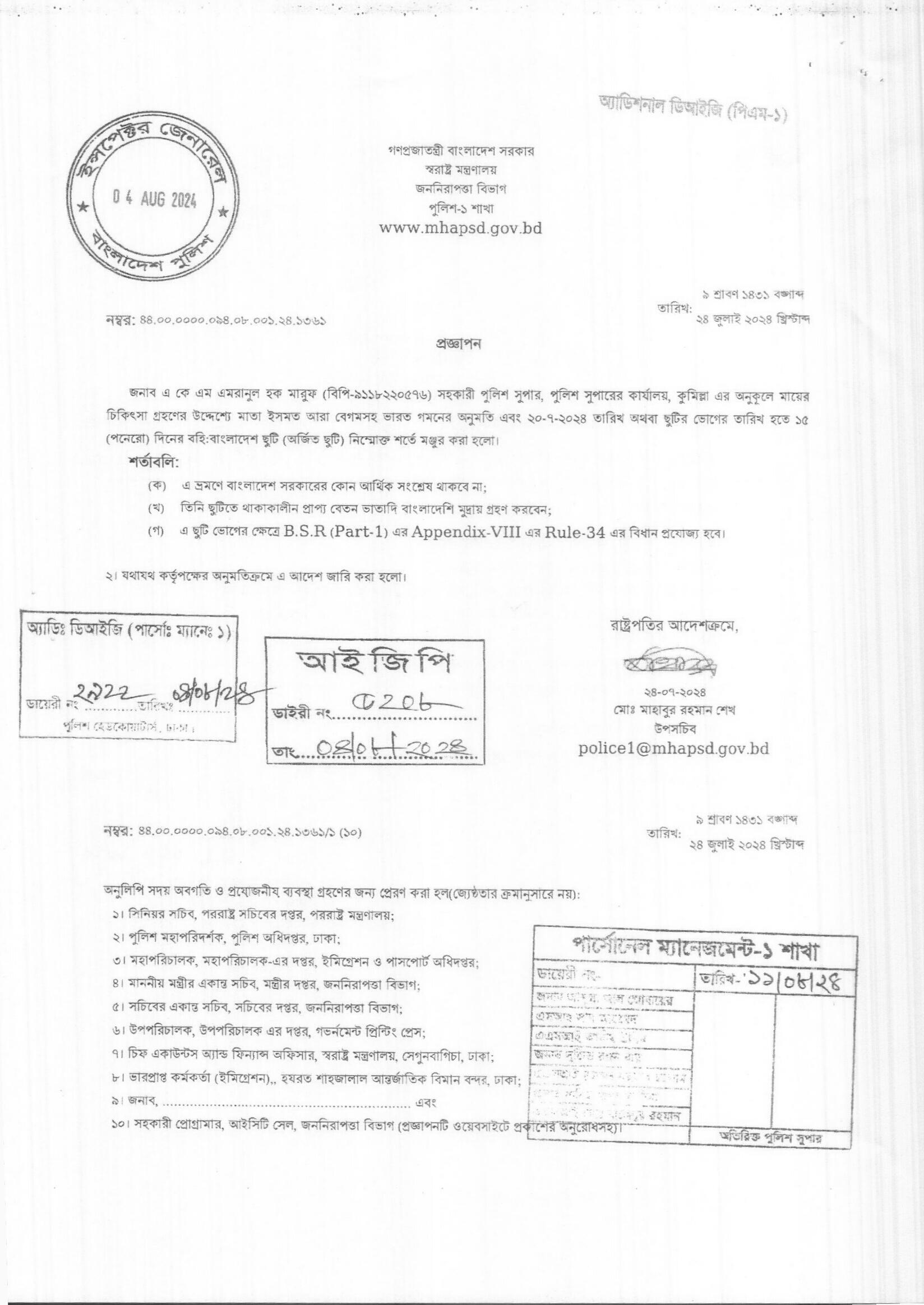বহিঃ বাংলাদেশ ছুটি, প্রজ্ঞাপন নং- ১৩৬১, তারিখঃ ২৪/০৭/২০২৪ খ্রিঃ