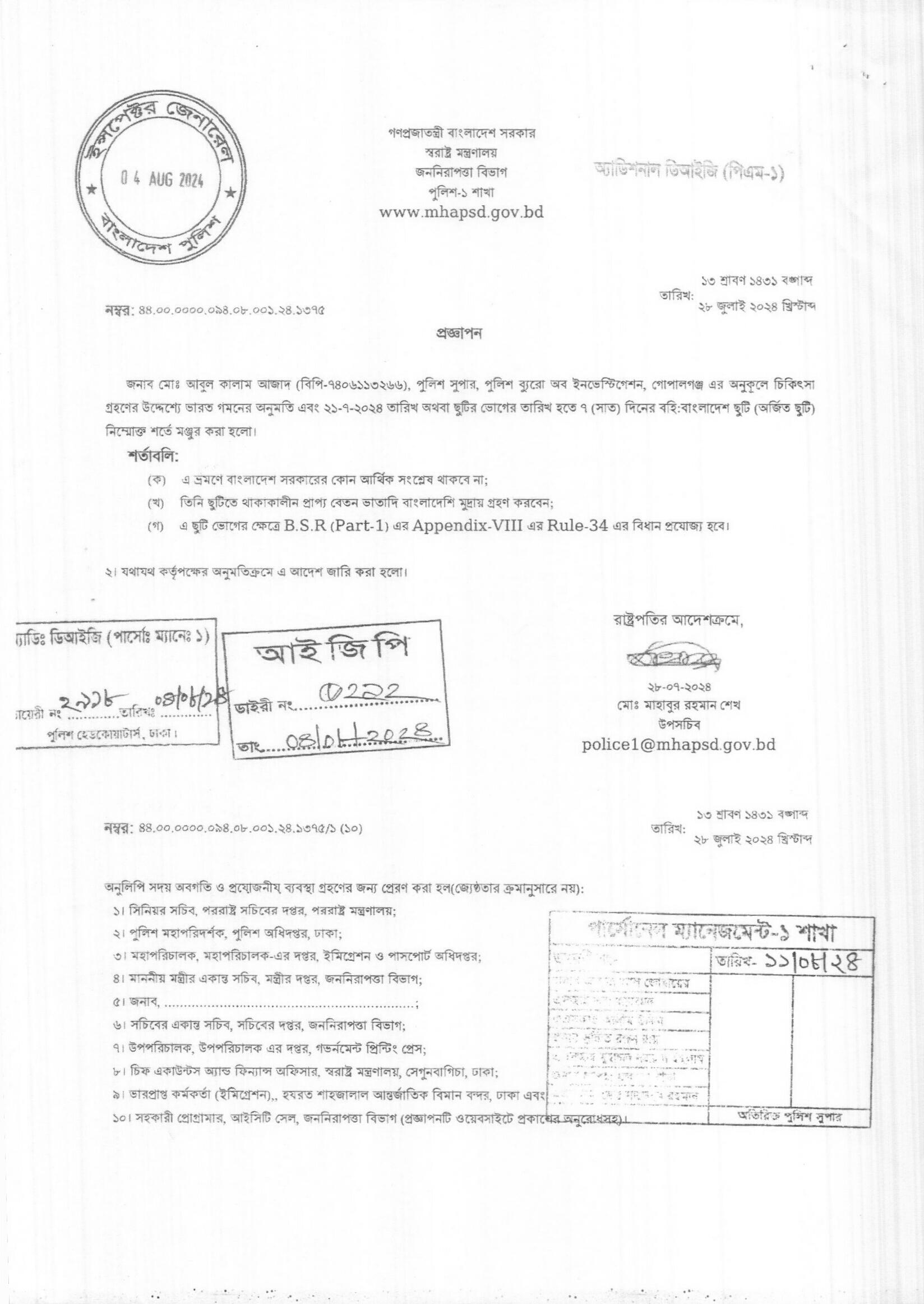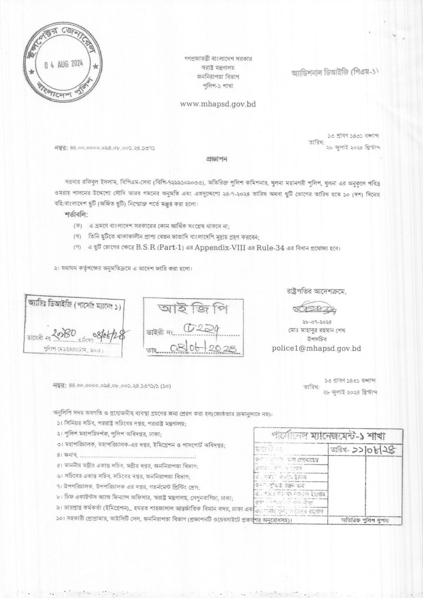 বহিঃ বাংলাদেশ ছুটি, প্রজ্ঞাপন নং- ১৩৭৫, তারিখঃ ২৮/০৭/২০২৪ খ্রিঃ