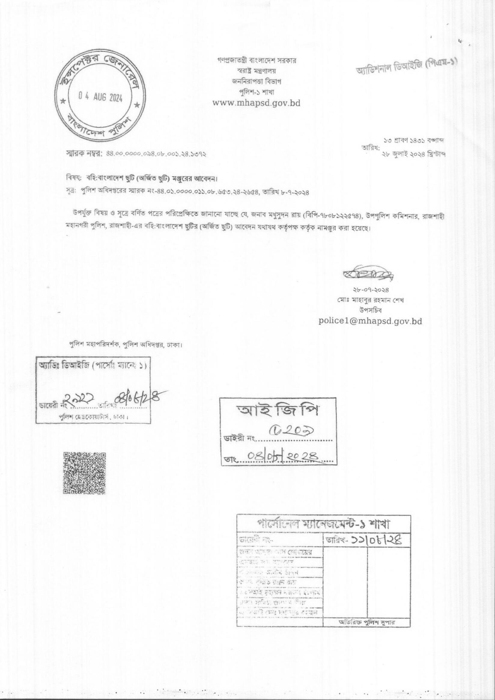 বহিঃ বাংলাদেশ ছুটি না মঞ্জুর, স্মাঃ নং- ১৩৭২, তারিখঃ ২৮/০৭/২০২৪ খ্রিঃ