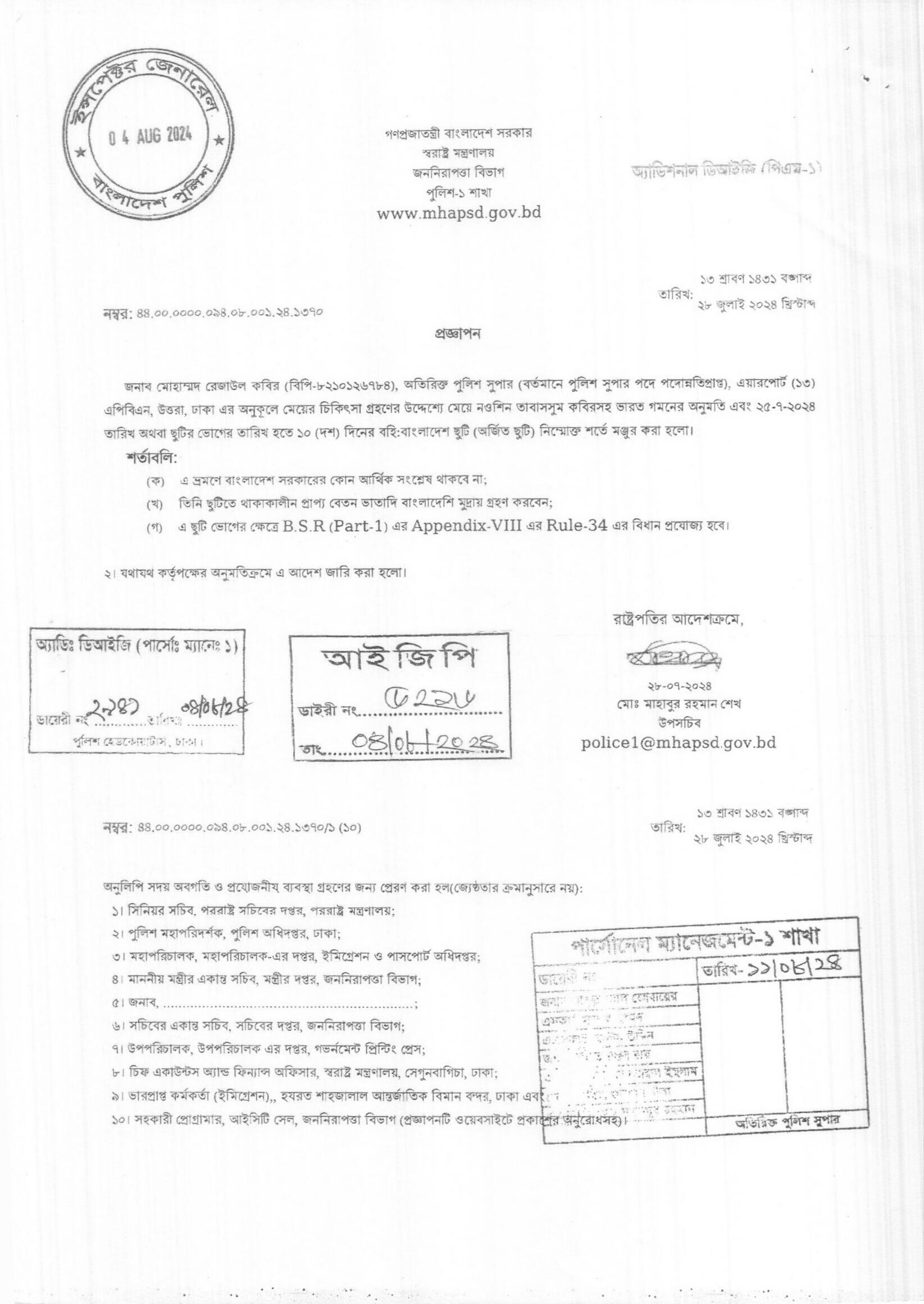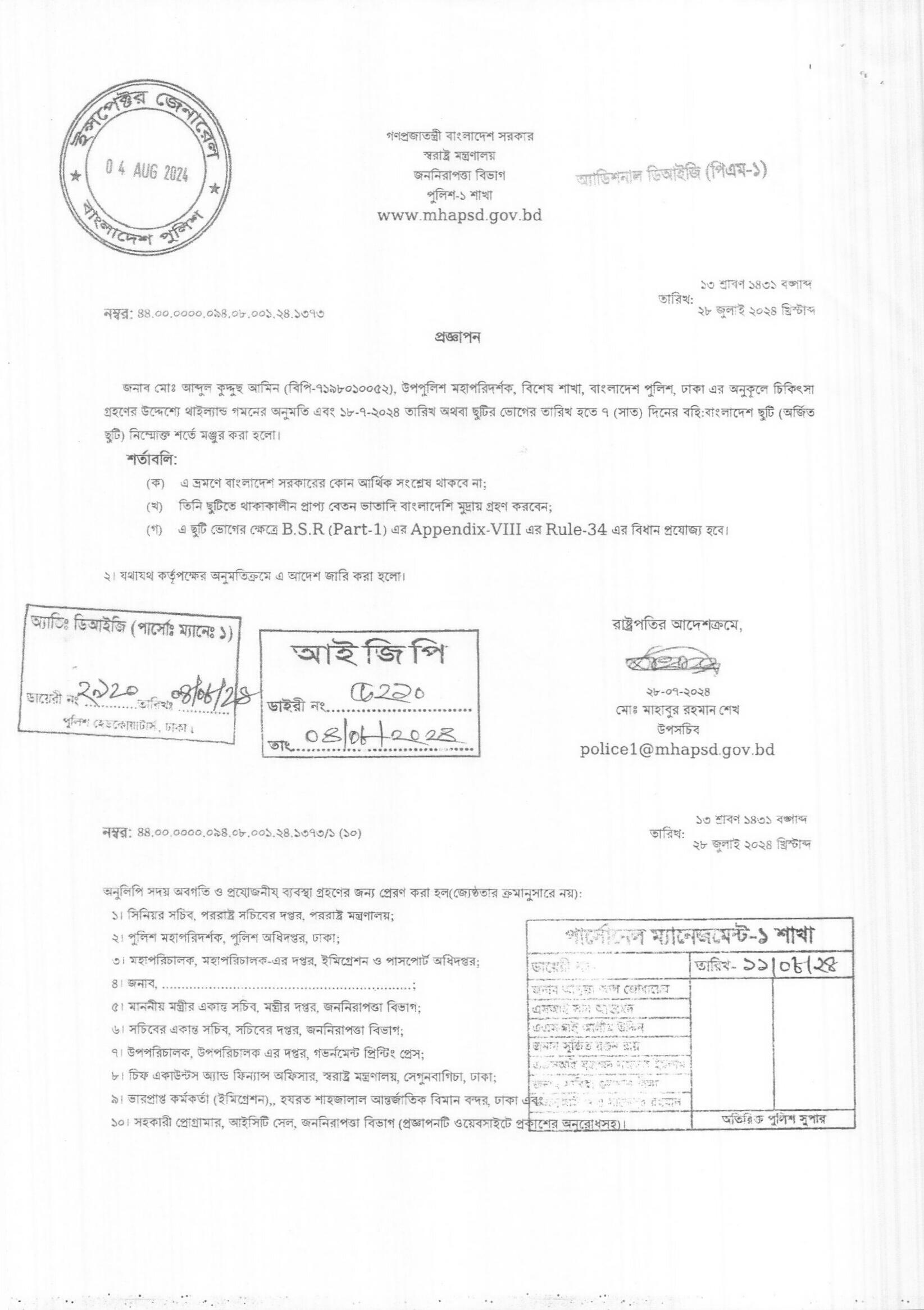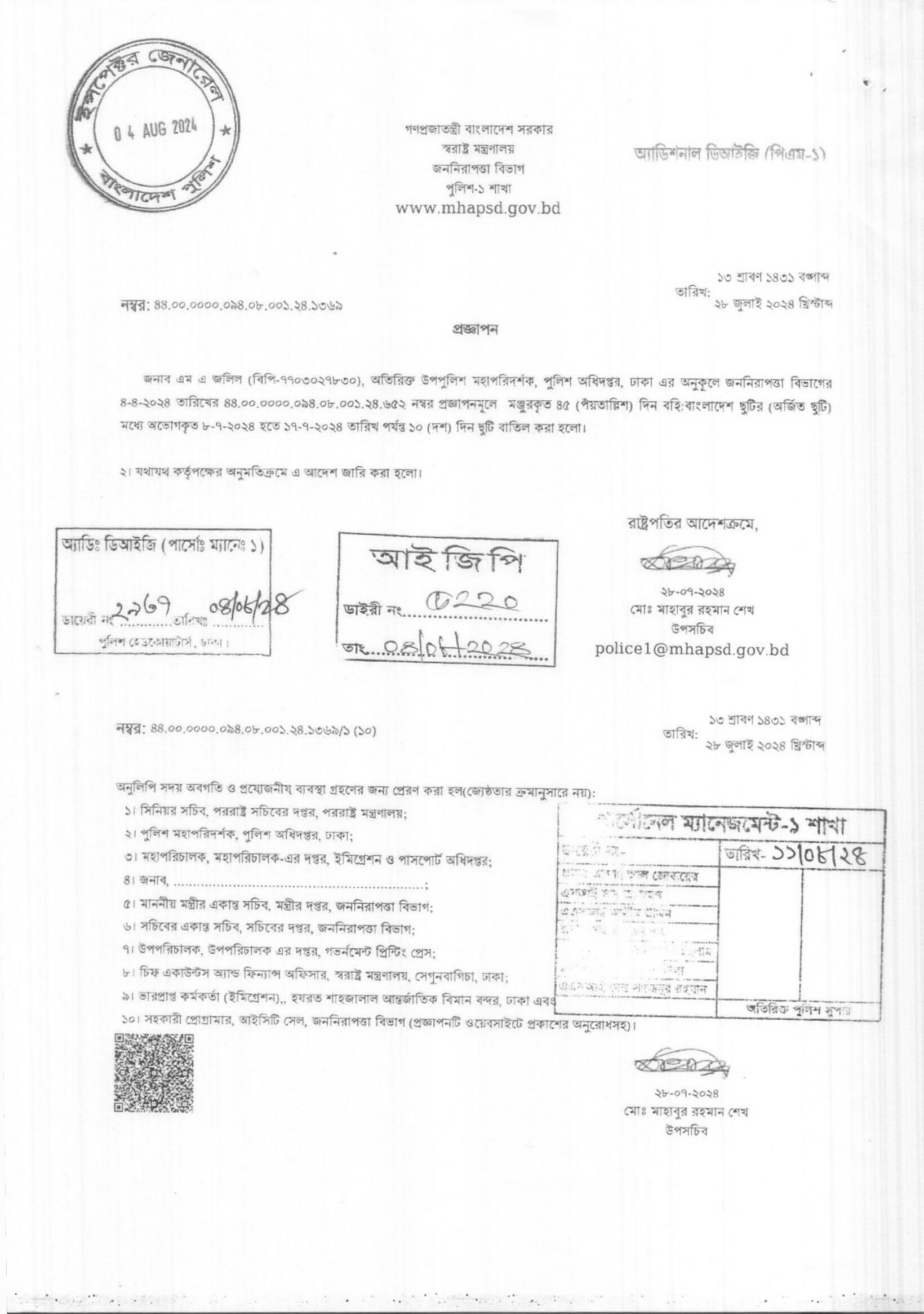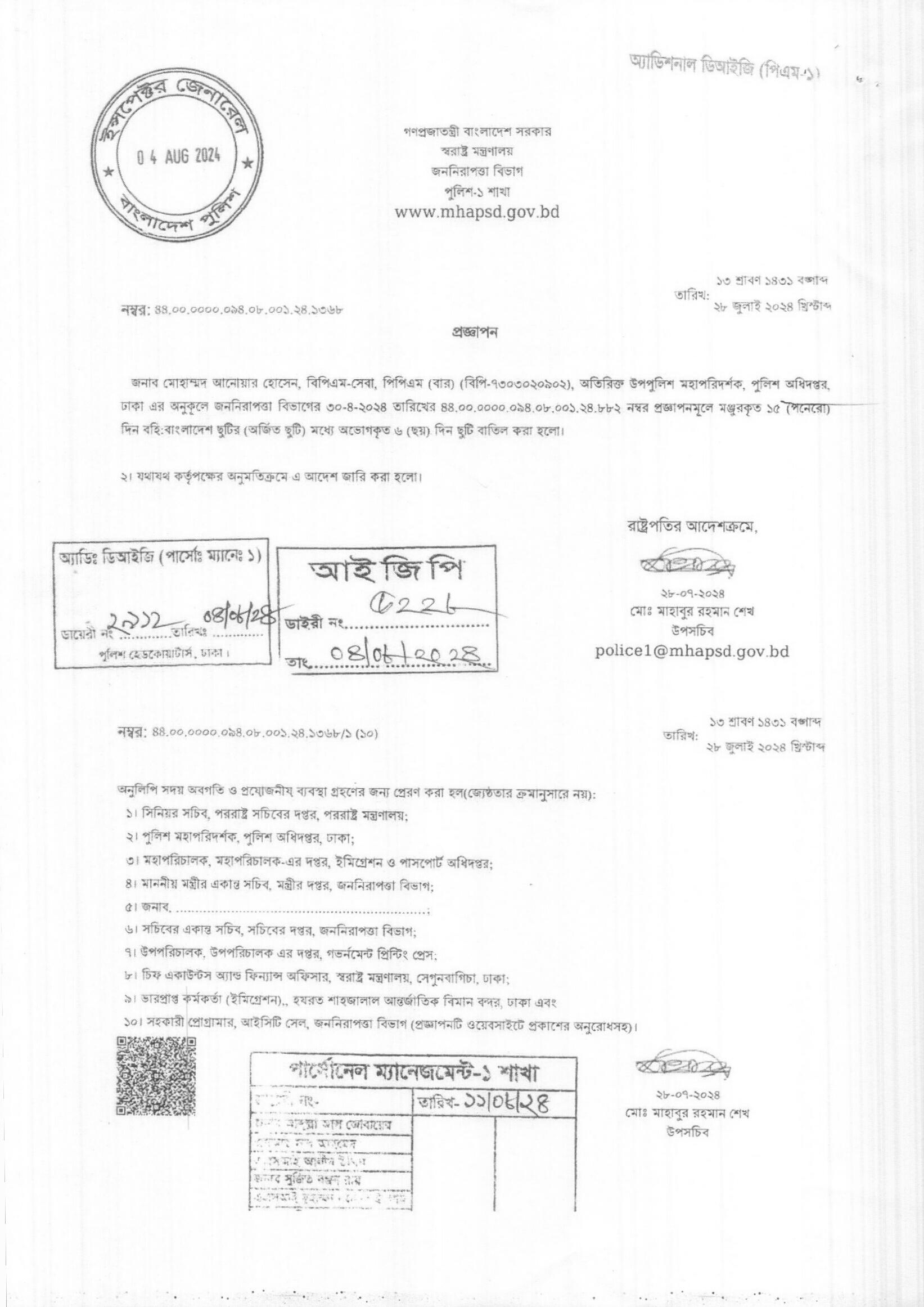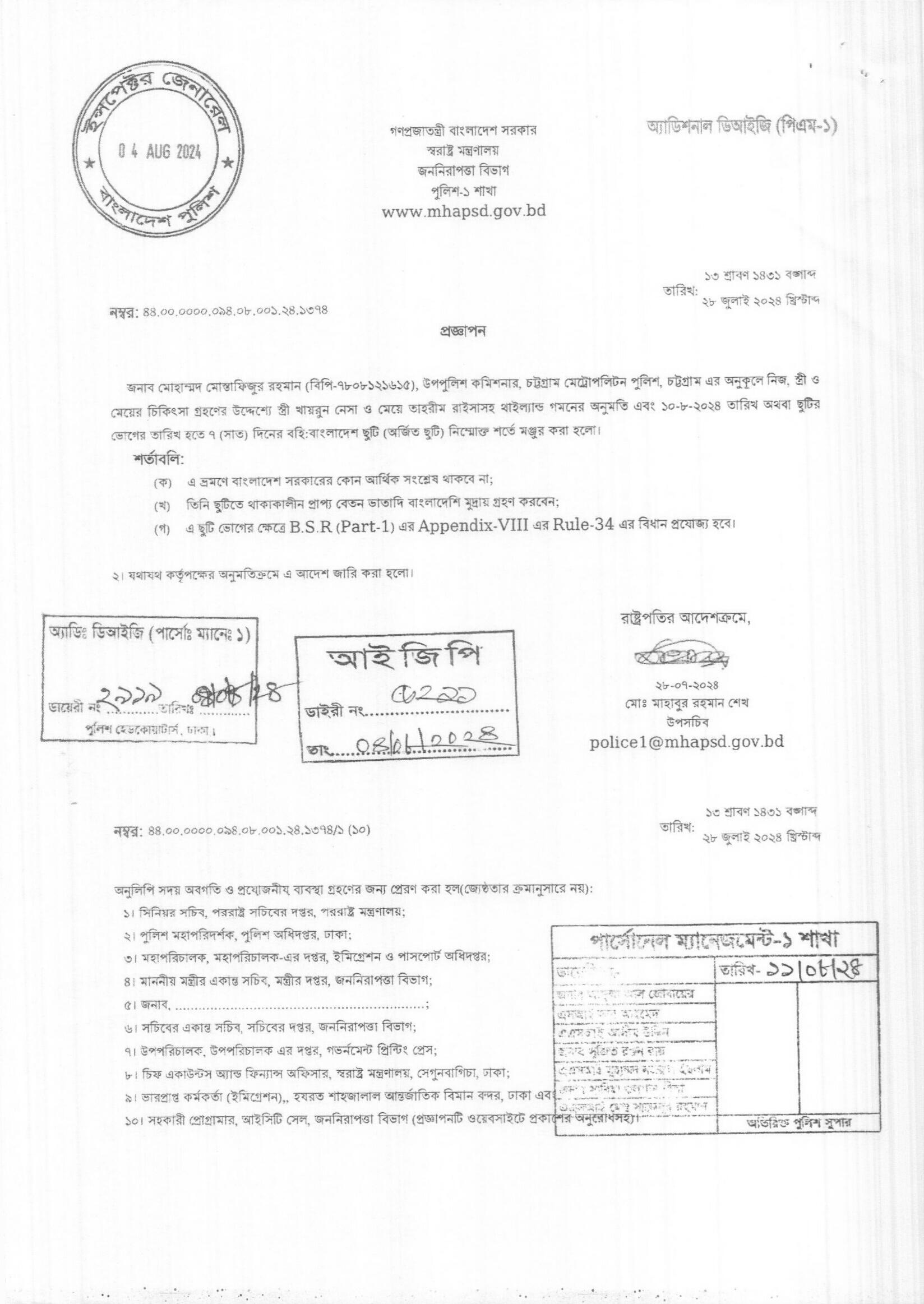 বহিঃ বাংলাদেশ ছুটি, প্রজ্ঞাপন নং- ১৩৬৯, তারিখঃ ২৮/০৭/২০২৪ খ্রিঃ