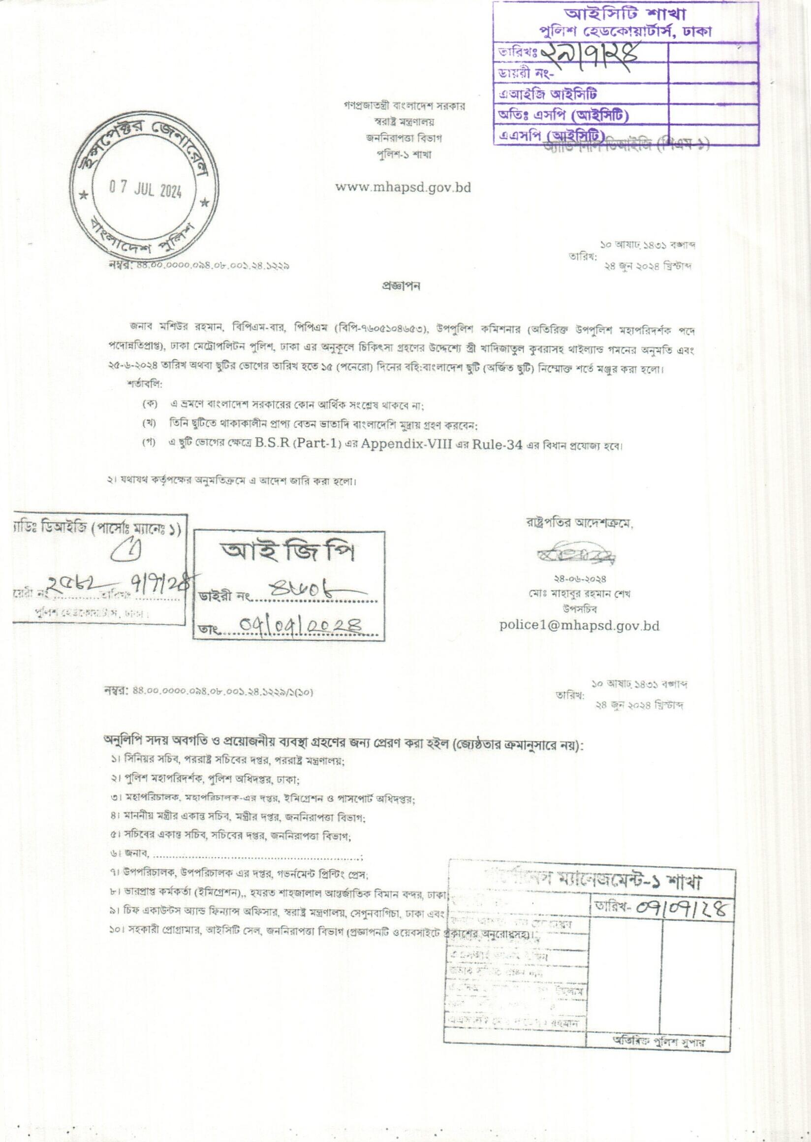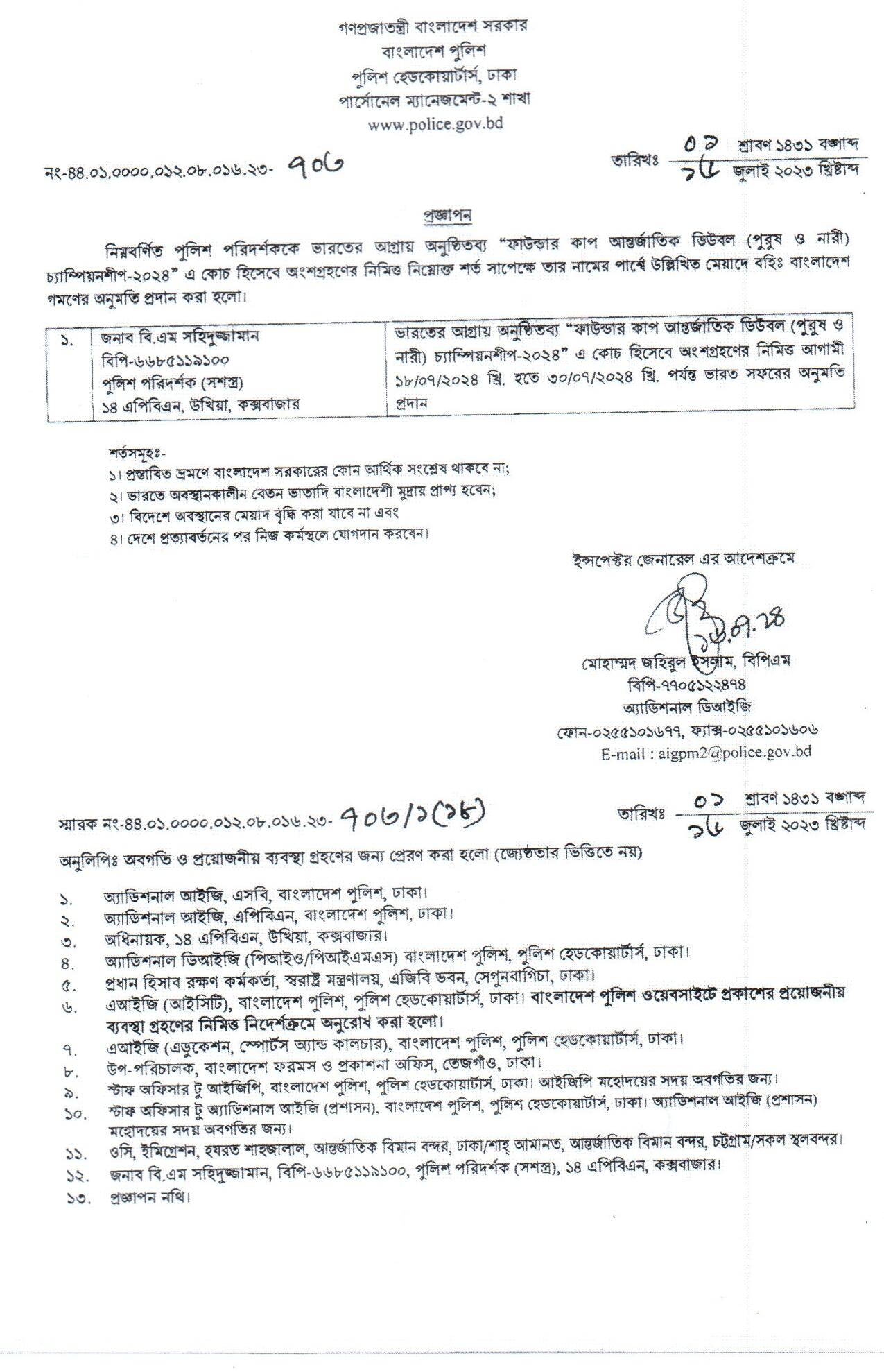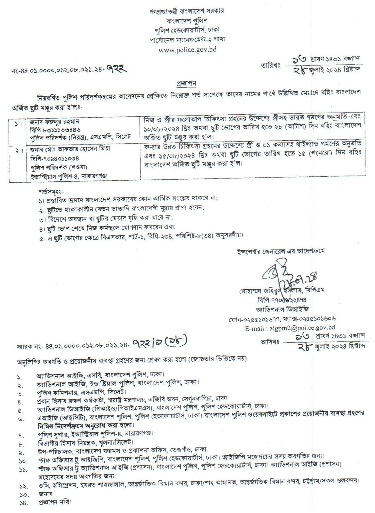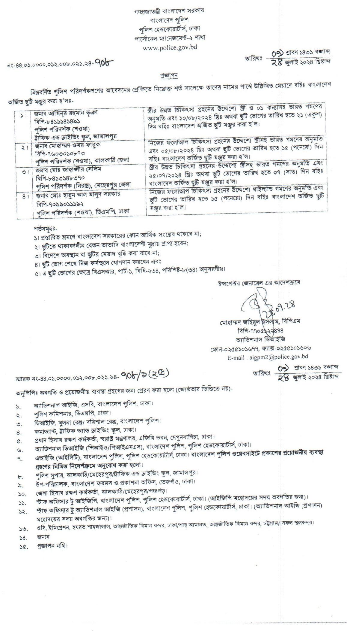 বহিঃ বাংলাদেশ গমন, প্রজ্ঞাপন নং- ৭০৩, তারিখঃ ১৬/০৭/২০২৪ খ্রিঃ।