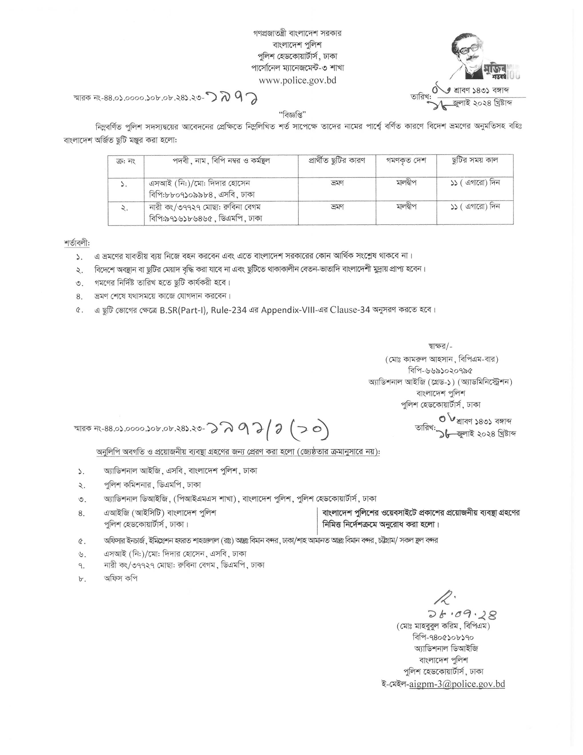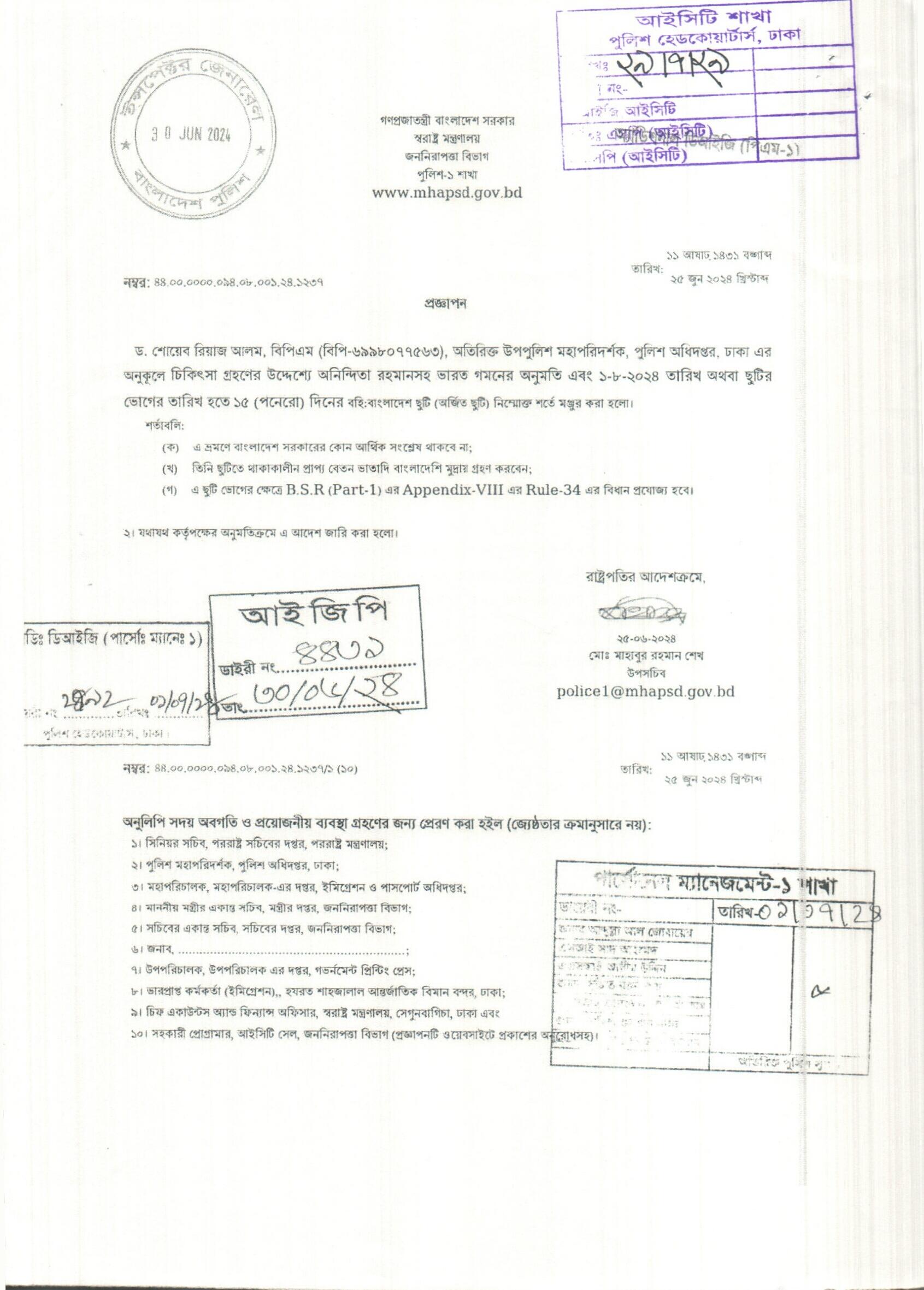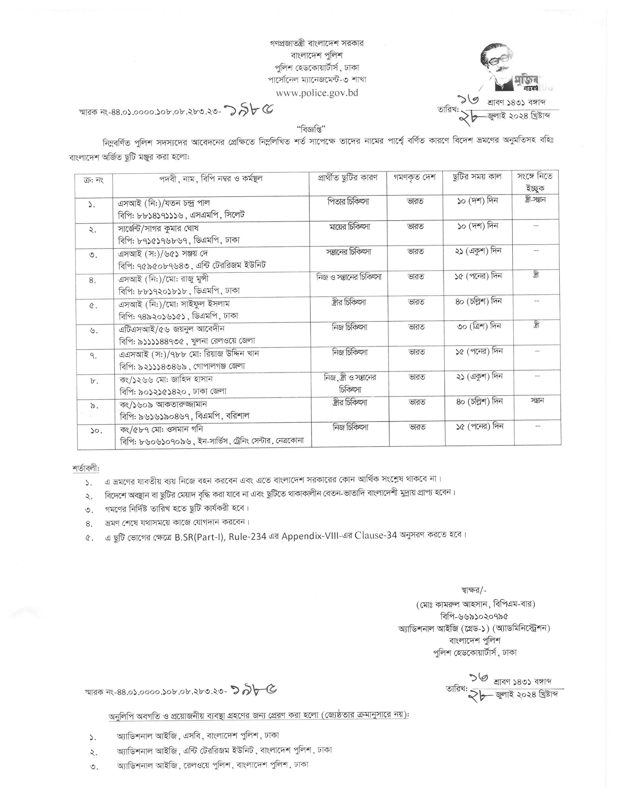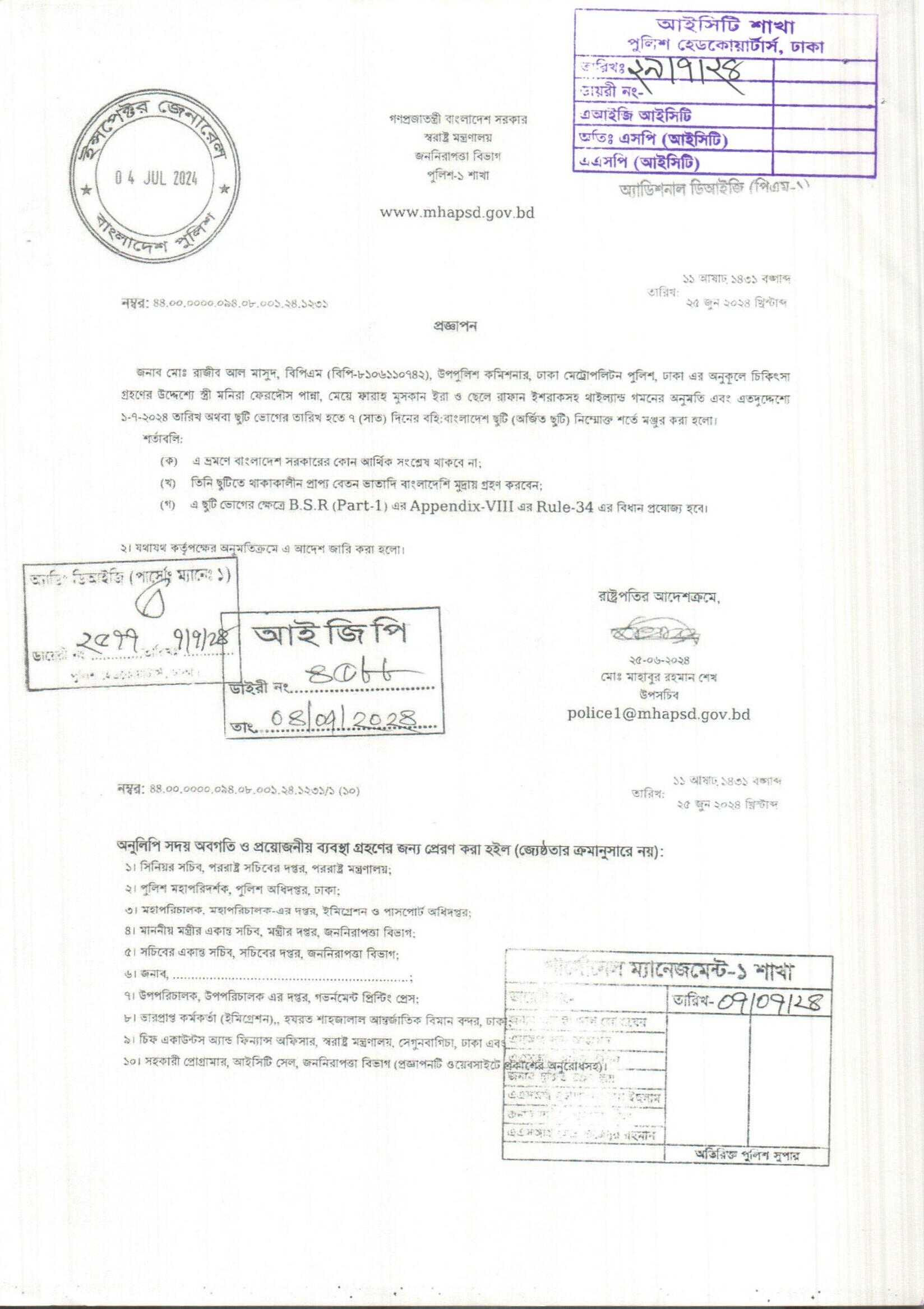বহিঃ বাংলাদেশ গমন, প্রজ্ঞাপন নং- ৭০৩, তারিখঃ ১৬/০৭/২০২৪ খ্রিঃ।
