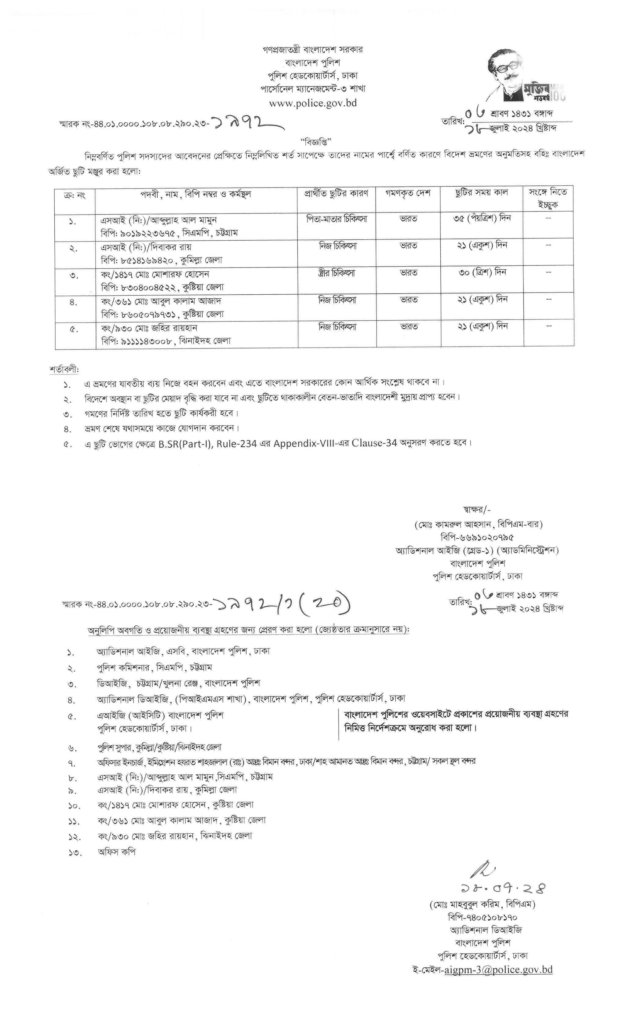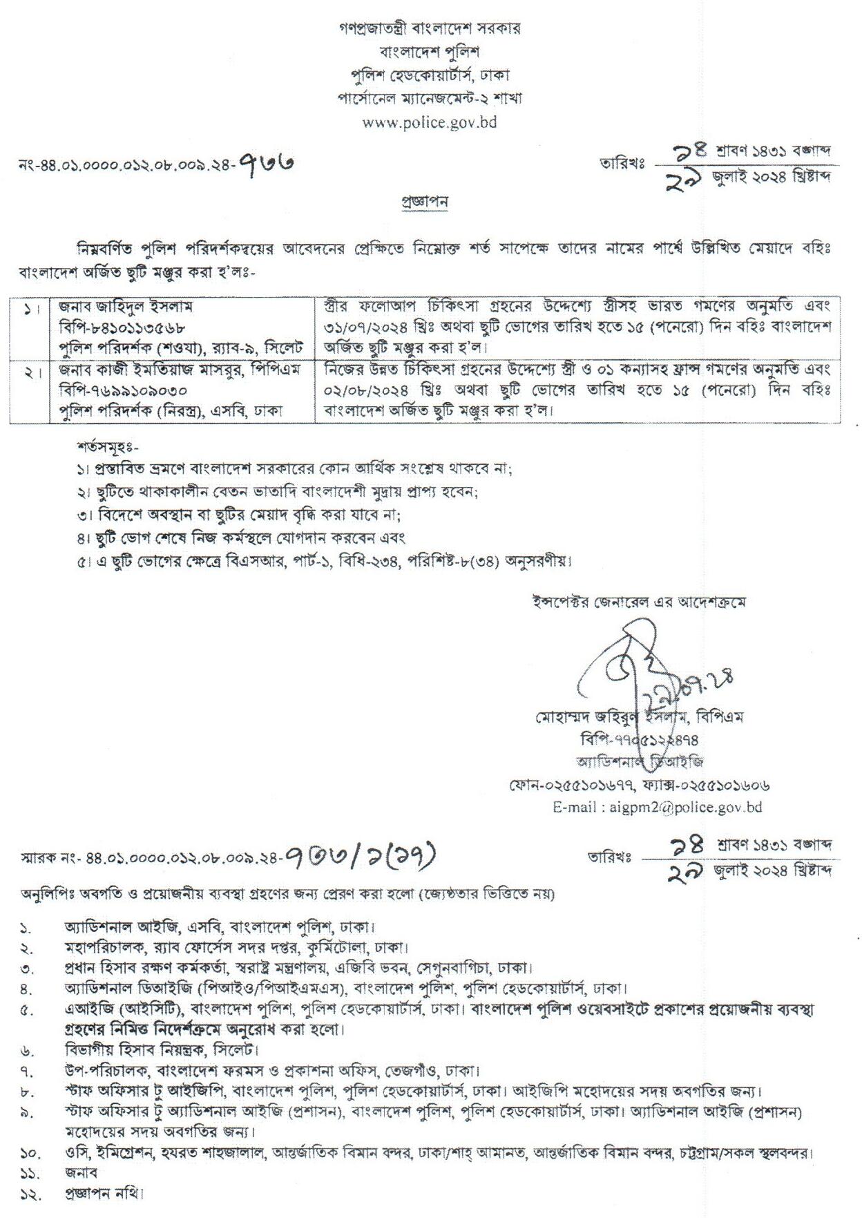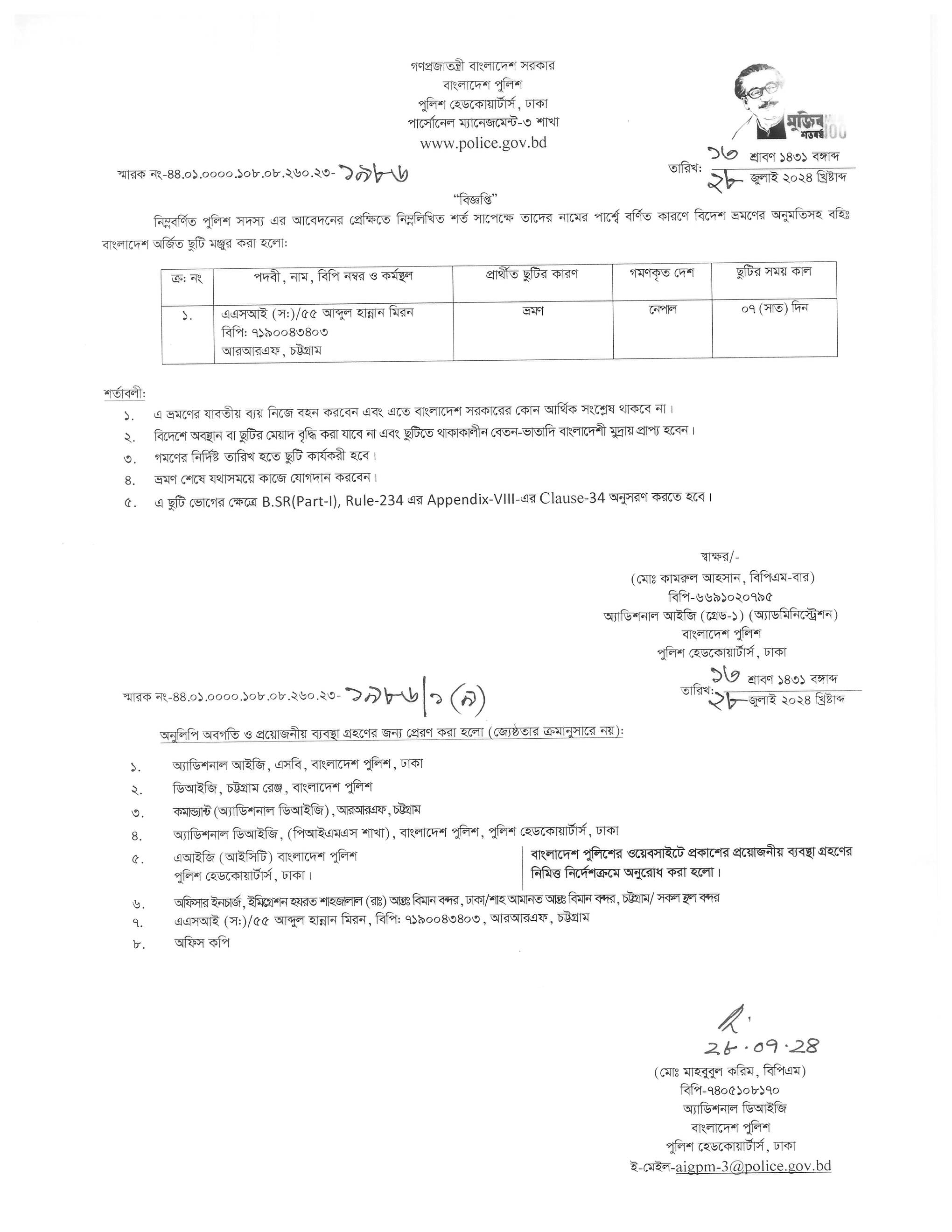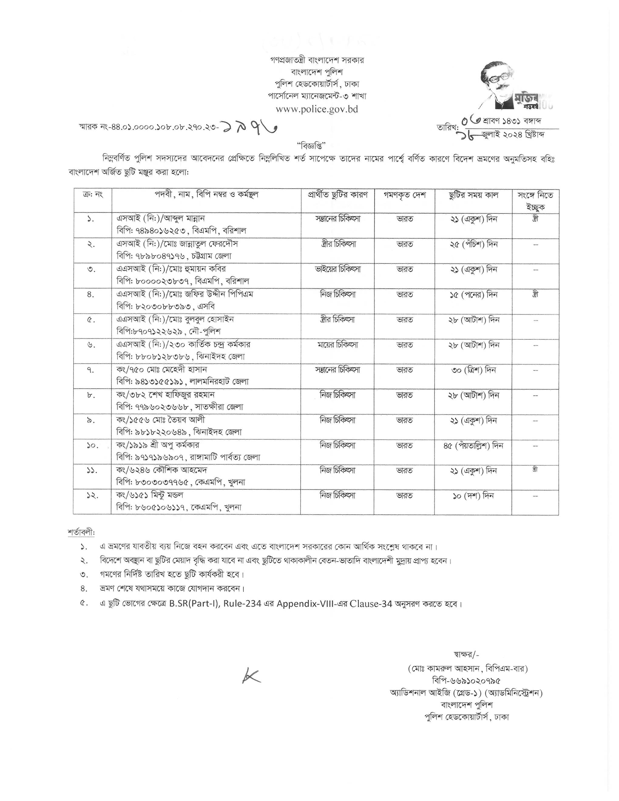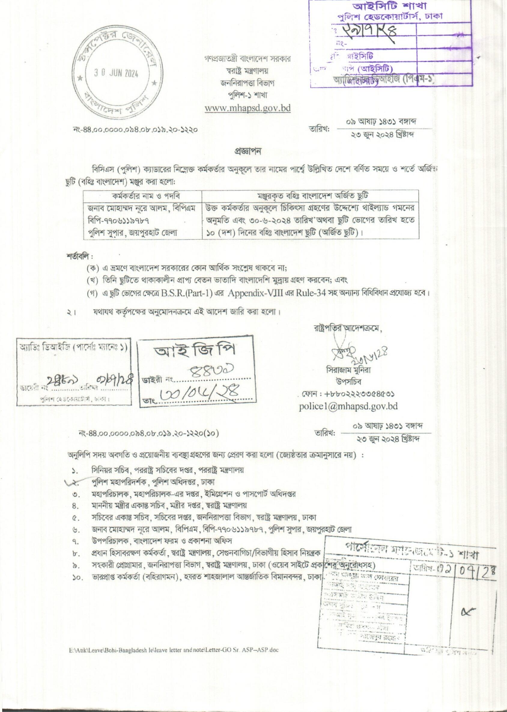 বহিঃ বাংলাদেশ গমন, প্রজ্ঞাপন নং- ৭০৩, তারিখঃ ১৬/০৭/২০২৪ খ্রিঃ।