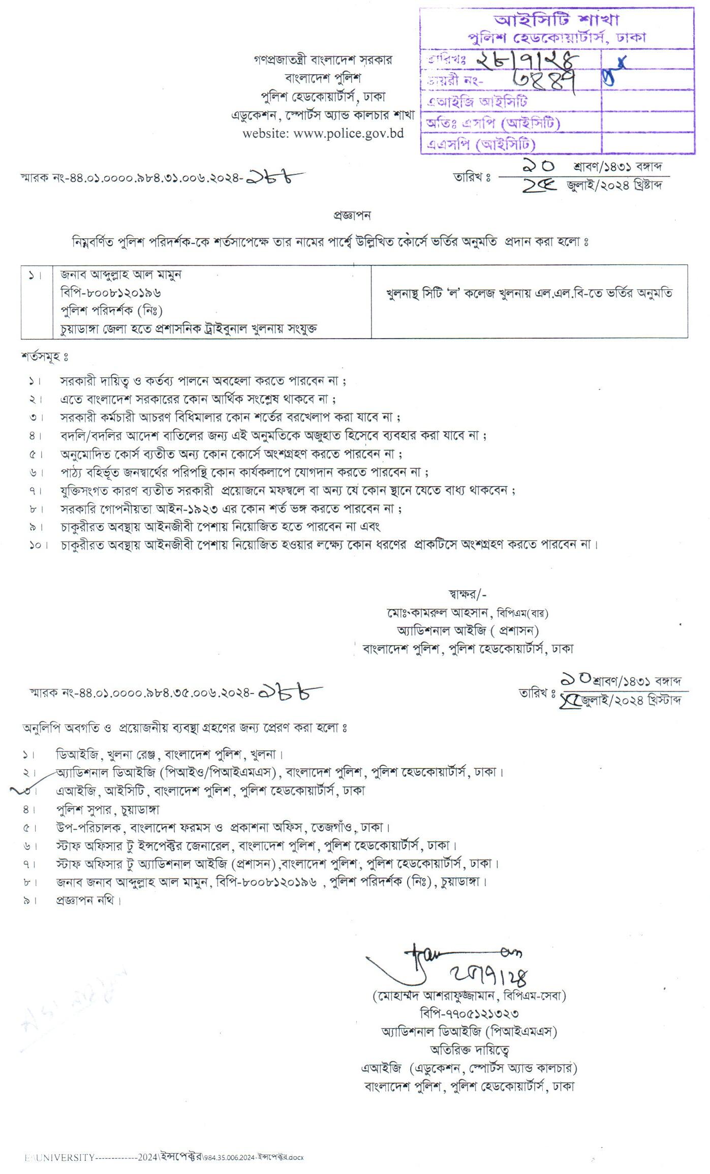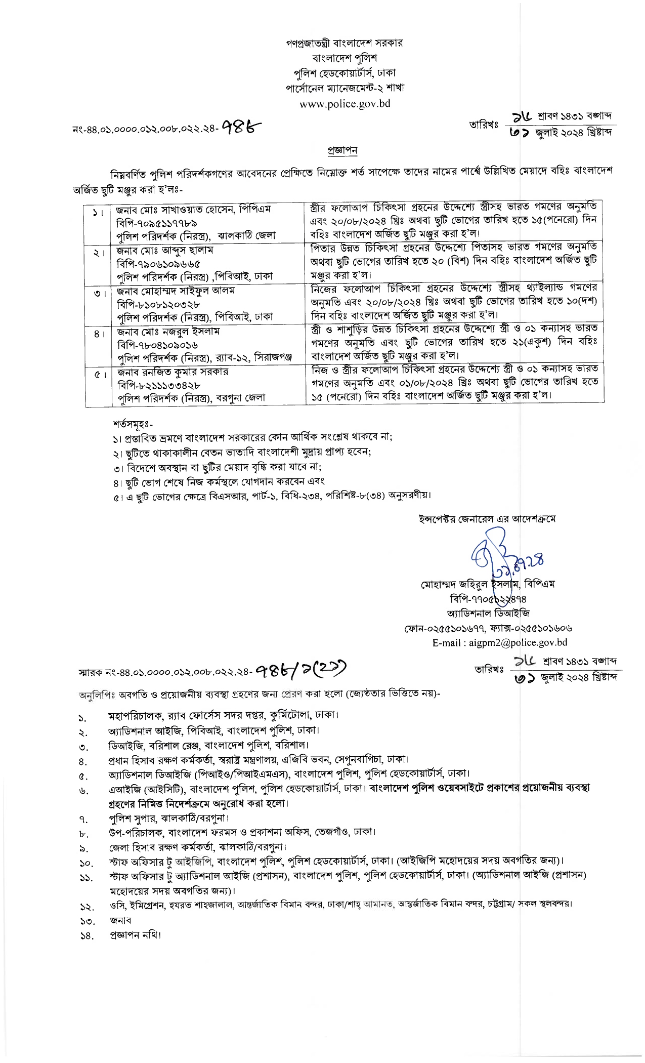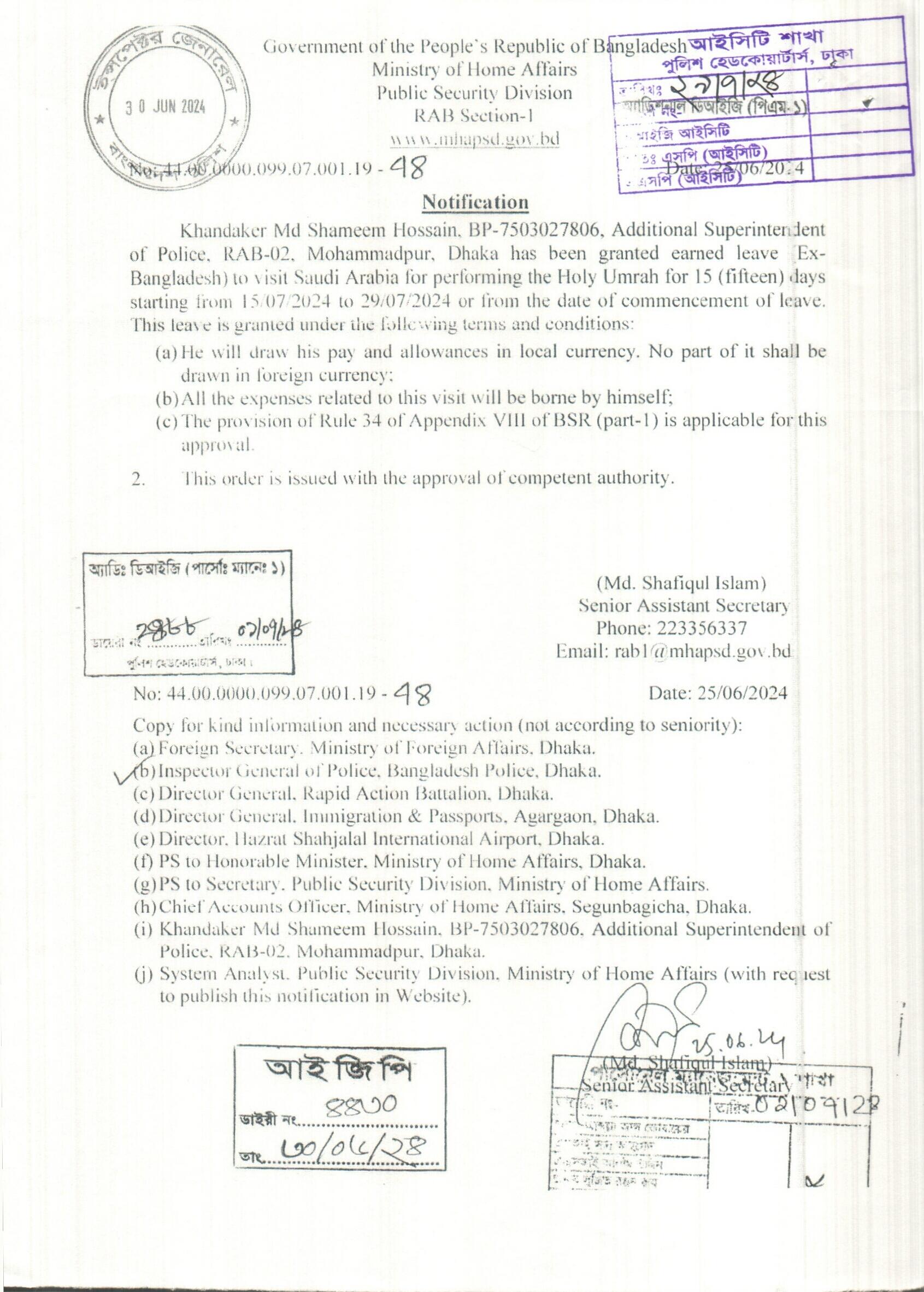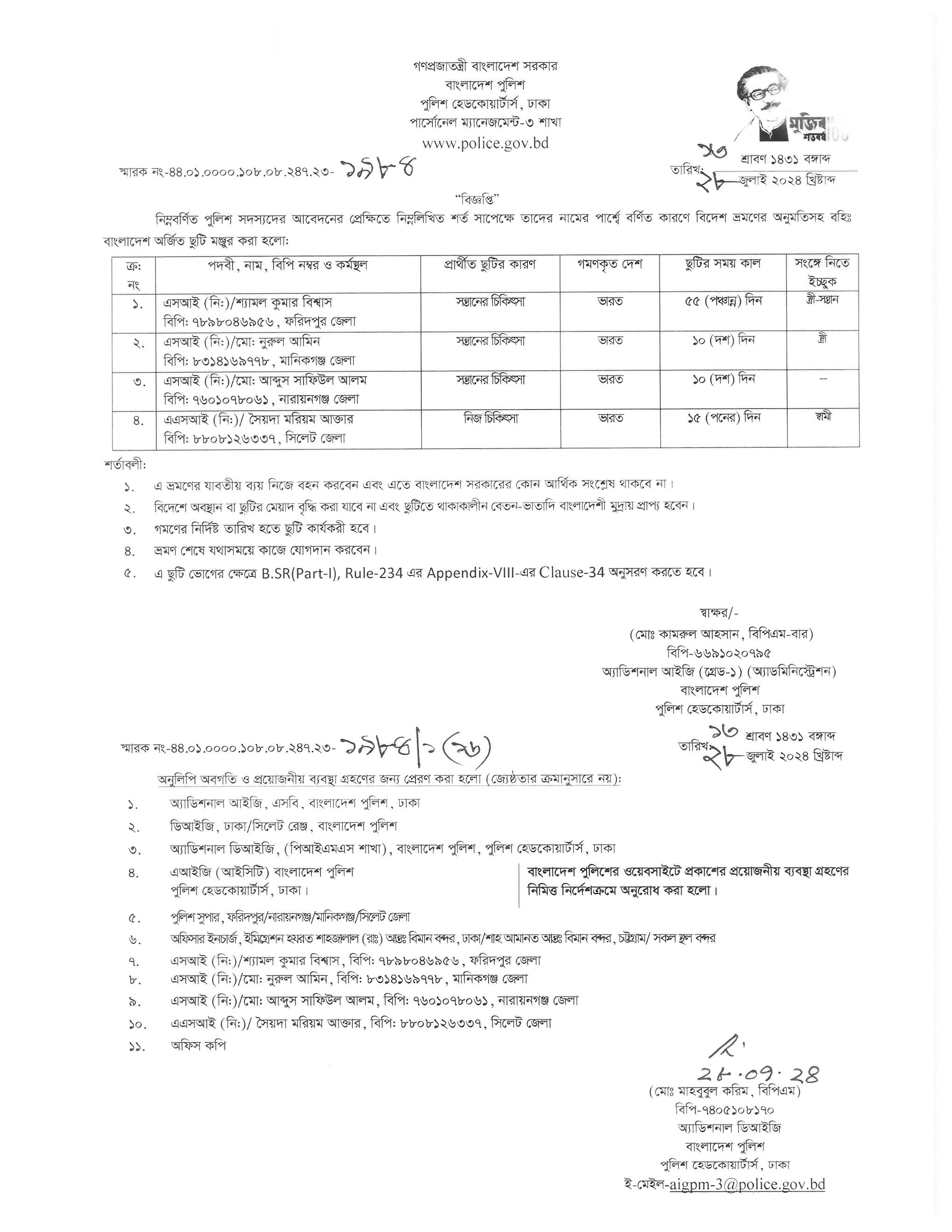 বহিঃ বাংলাদেশ গমন, প্রজ্ঞাপন নং- ৭০৩, তারিখঃ ১৬/০৭/২০২৪ খ্রিঃ।