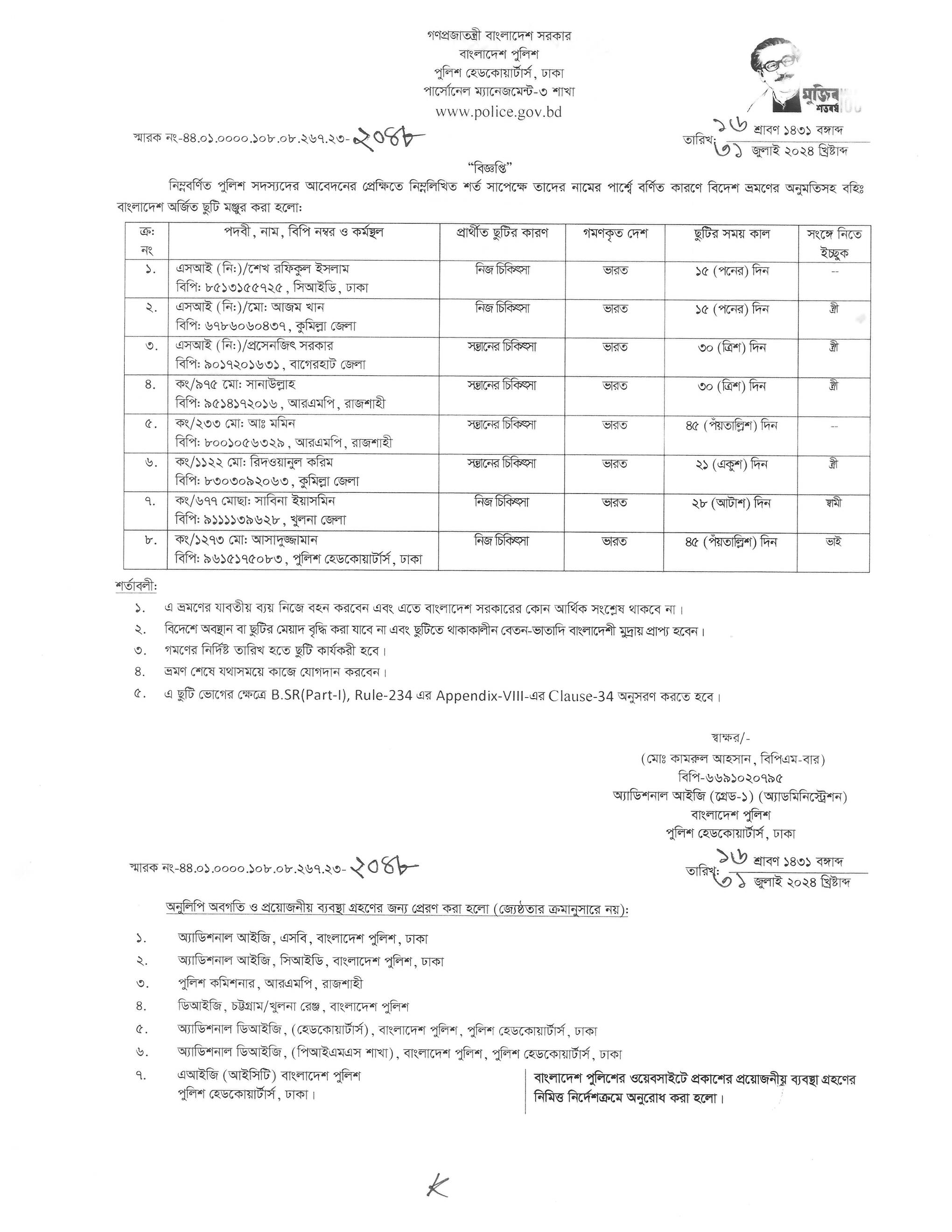 বহিঃ বাংলাদেশ ছুটি, বিজ্ঞপ্তি নং- ২০৪৮ , তারিখঃ ৩১/০৭/২০২৪ খ্রিঃ।