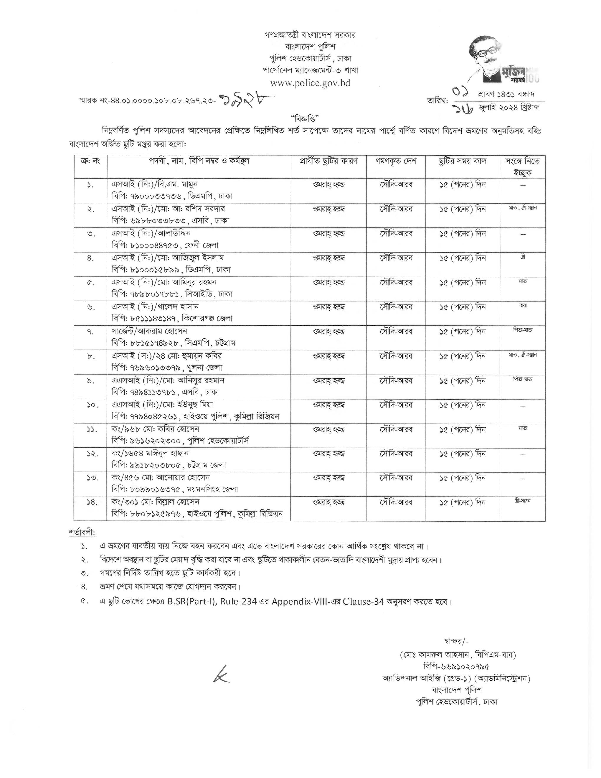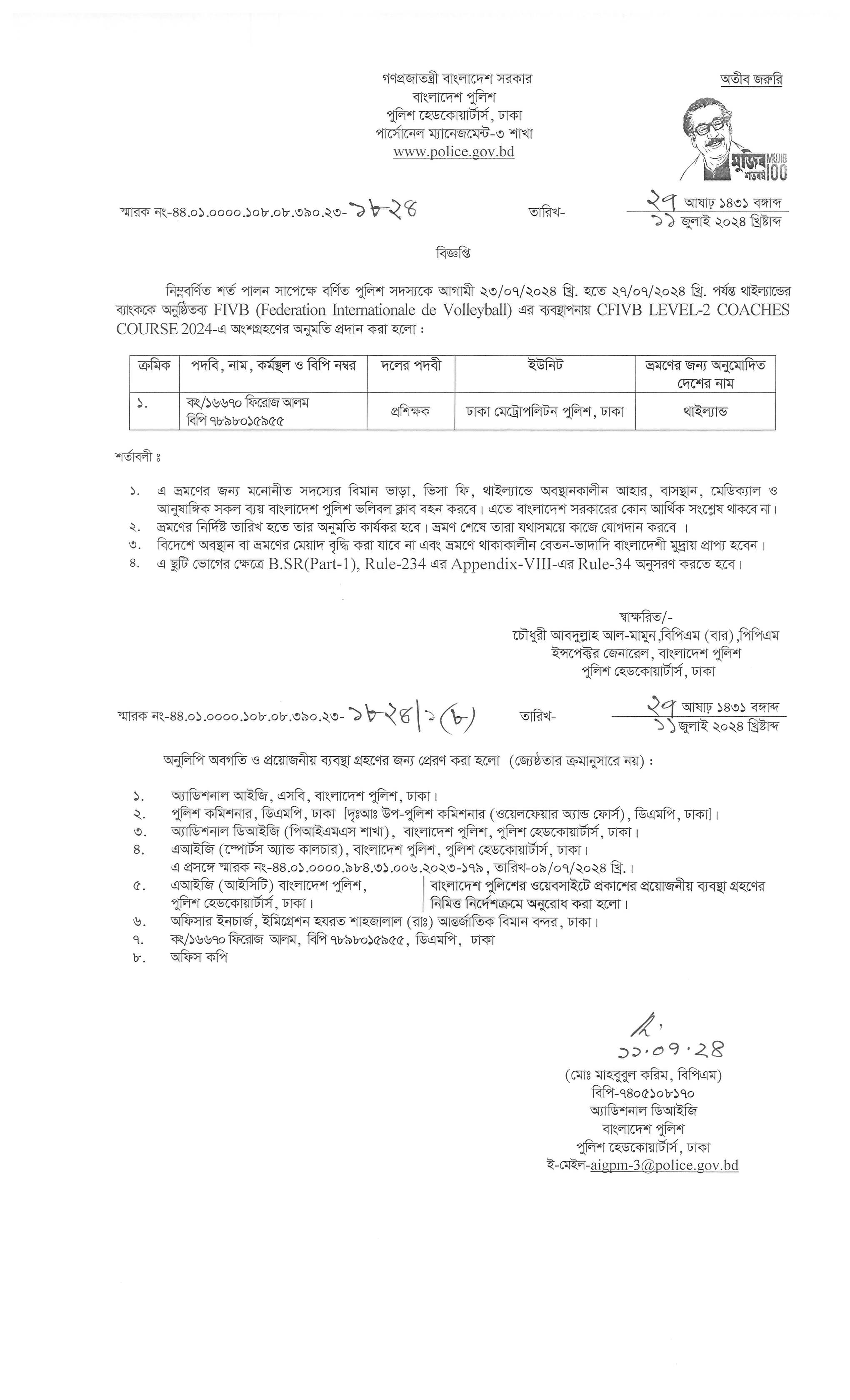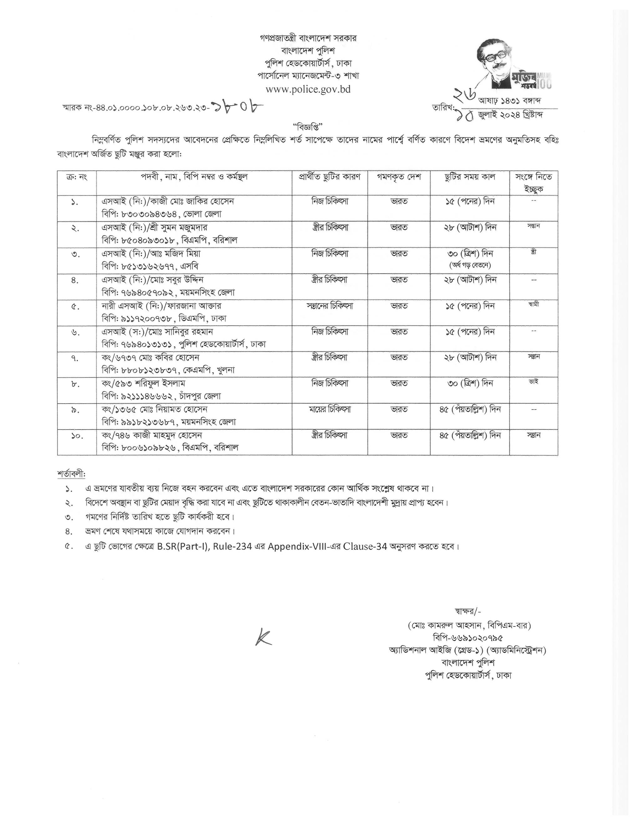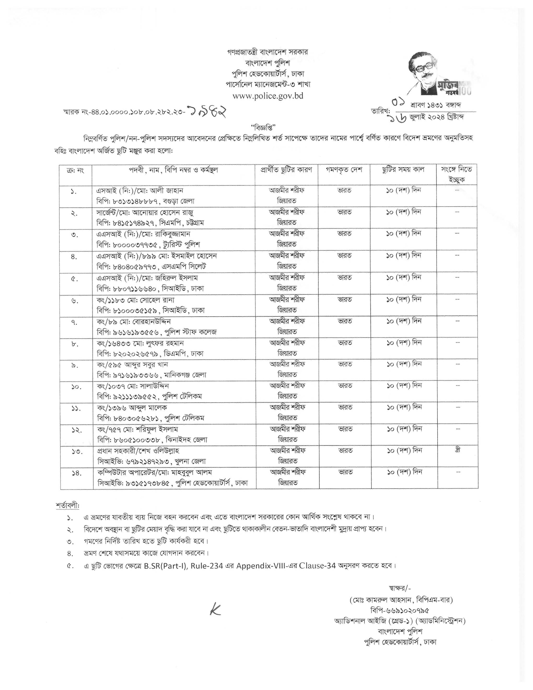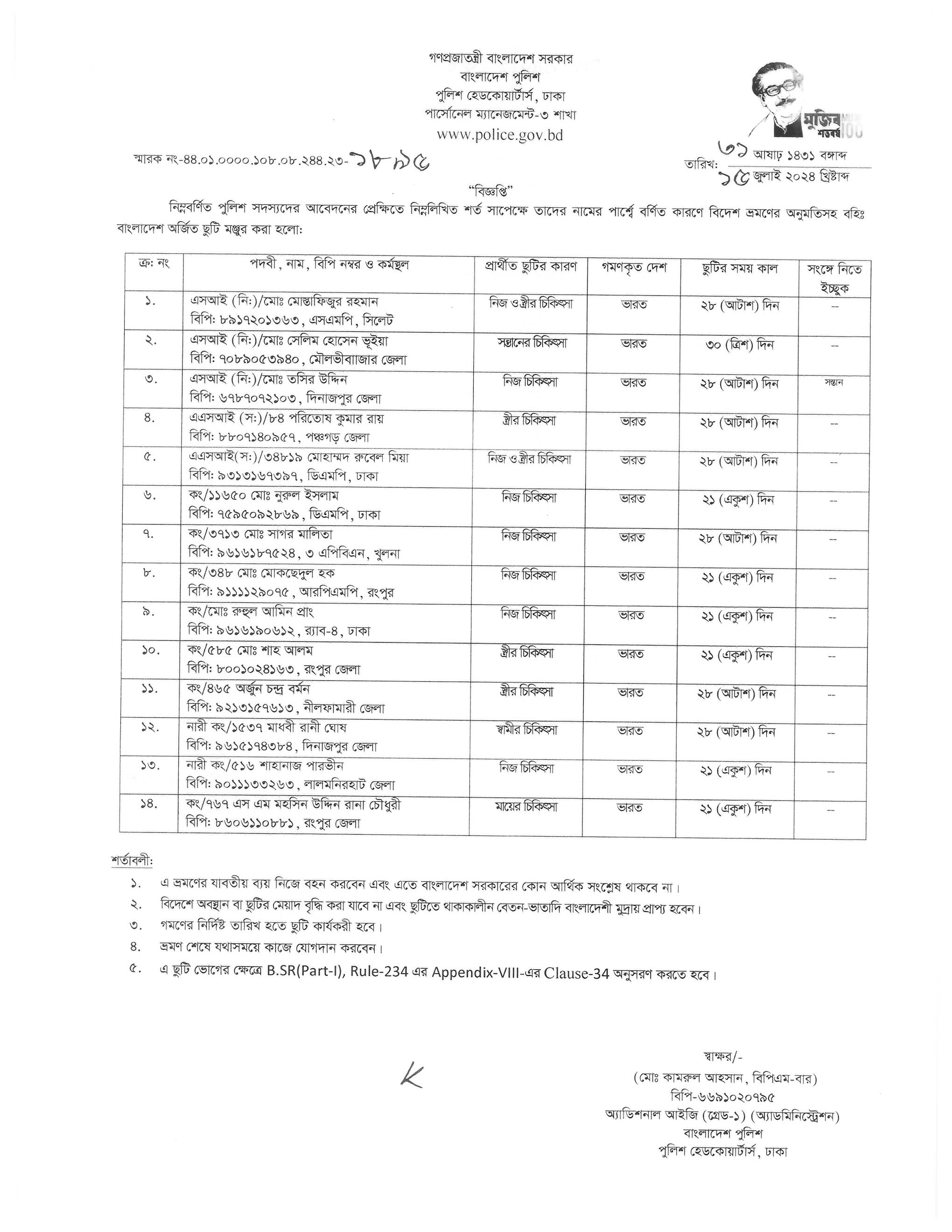বহিঃ বাংলাদেশ গমন, বিজ্ঞপ্তি নং- ১৭৭৭(পৃ-২) , তারিখঃ ০৯/০৭/২০২৪ খ্রিঃ।
