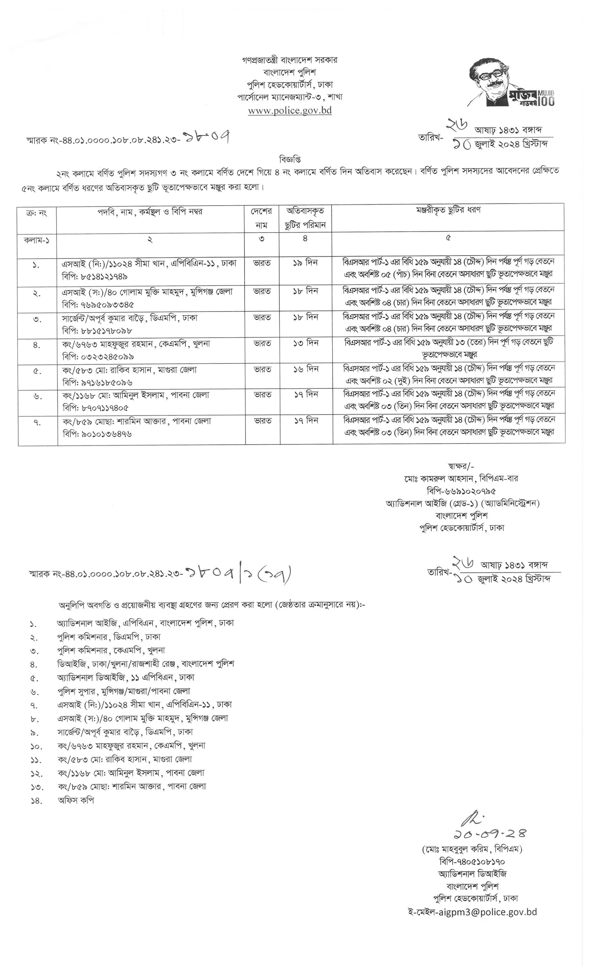 বহিঃ বাংলাদেশ ছুটি, বিজ্ঞপ্তি নং- ১৯২৮ , তারিখঃ ১৬/০৭/২০২৪ খ্রিঃ।