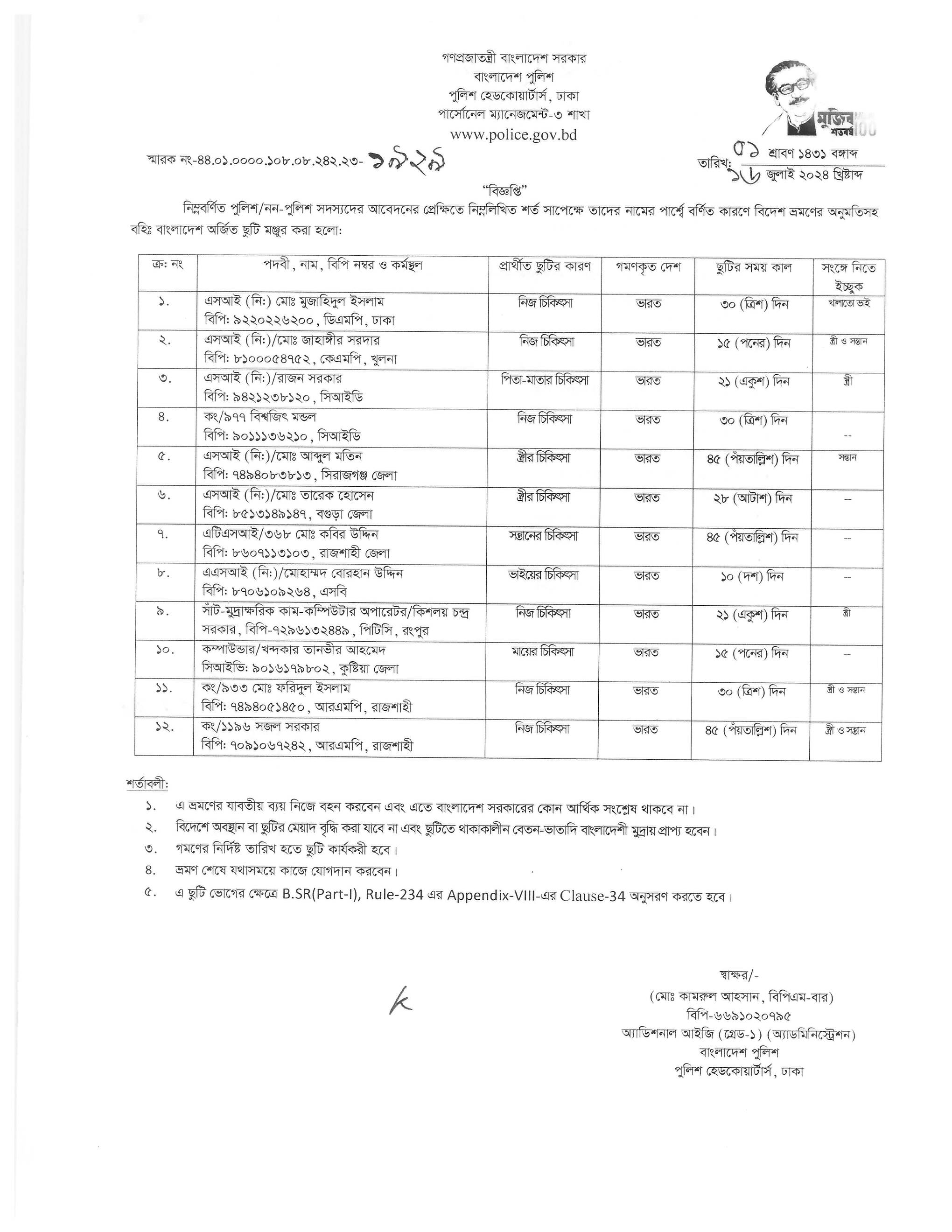 বহিঃ বাংলাদেশ ছুটি, বিজ্ঞপ্তি নং- ১৮০৮ , তারিখঃ ১০/০৭/২০২৪ খ্রিঃ।