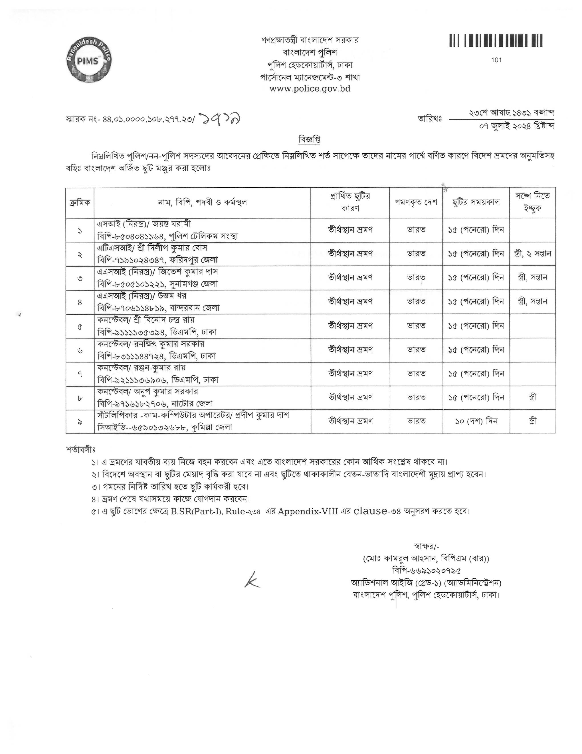 বহিঃ বাংলাদেশ ছুটি, বিজ্ঞপ্তি নং- ১৭১৭ , তারিখঃ ০৭/০৭/২০২৪ খ্রিঃ।