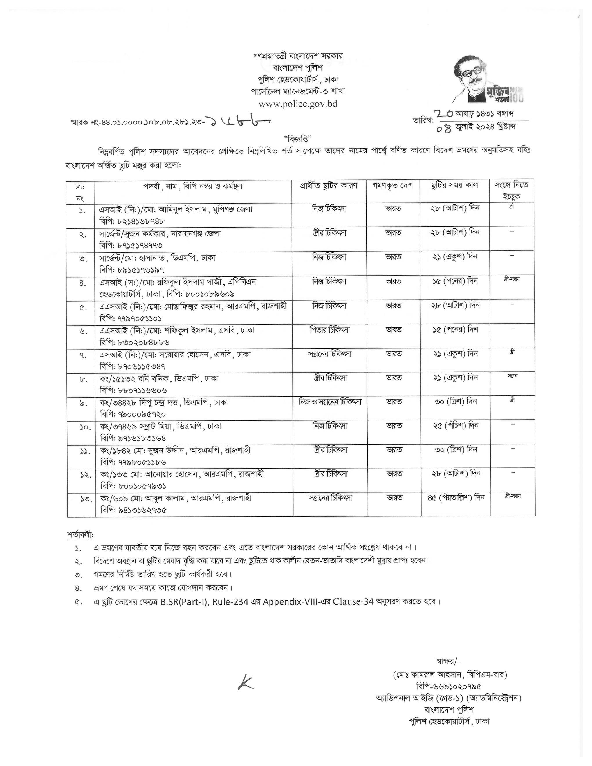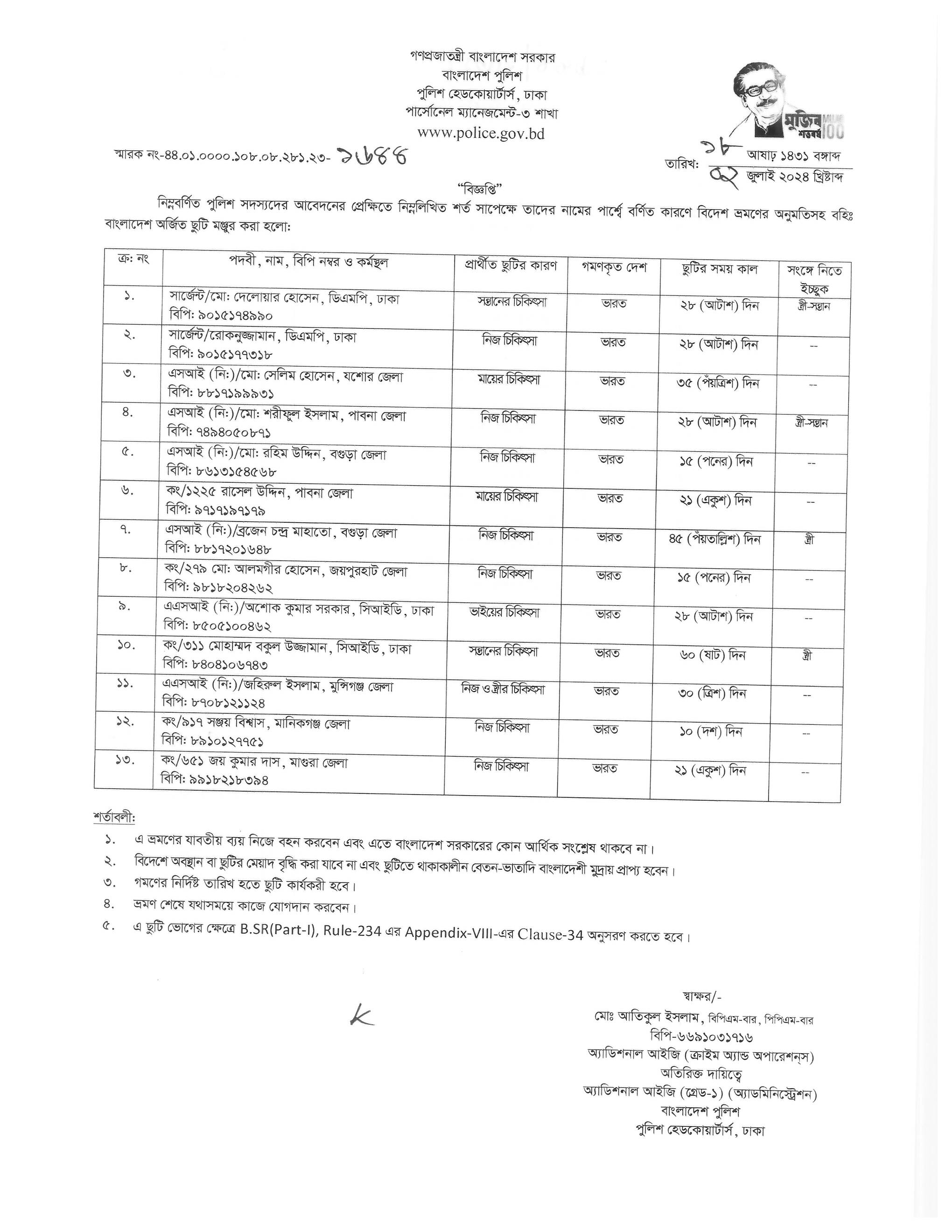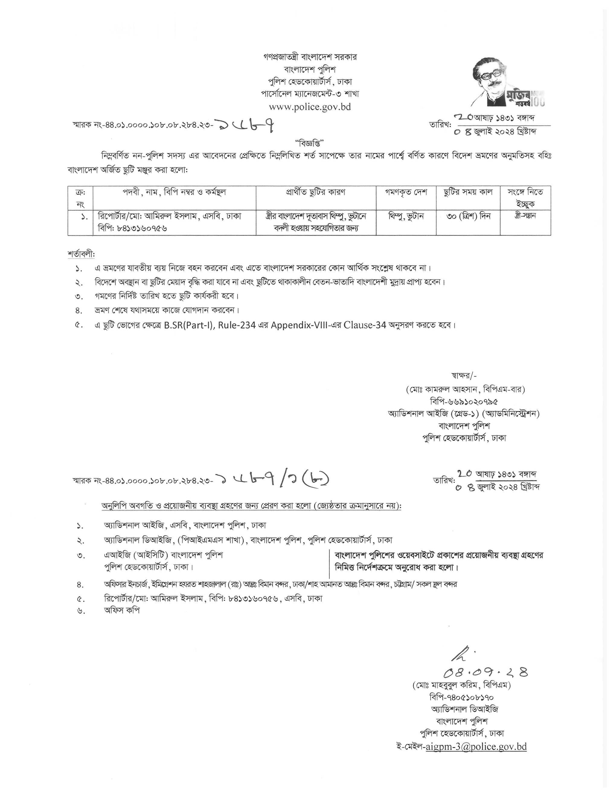 বহিঃ বাংলাদেশ ছুটি, বিজ্ঞপ্তি নং- ১৭৪৭ , তারিখঃ ০৮/০৭/২০২৪ খ্রিঃ।