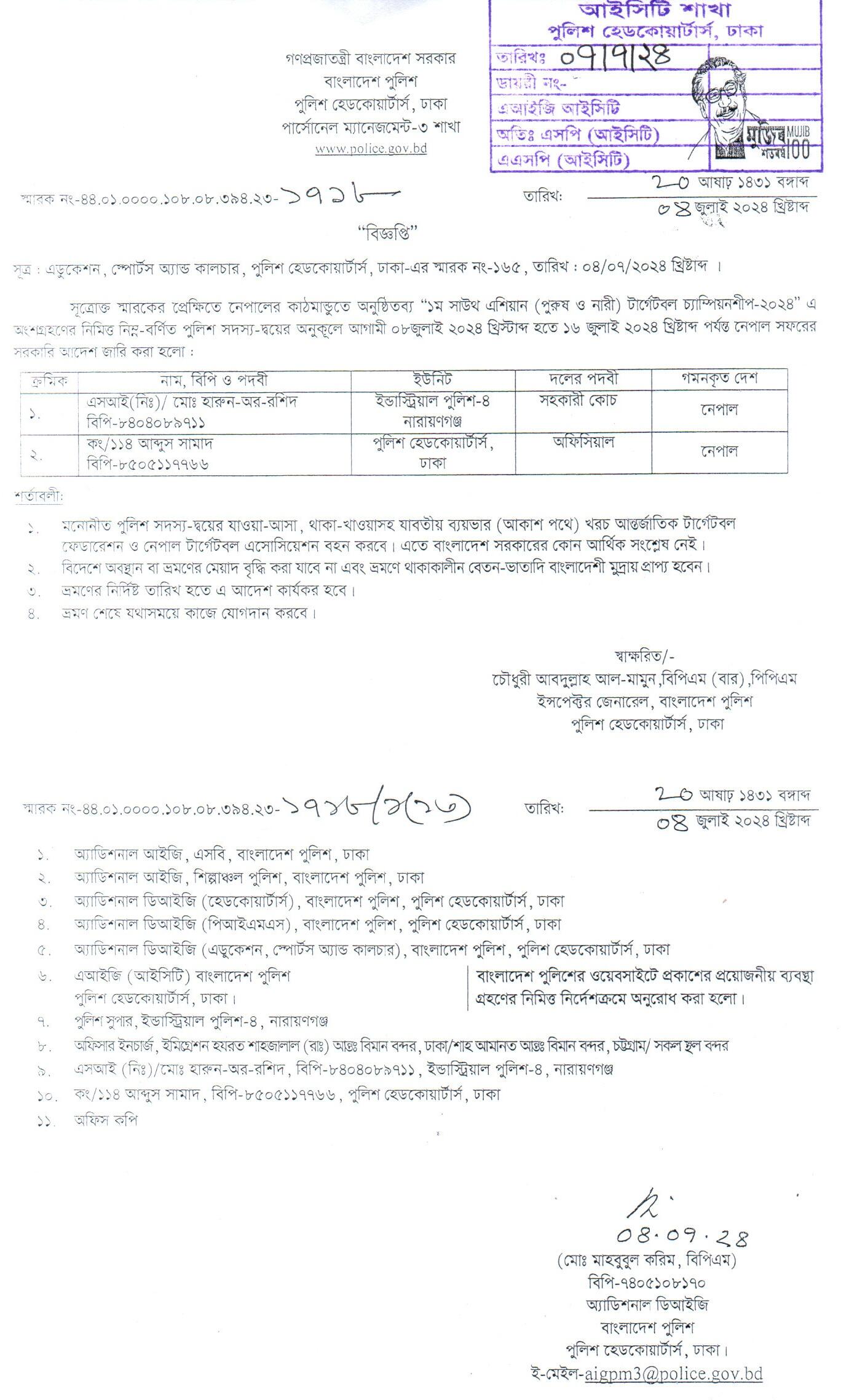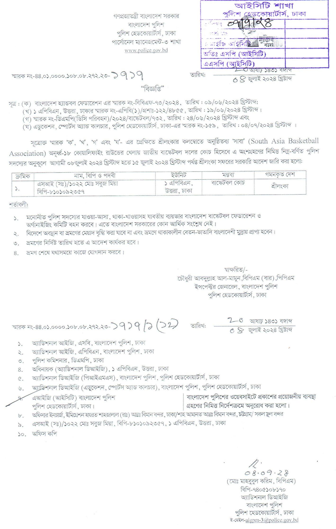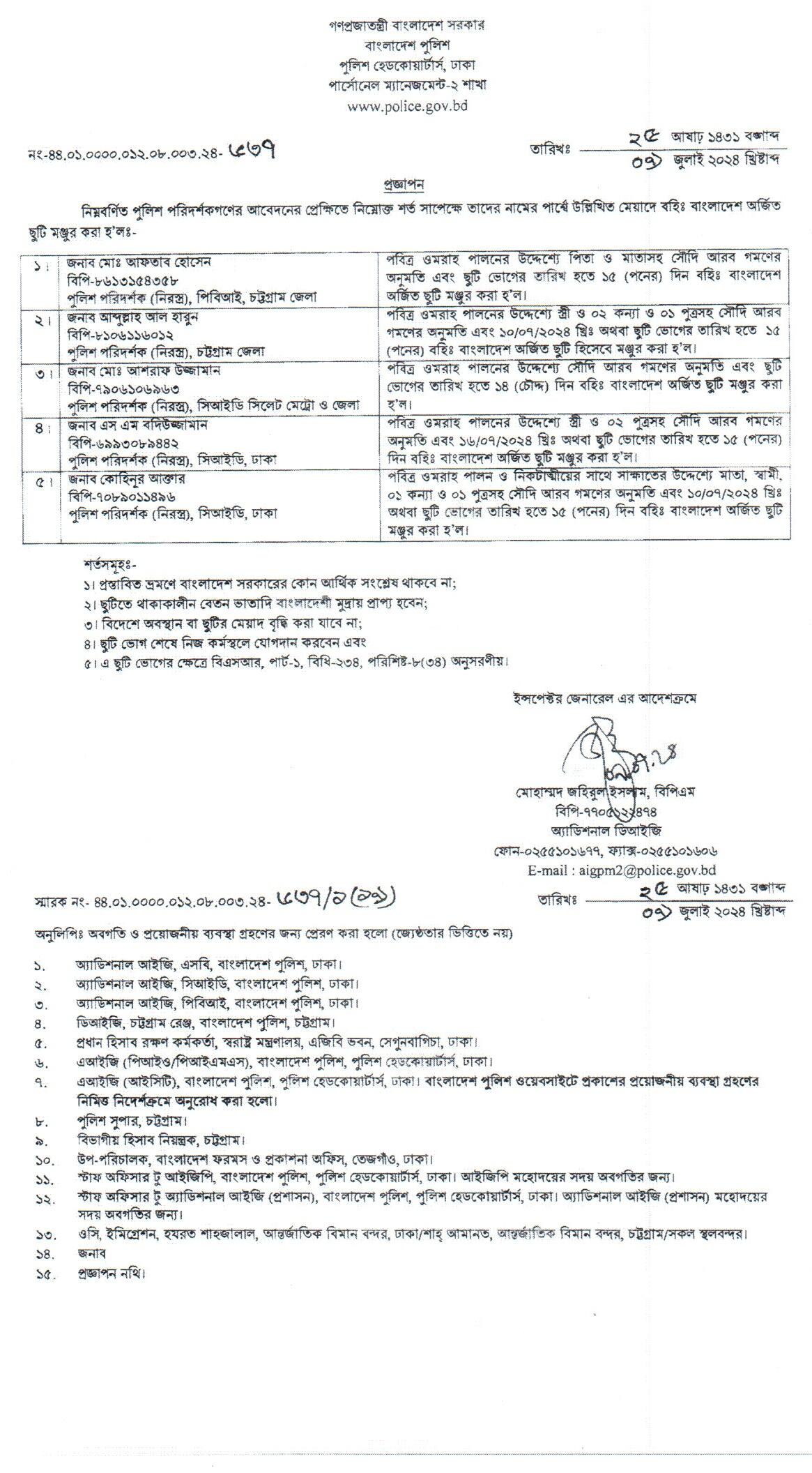 বহিঃ বাংলাদেশ ছুটি, বিজ্ঞপ্তি নং- ১৭৪৭ , তারিখঃ ০৮/০৭/২০২৪ খ্রিঃ।