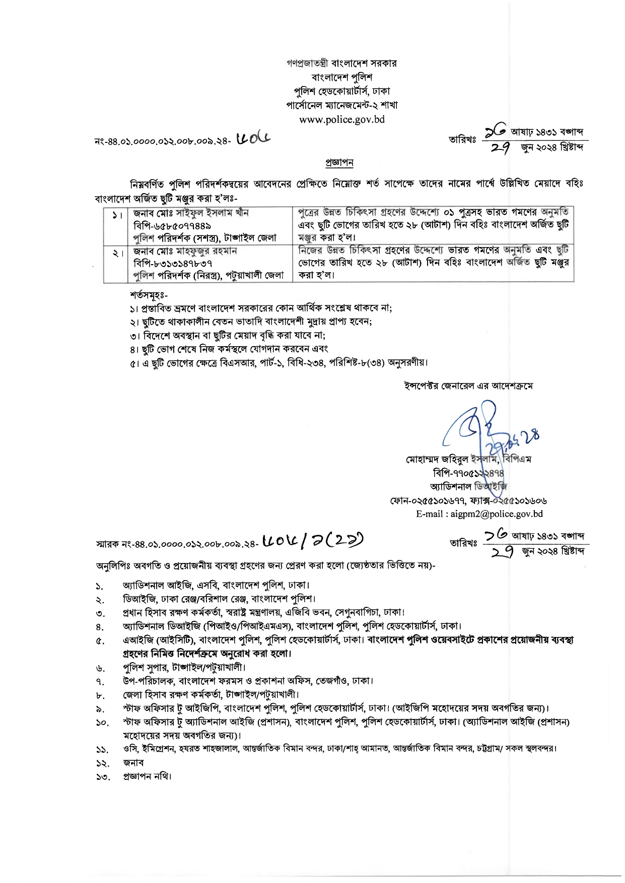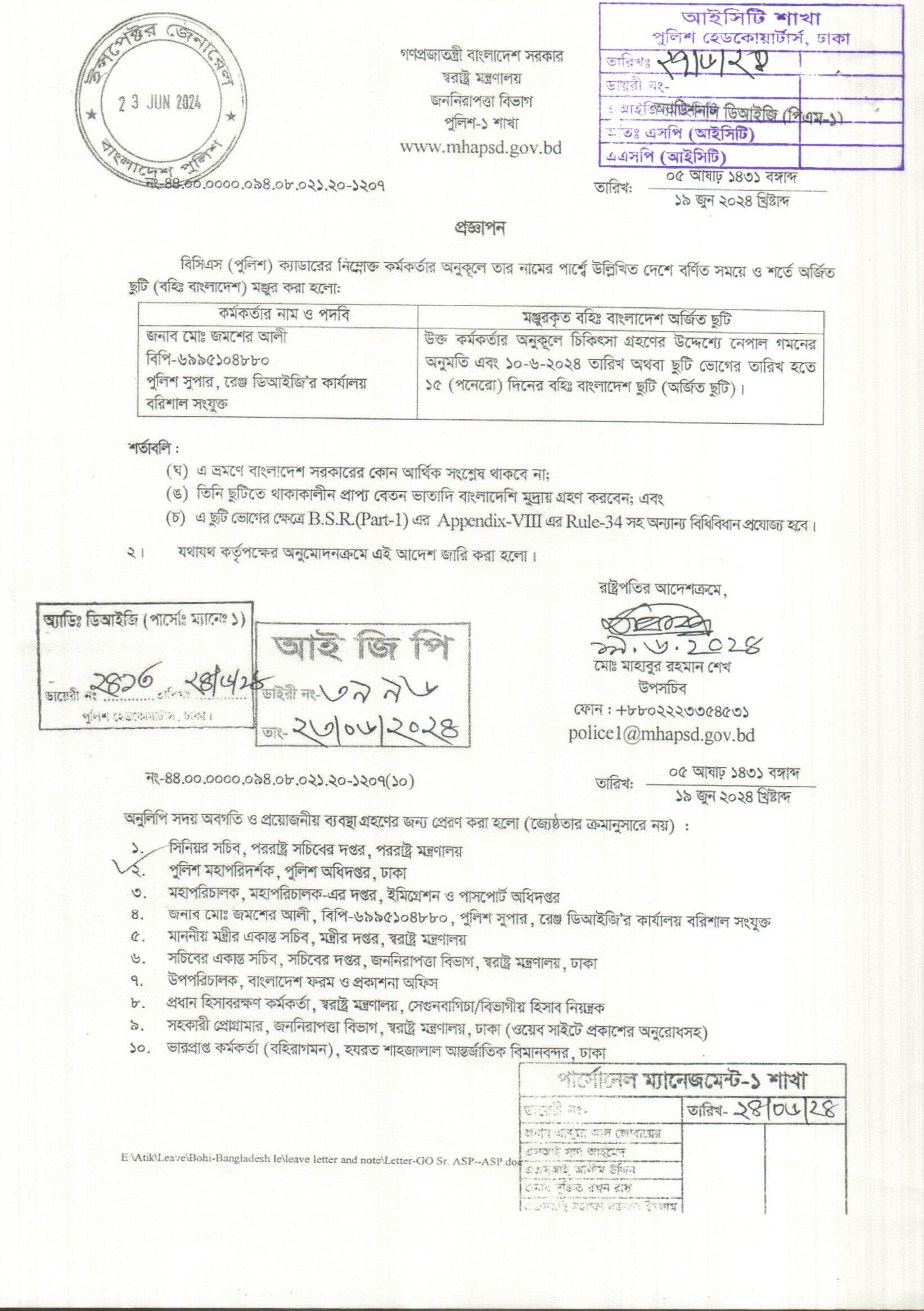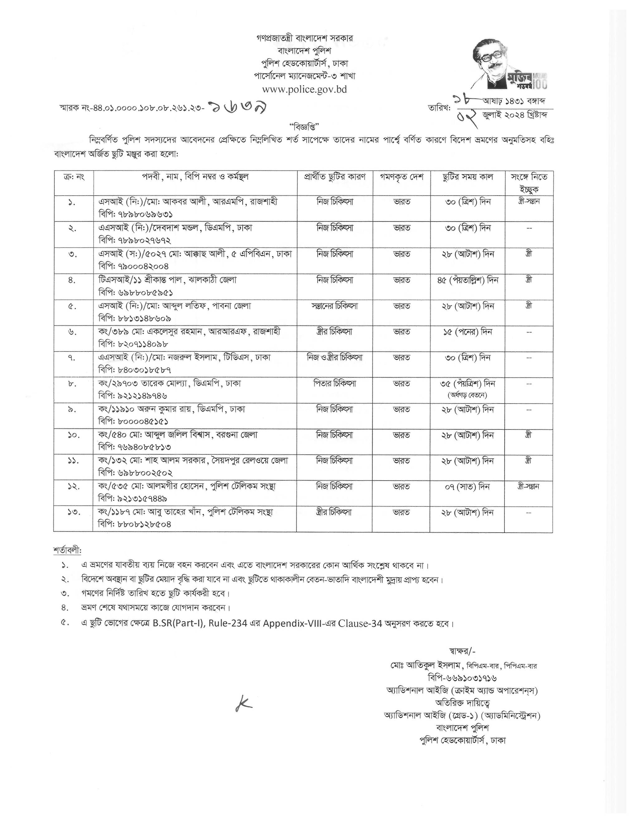 বহিঃ বাংলাদেশ ছুটি, প্রজ্ঞাপন নং- ১২০৭, তারিখঃ ১৯/০৬/২০২৪ খ্রিঃ।