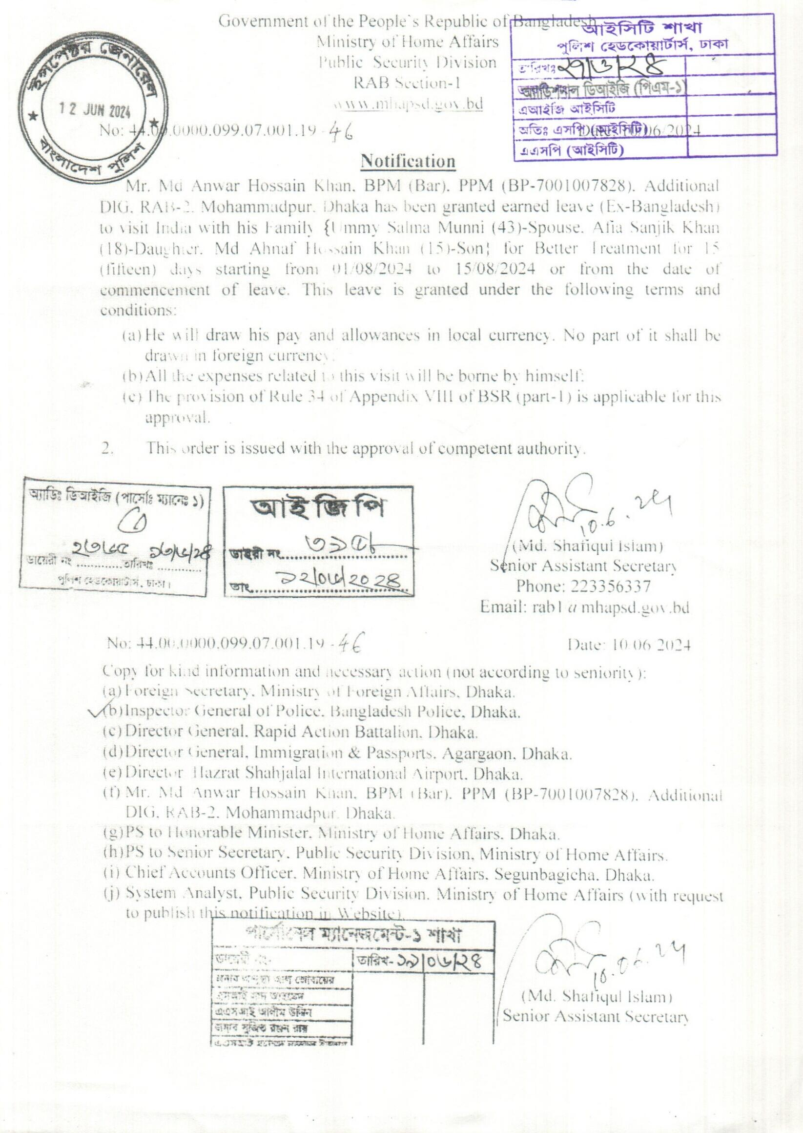 বহিঃ বাংলাদেশ ছুটি, প্রজ্ঞাপন নং- ৪৬, তারিখঃ ১০/০৬/২০২৪ খ্রিঃ।