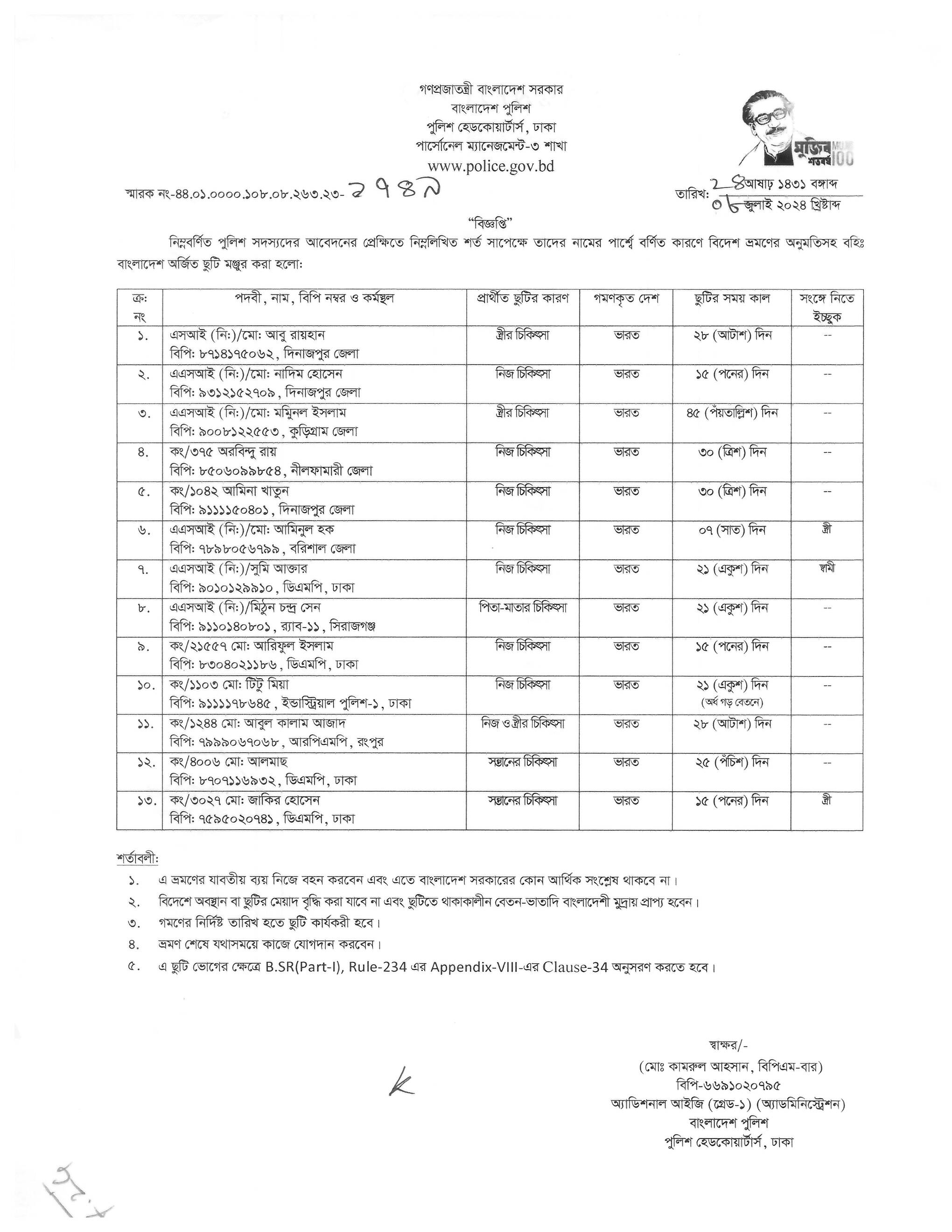বহিঃ বাংলাদেশ ছুটি, বিজ্ঞপ্তি নং- ১৬৪৫ , তারিখঃ ০২/০৭/২০২৪ খ্রিঃ।