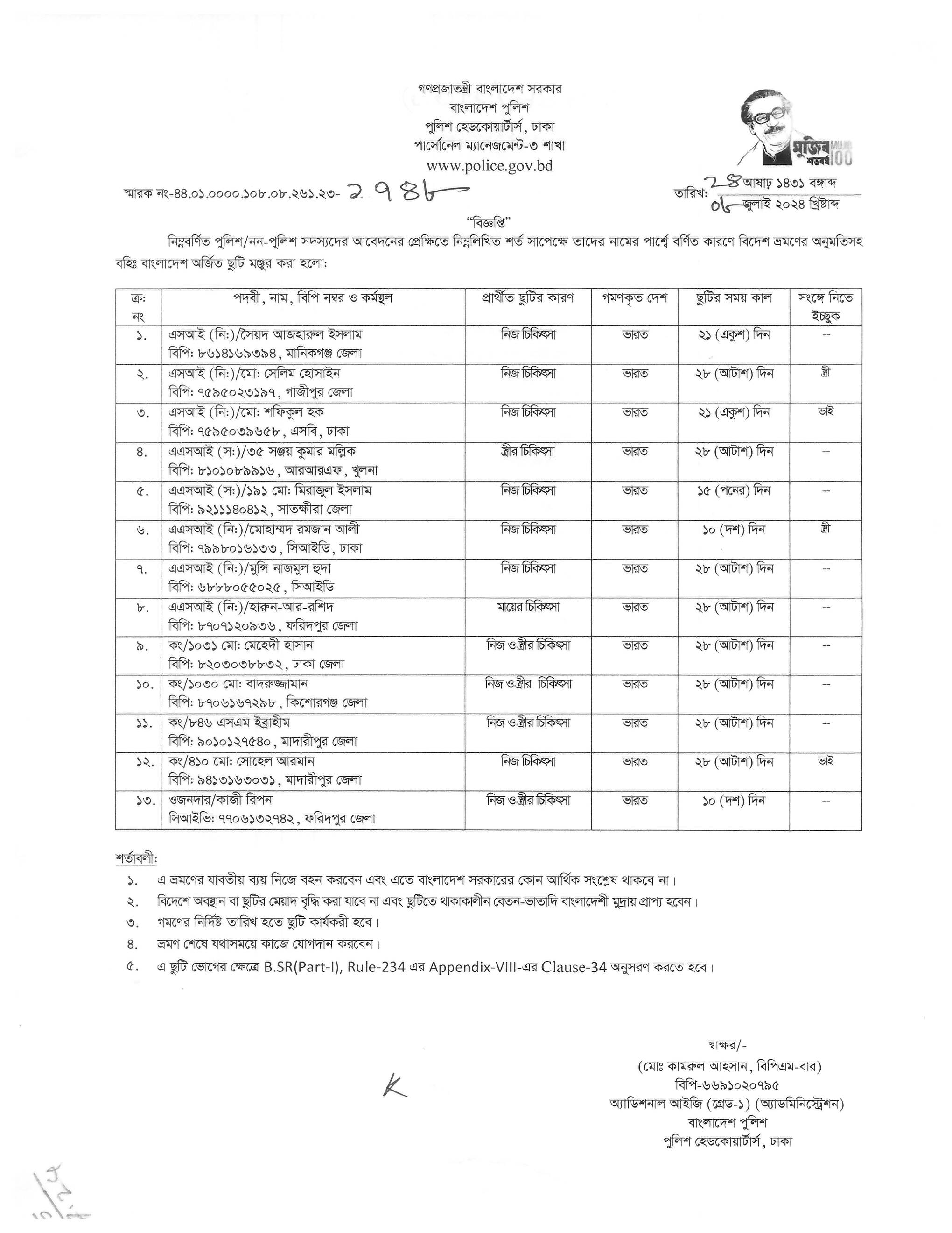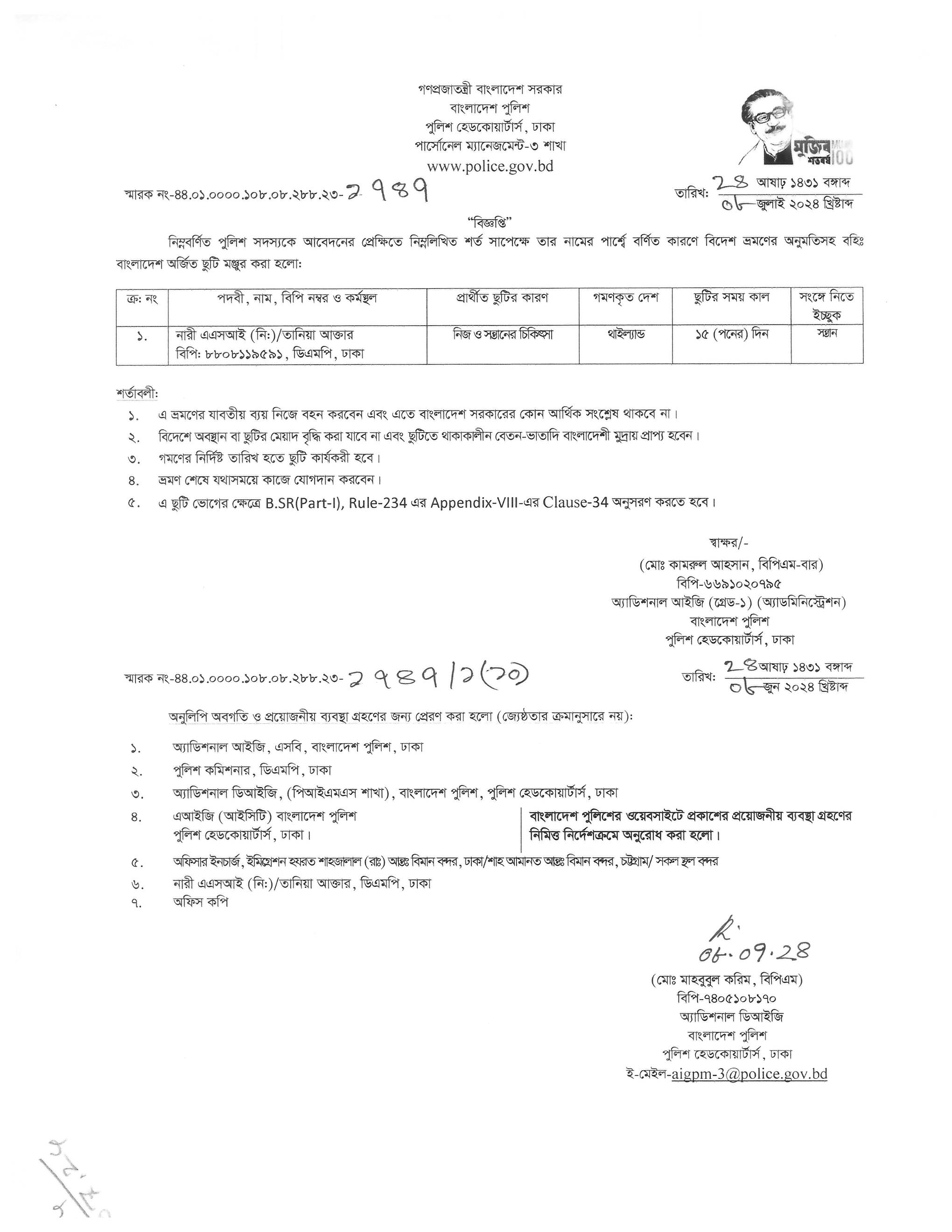 বহিঃ বাংলাদেশ ছুটি, বিজ্ঞপ্তি নং- ১৭১৮ , তারিখঃ ০৪/০৭/২০২৪ খ্রিঃ।