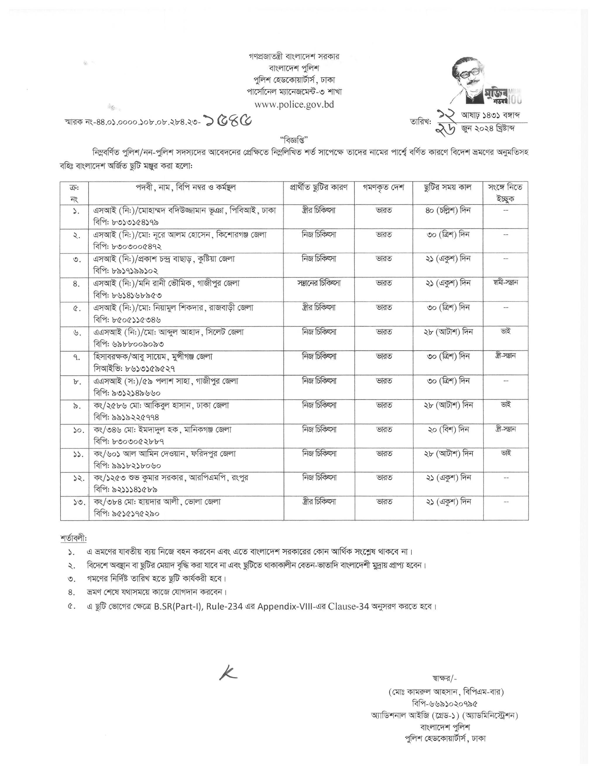 বহিঃ বাংলাদেশ ছুটি, বিজ্ঞপ্তি নং- ১৪৯০ , তারিখঃ ১৩/০৬/২০২৪ খ্রিঃ।