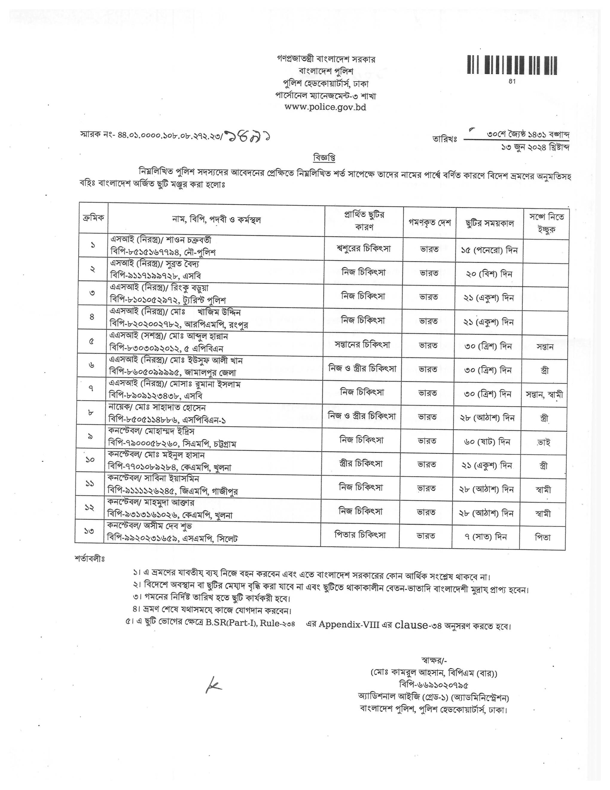 বহিঃ বাংলাদেশ ছুটি, বিজ্ঞপ্তি নং- ১৪৯১ , তারিখঃ ১৩/০৬/২০২৪ খ্রিঃ।