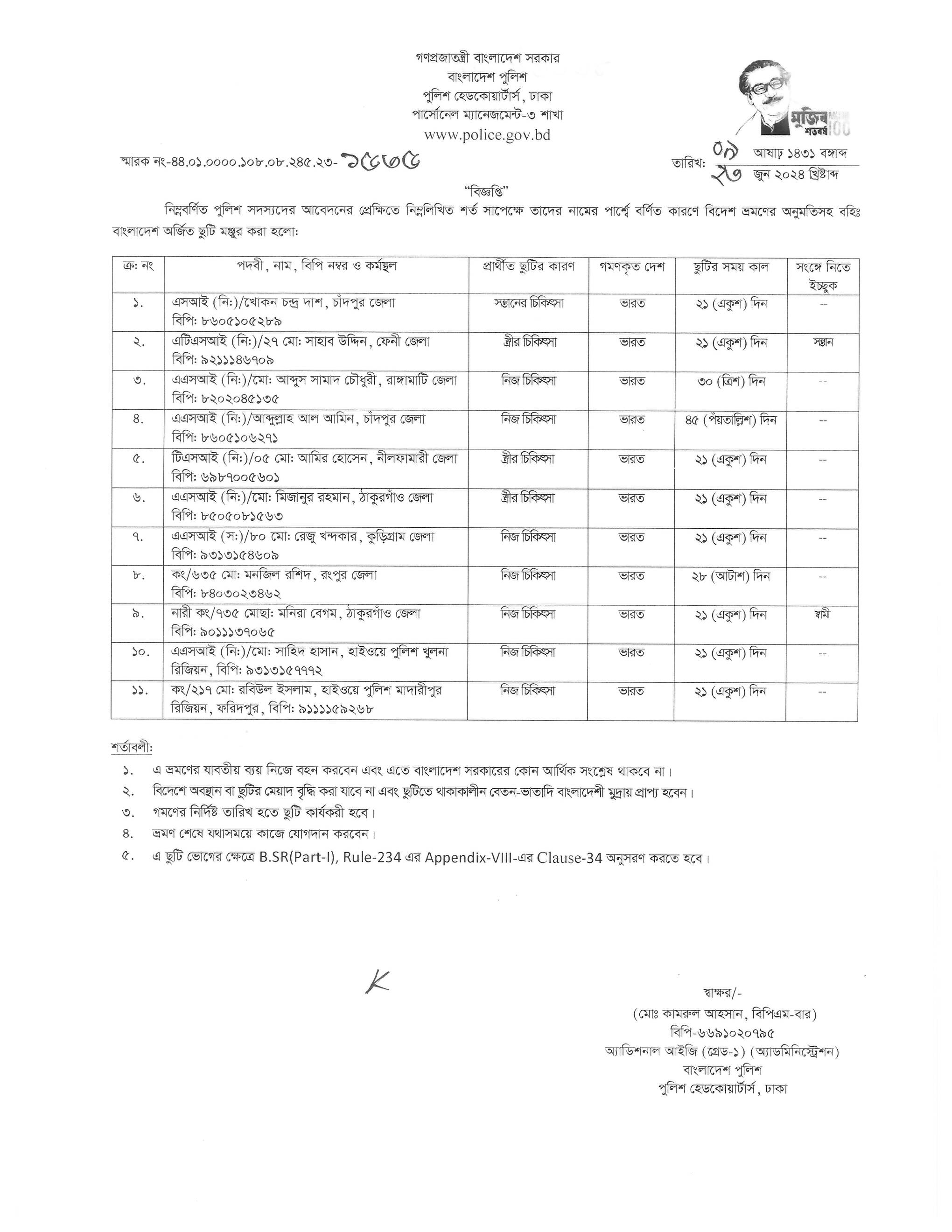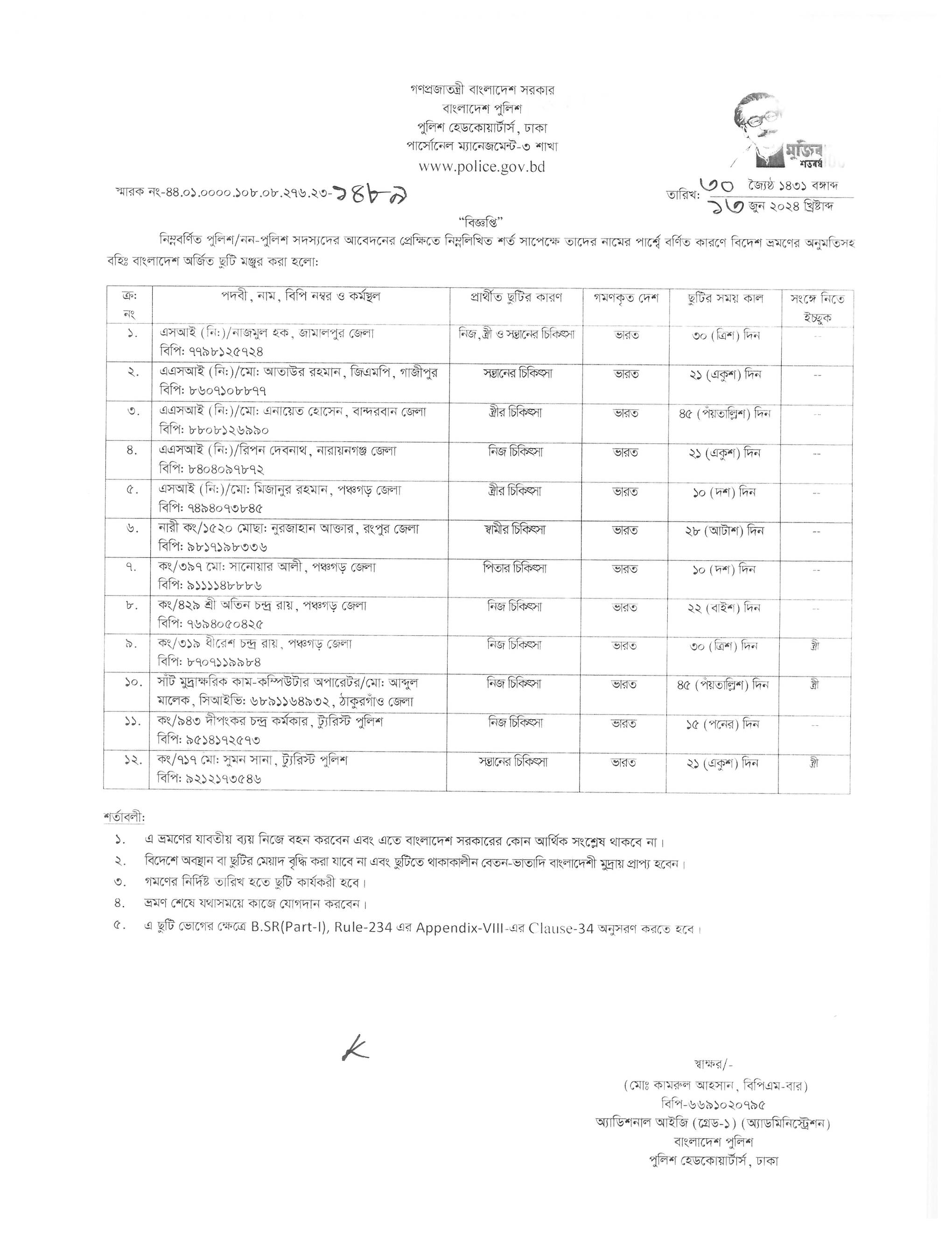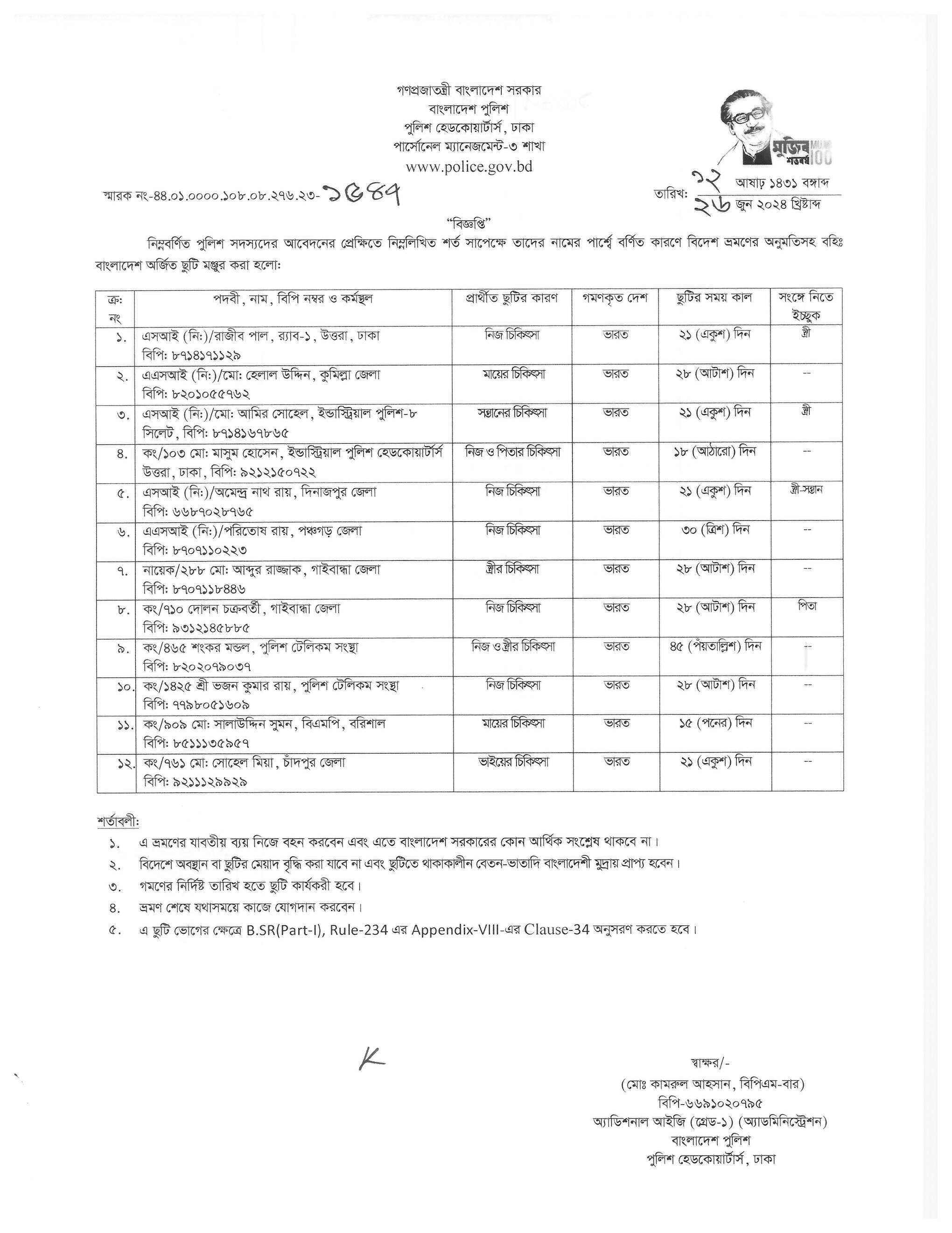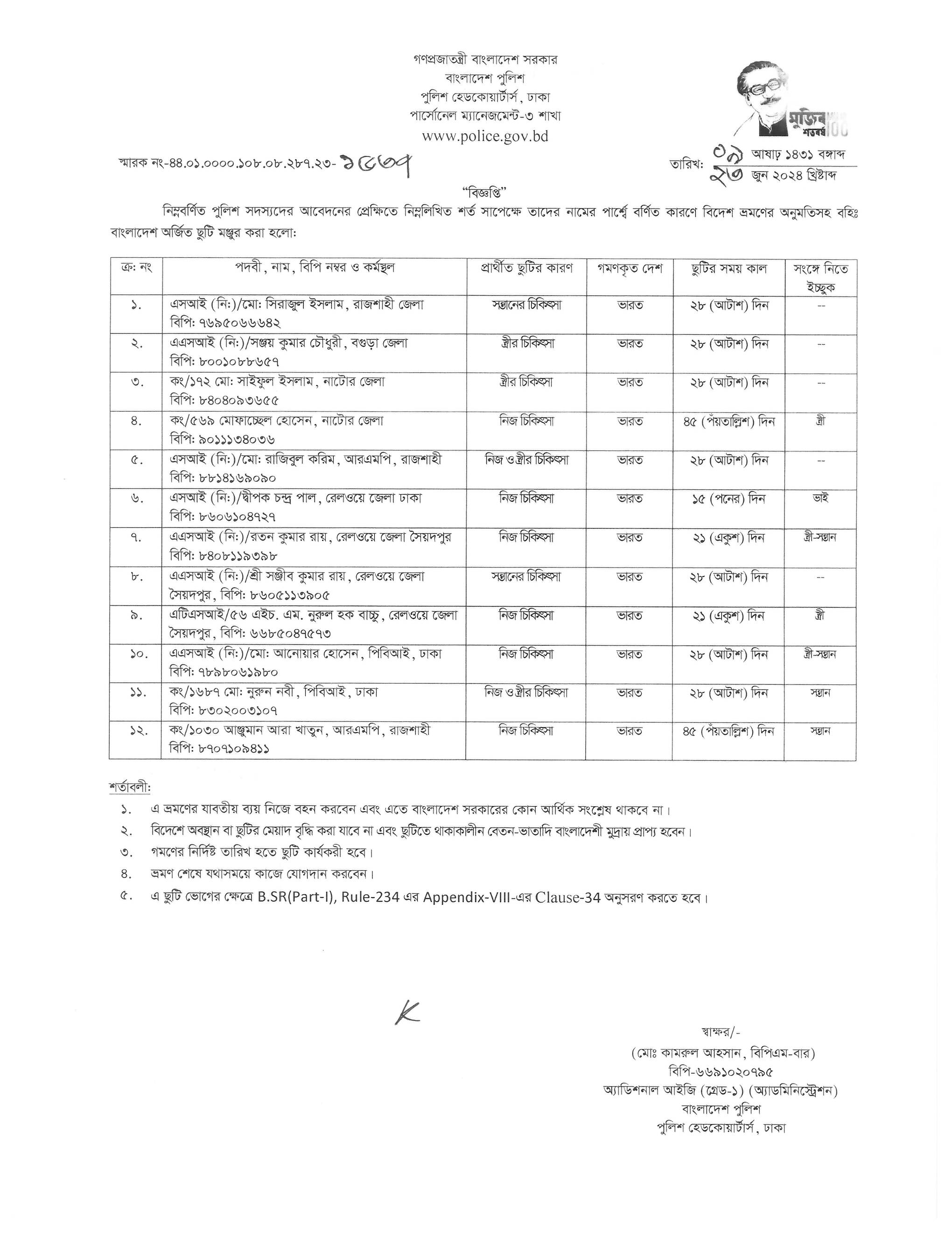 বহিঃ বাংলাদেশ ছুটি, প্রজ্ঞাপন নং- ১২১৩, তারিখঃ ১৯/০৬/২০২৪ খ্রিঃ।