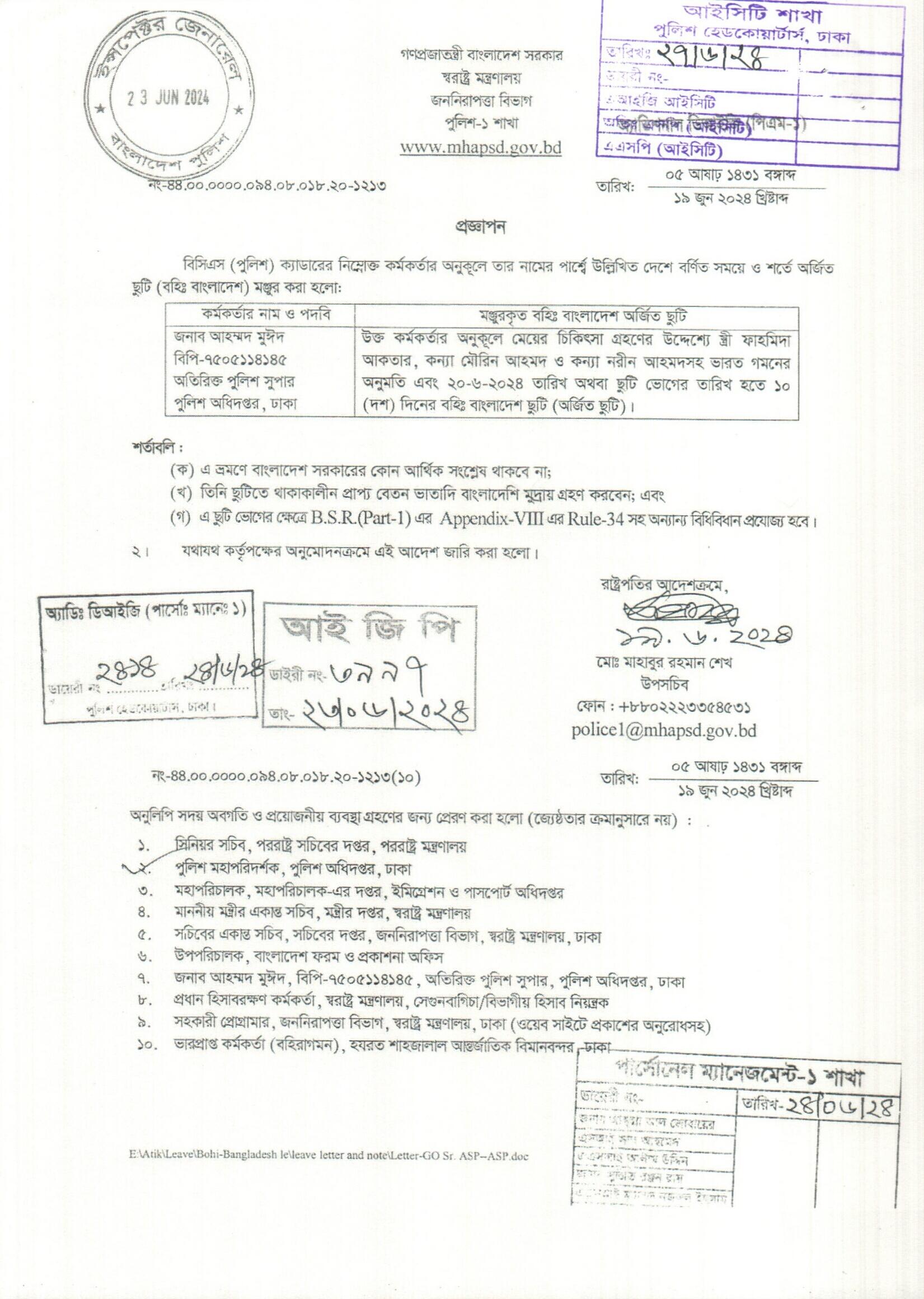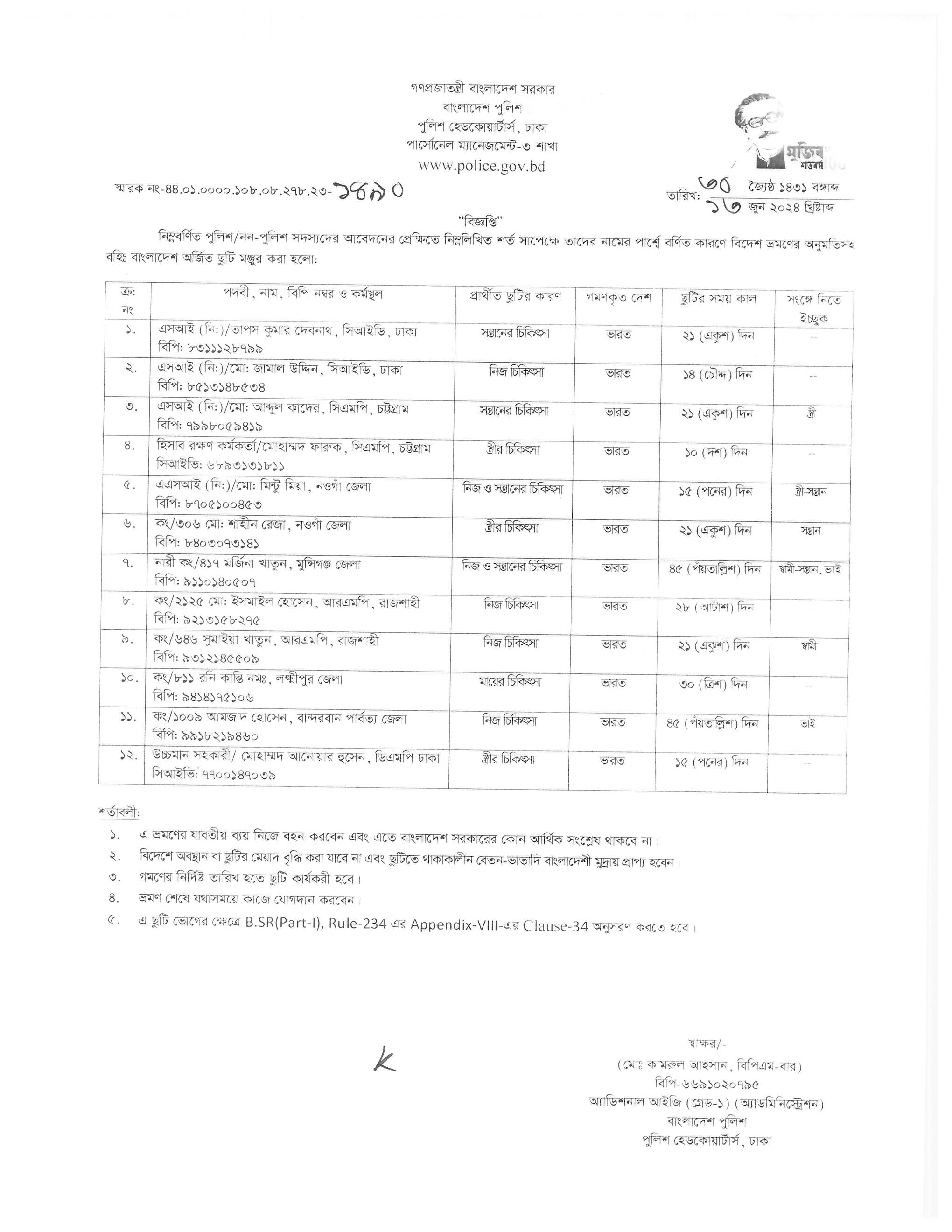 বহিঃ বাংলাদেশ ছুটি, বিজ্ঞপ্তি নং- ১৫৪৫ , তারিখঃ ২৬/০৬/২০২৪ খ্রিঃ।