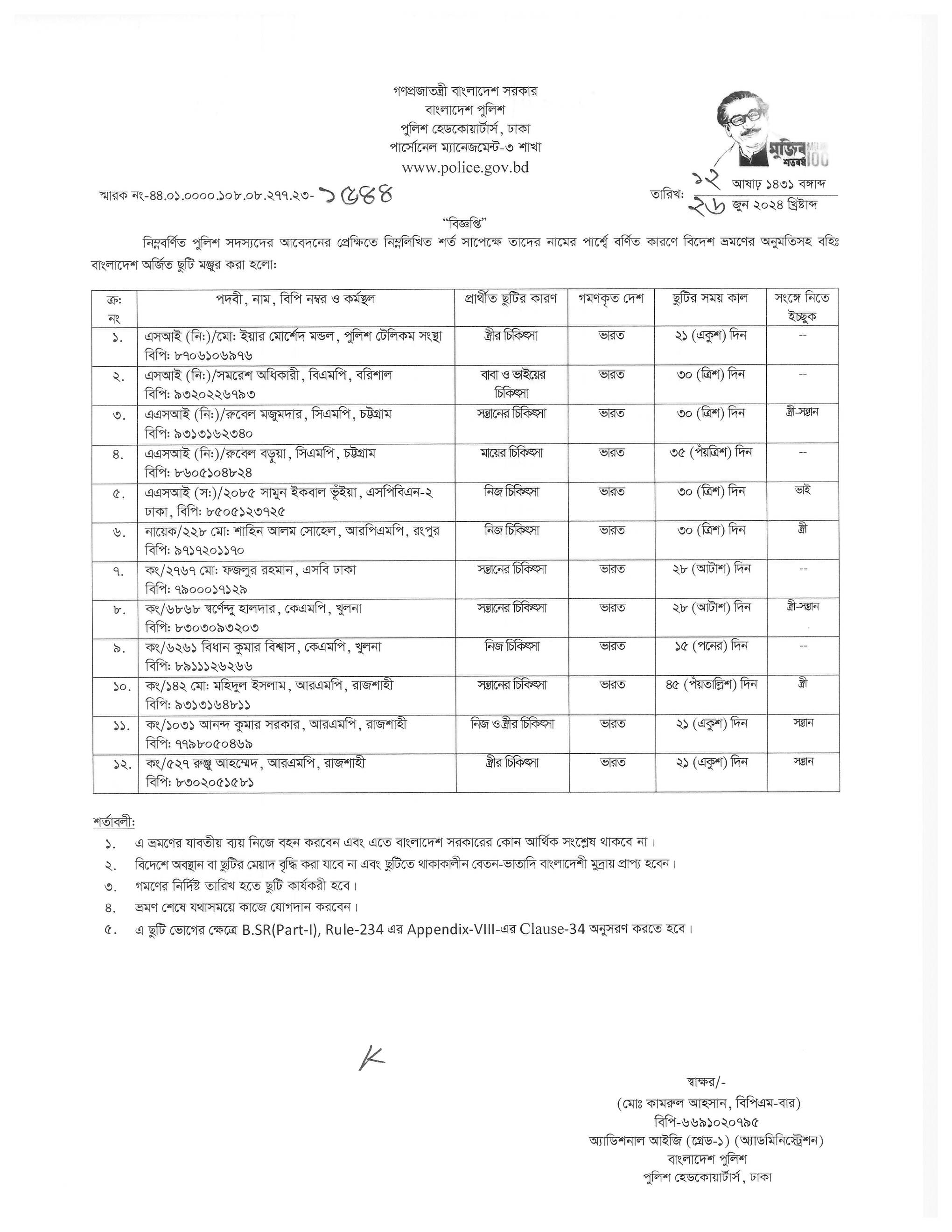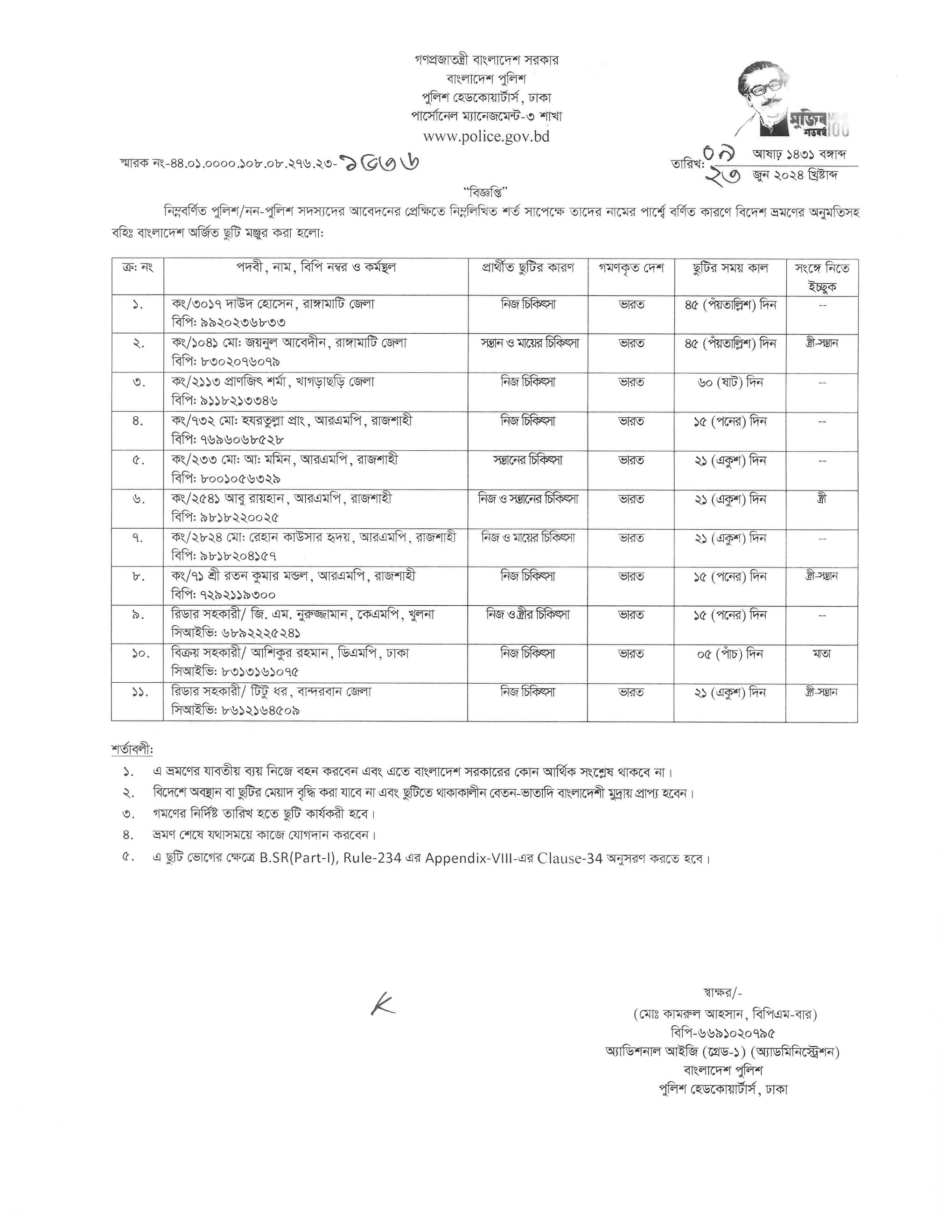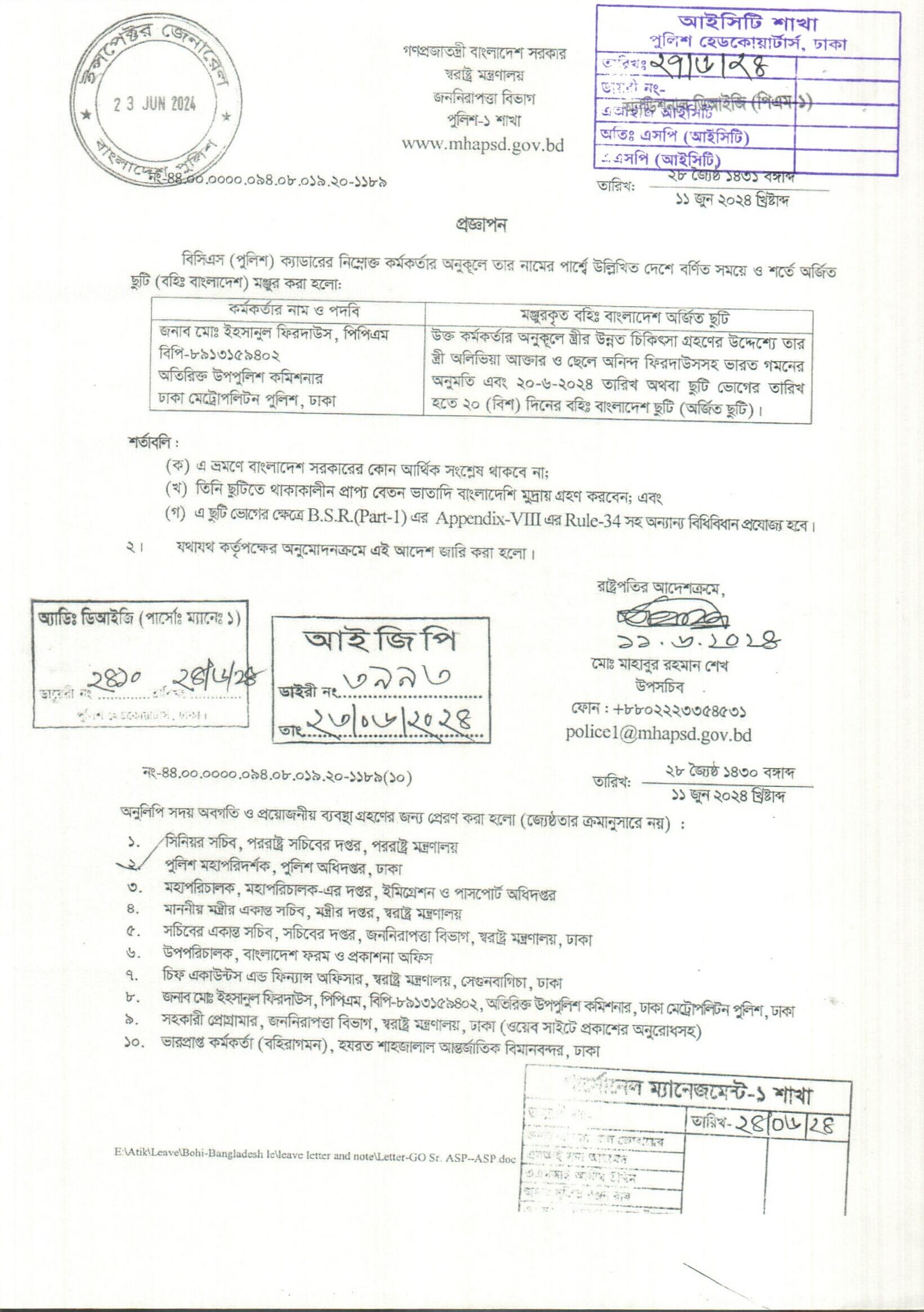 বহিঃ বাংলাদেশ ছুটি, বিজ্ঞপ্তি নং- ১৫৩৭ , তারিখঃ ২৩/০৬/২০২৪ খ্রিঃ।