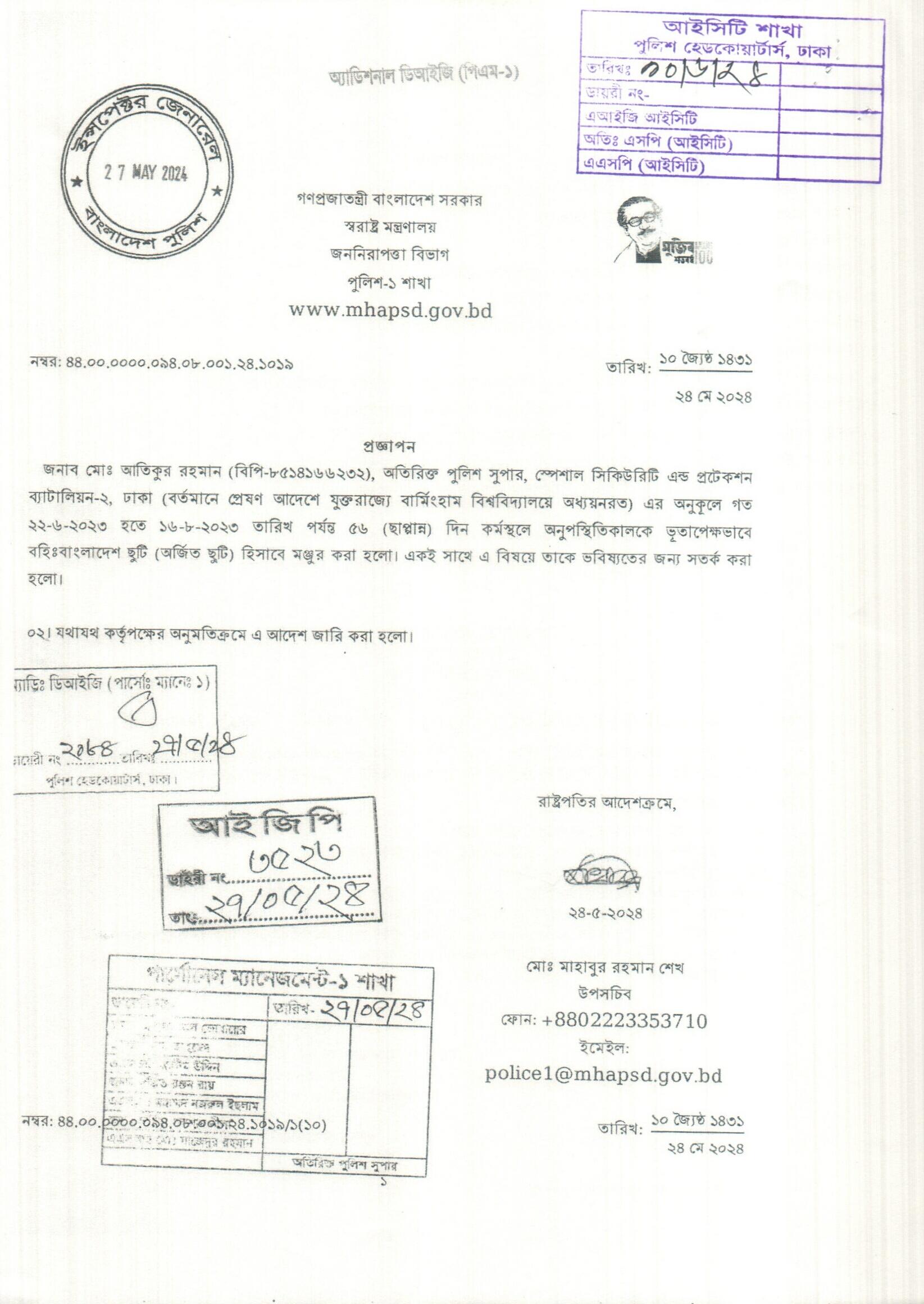 বহিঃ বাংলাদেশ ছুটি, প্রজ্ঞাপন নং- ১০৩৩, তারিখঃ ২৩/০৫/২০২৪ খ্রিঃ।