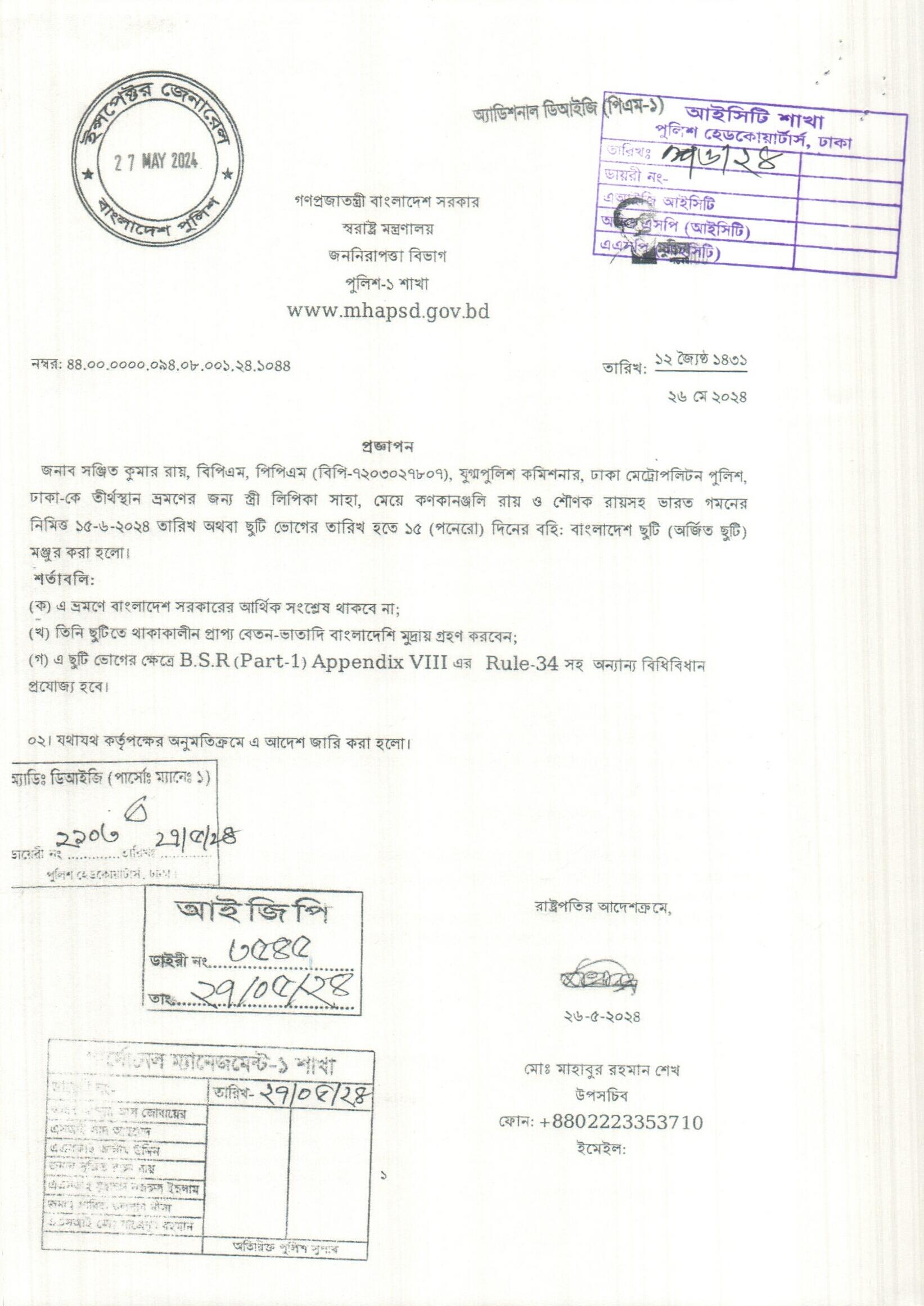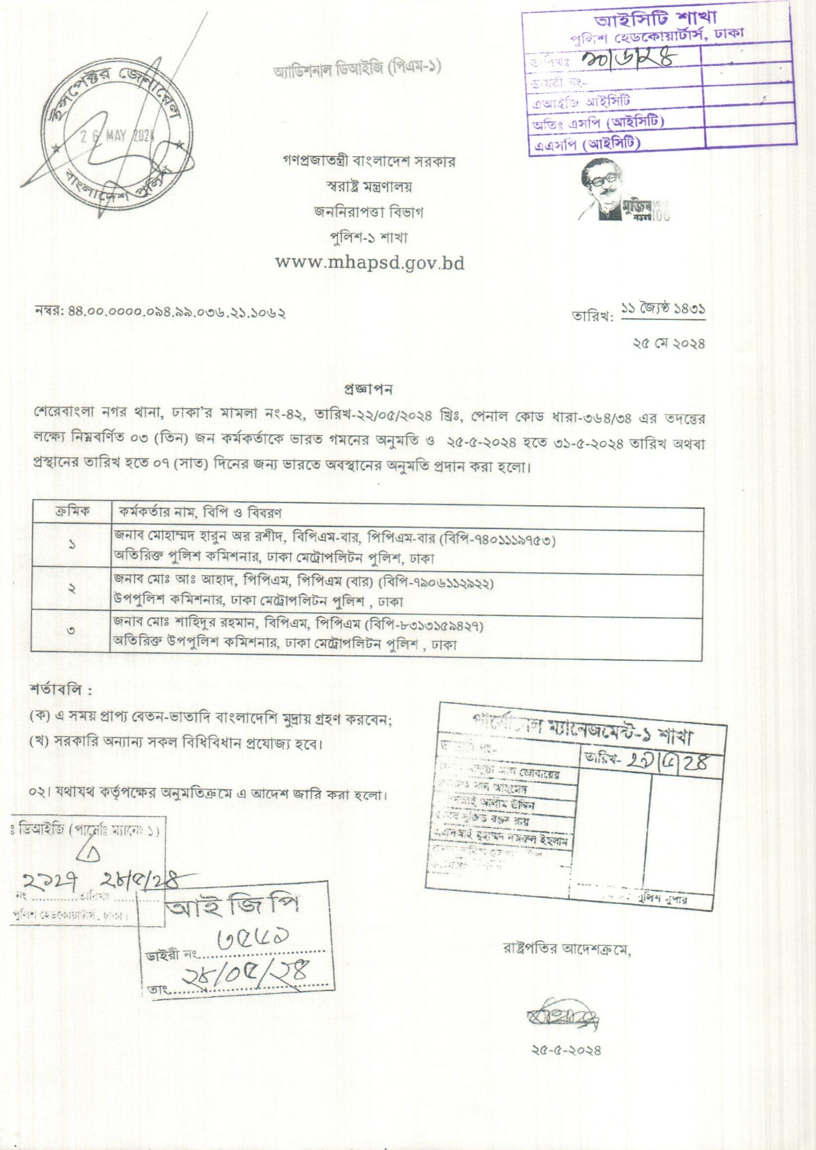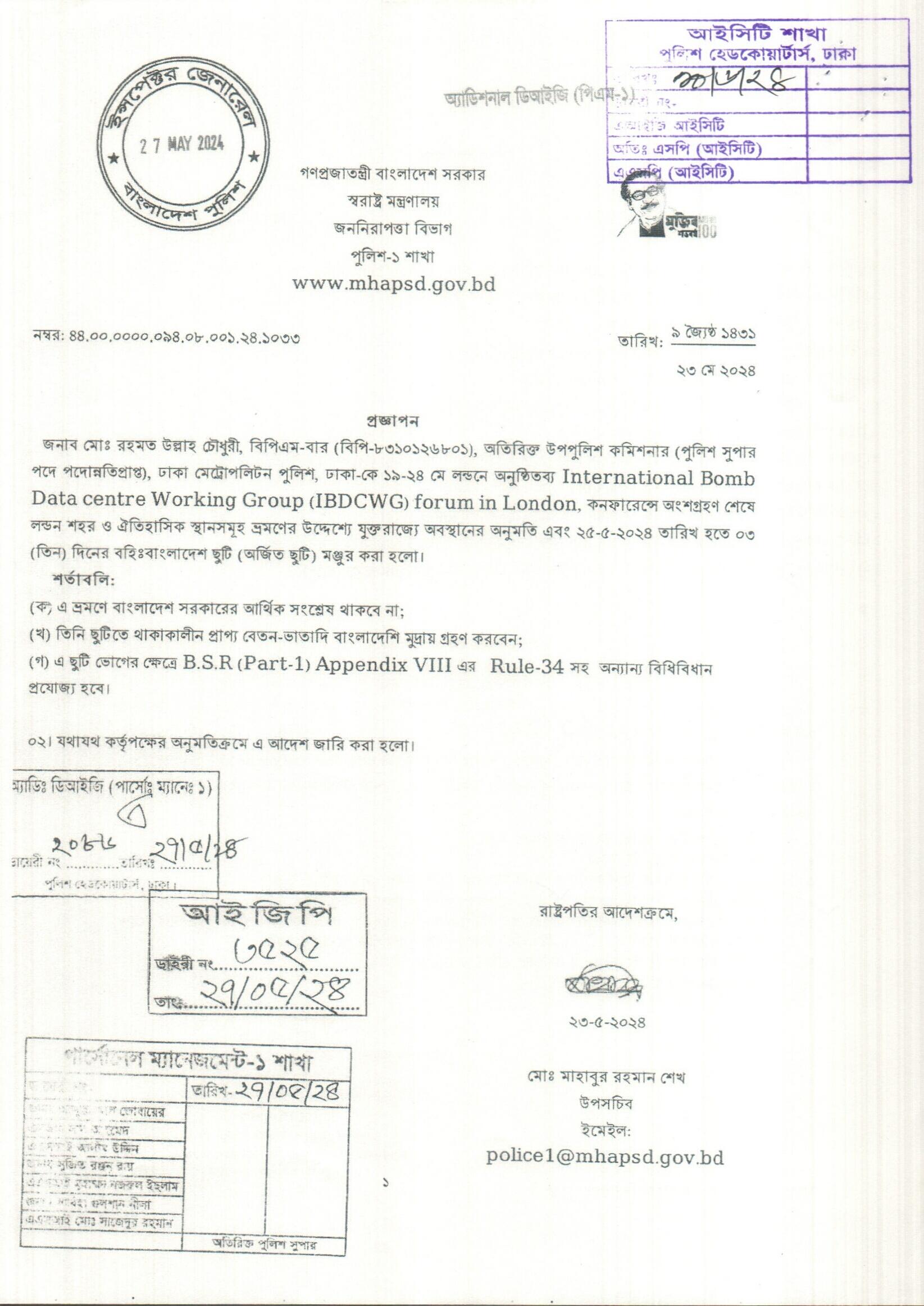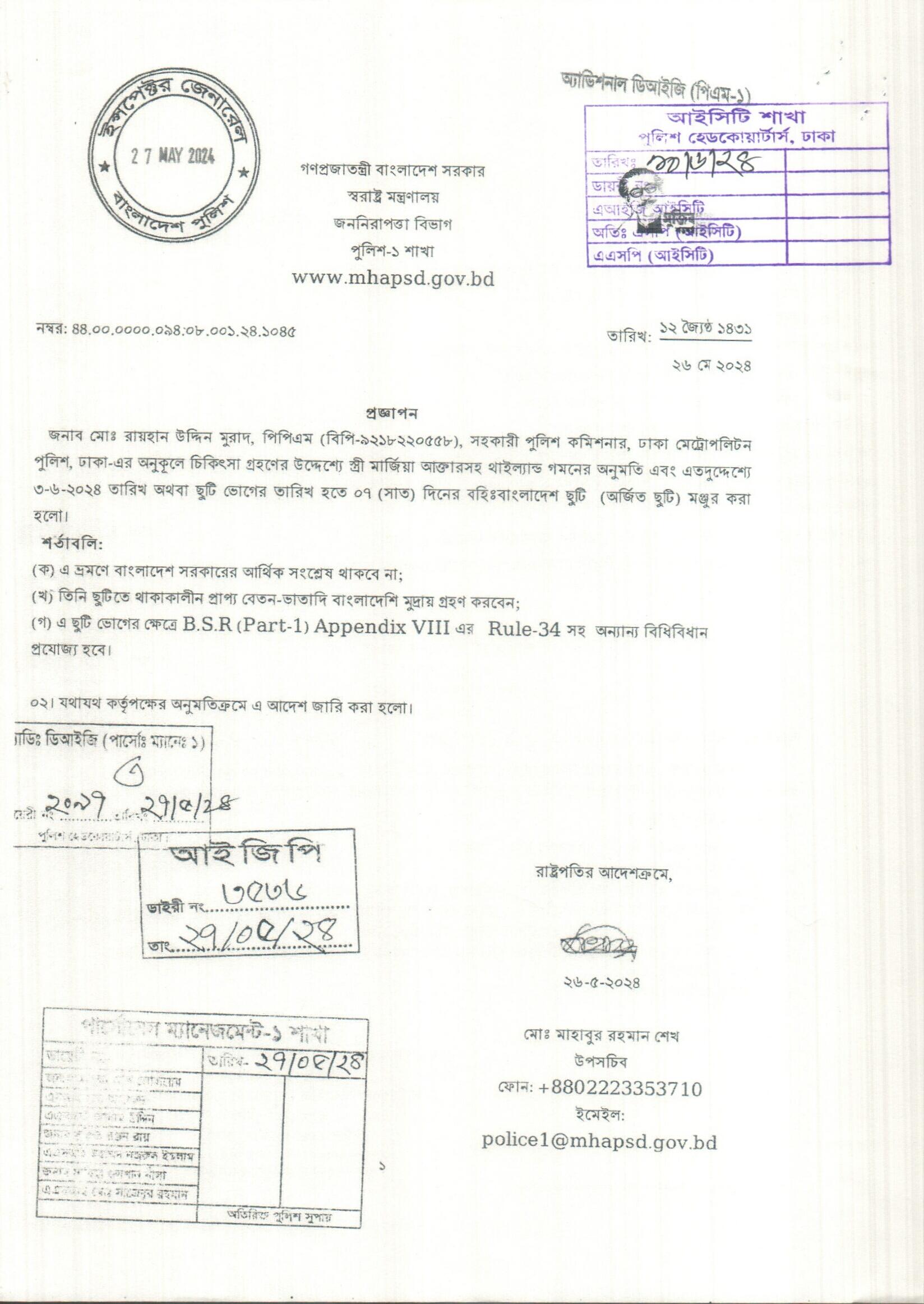 বহিঃ বাংলাদেশ গমন, প্রজ্ঞাপন নং- ১০৬২, তারিখঃ ২৫/০৫/২০২৪ খ্রিঃ।