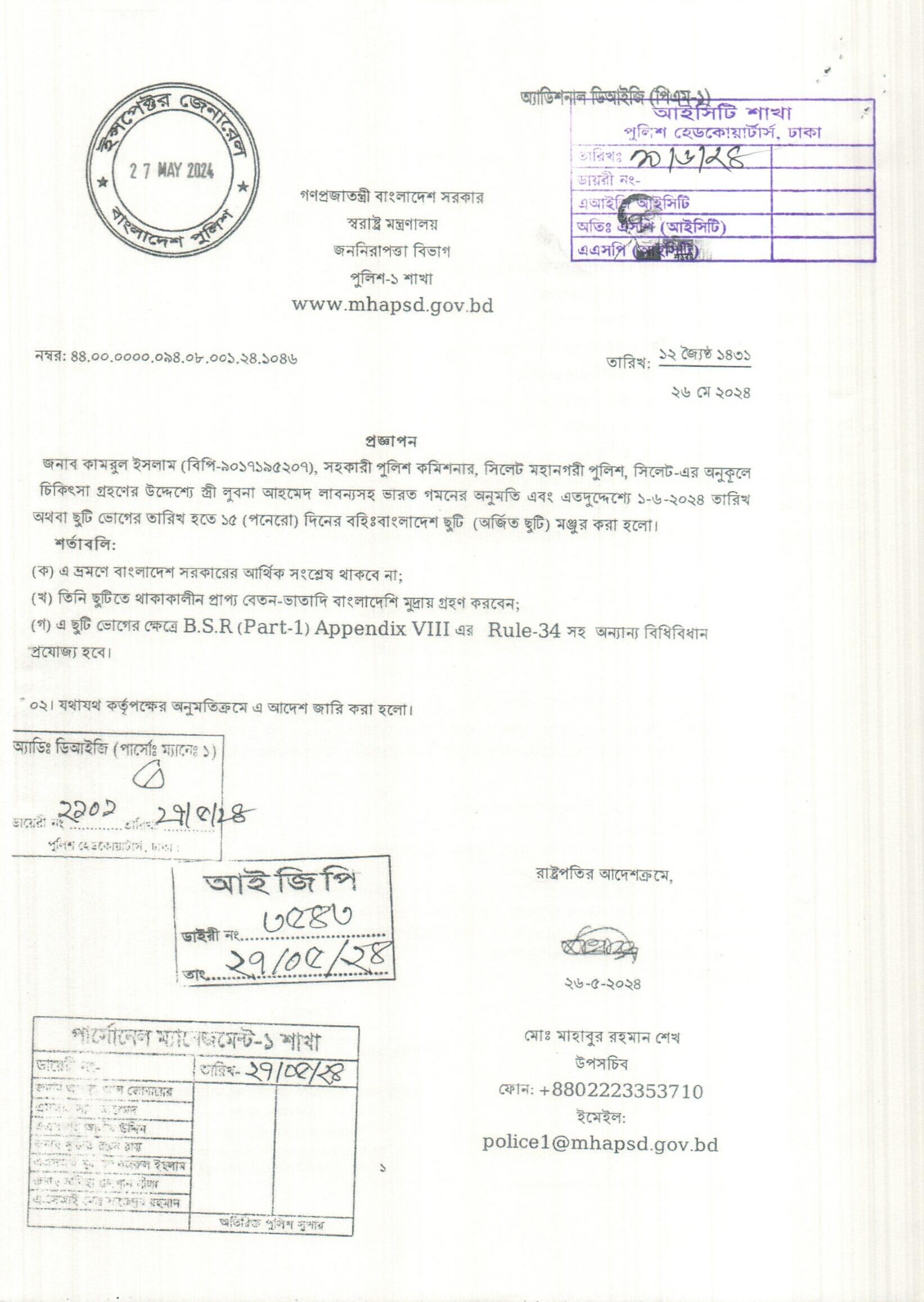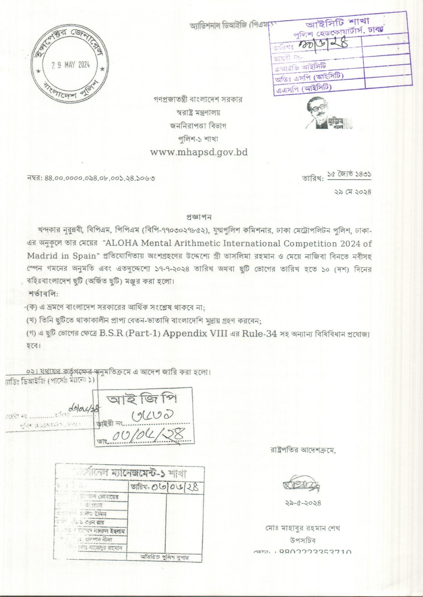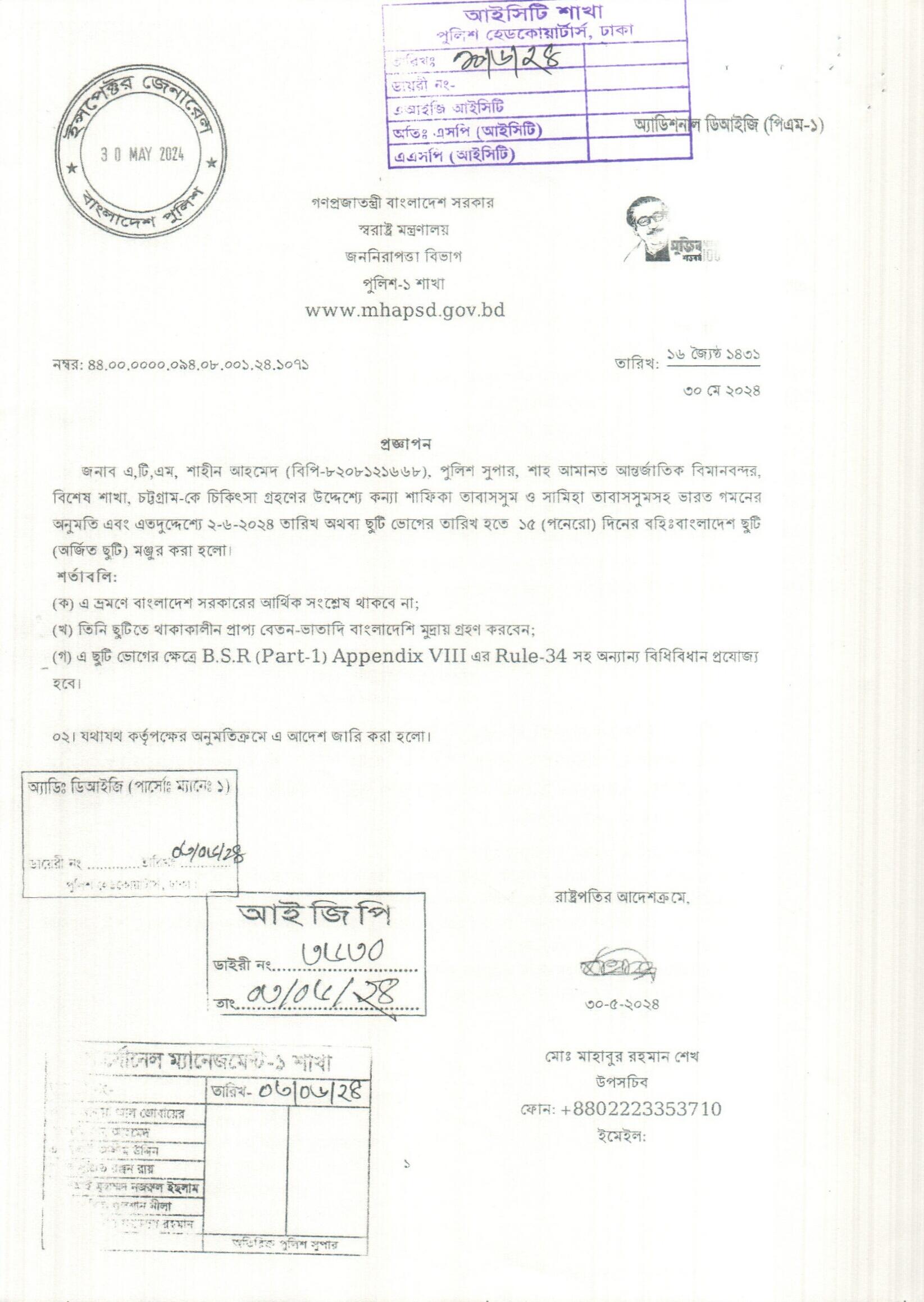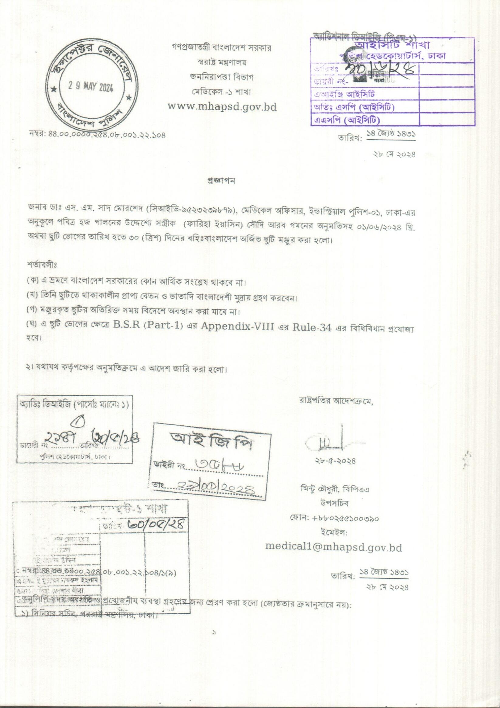 বহিঃ বাংলাদেশ গমন, প্রজ্ঞাপন নং- ১০৬২, তারিখঃ ২৫/০৫/২০২৪ খ্রিঃ।