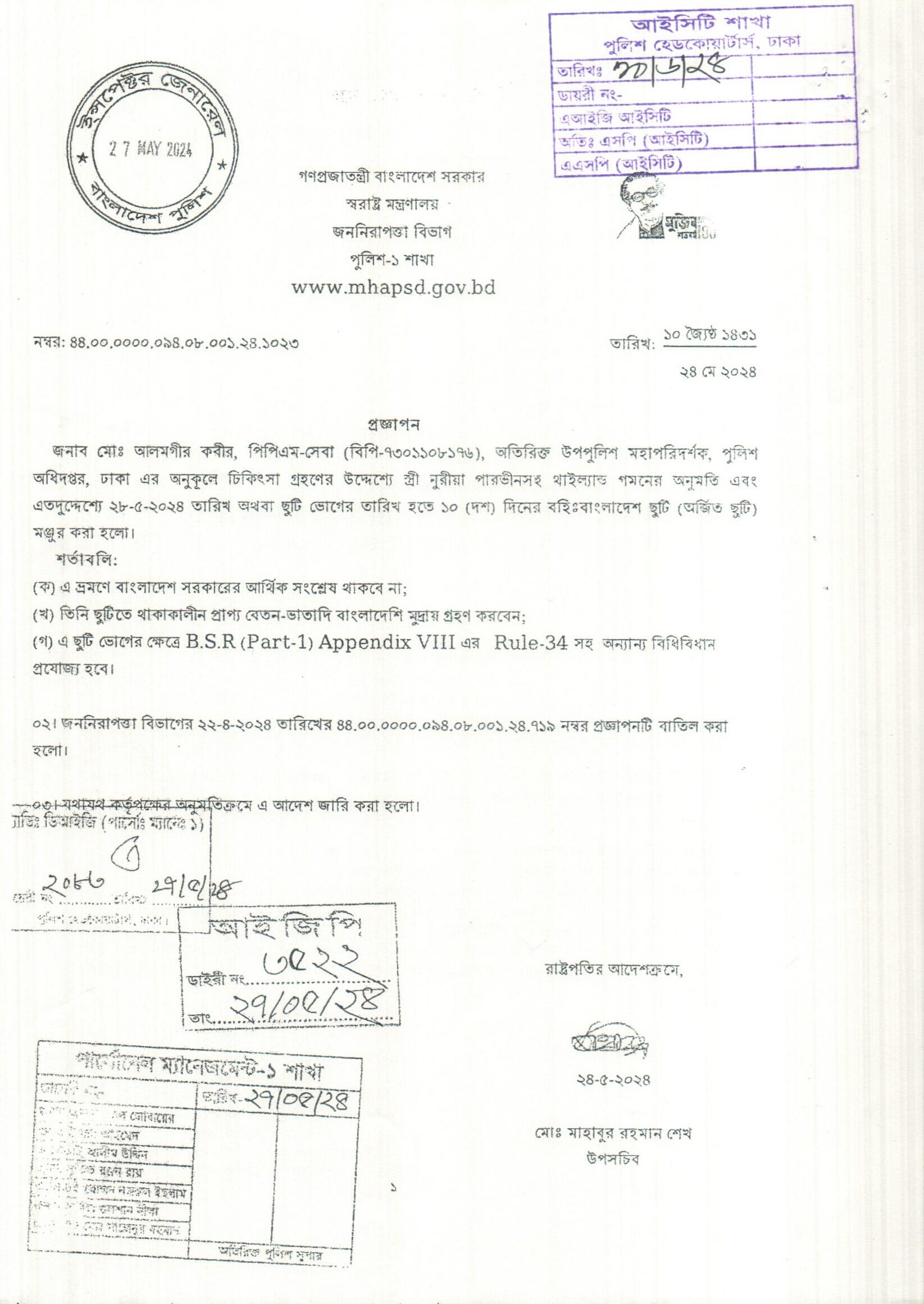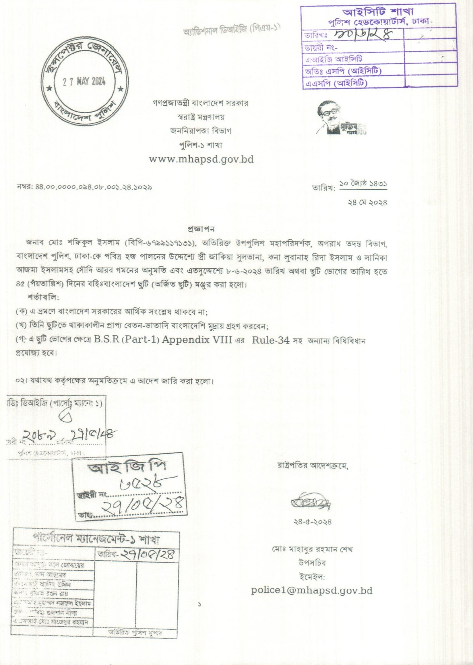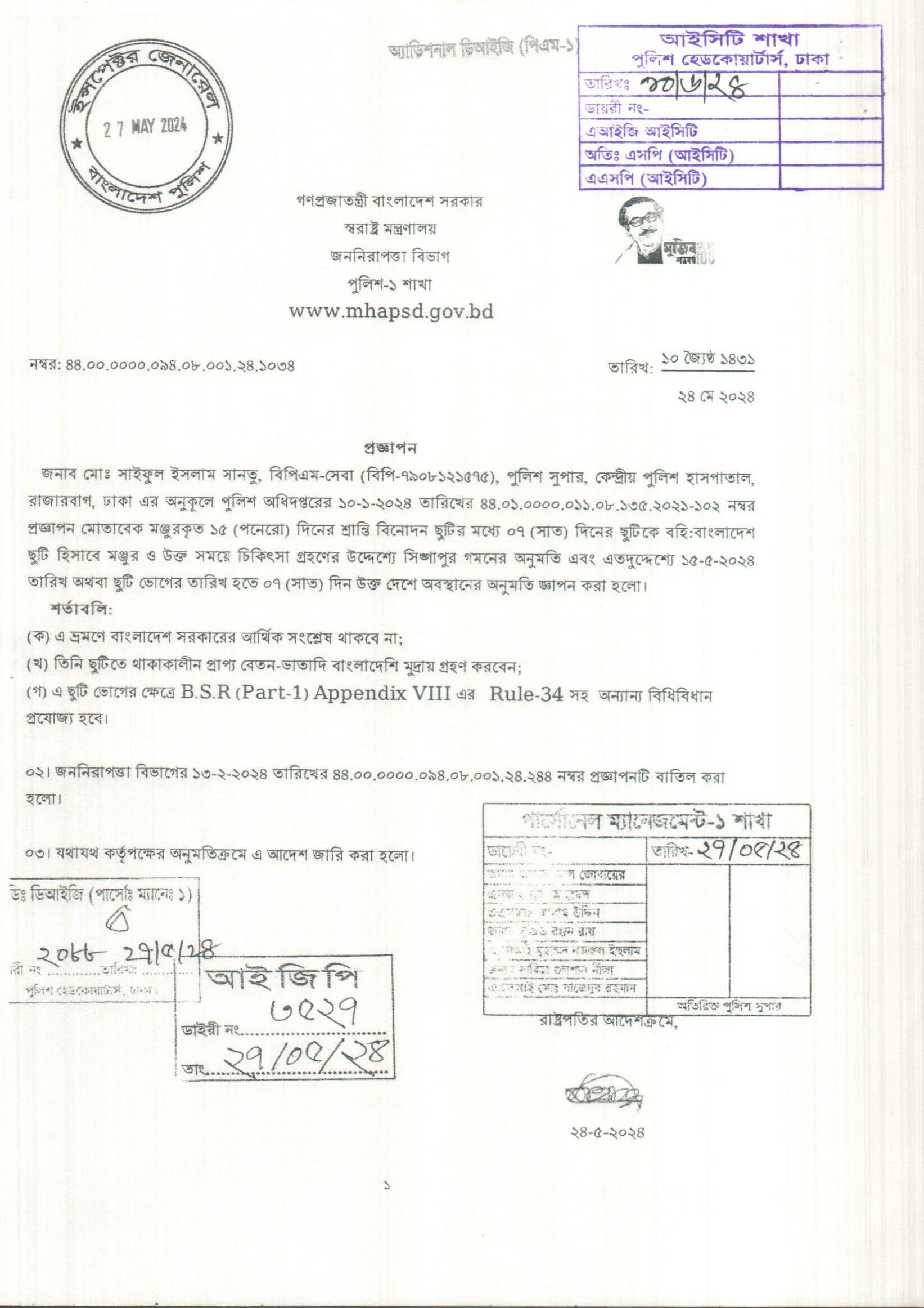 বহিঃ বাংলাদেশ ছুটি, প্রজ্ঞাপন নং- ১০৩৪, তারিখঃ ২৪/০৫/২০২৪ খ্রিঃ।