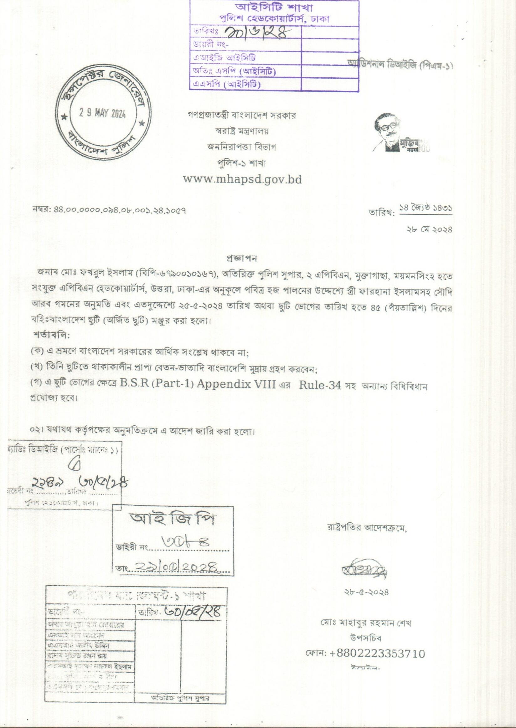 বহিঃ বাংলাদেশ ছুটি, প্রজ্ঞাপন নং- ১০৪৫, তারিখঃ ২৬/০৫/২০২৪ খ্রিঃ।