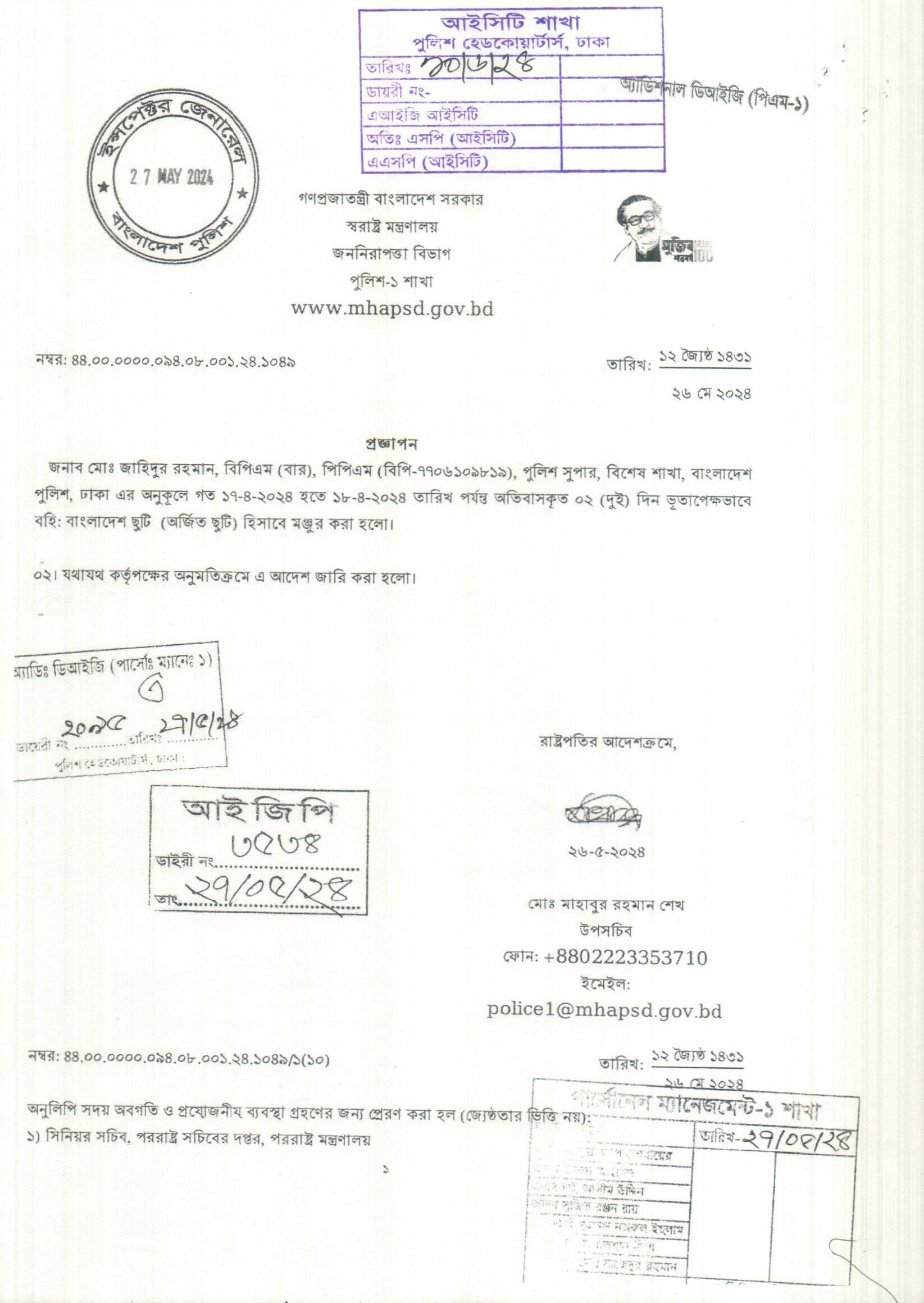 বহিঃ বাংলাদেশ ছুটি, প্রজ্ঞাপন নং- ১০৫৩, তারিখঃ ২৭/০৫/২০২৪ খ্রিঃ।
