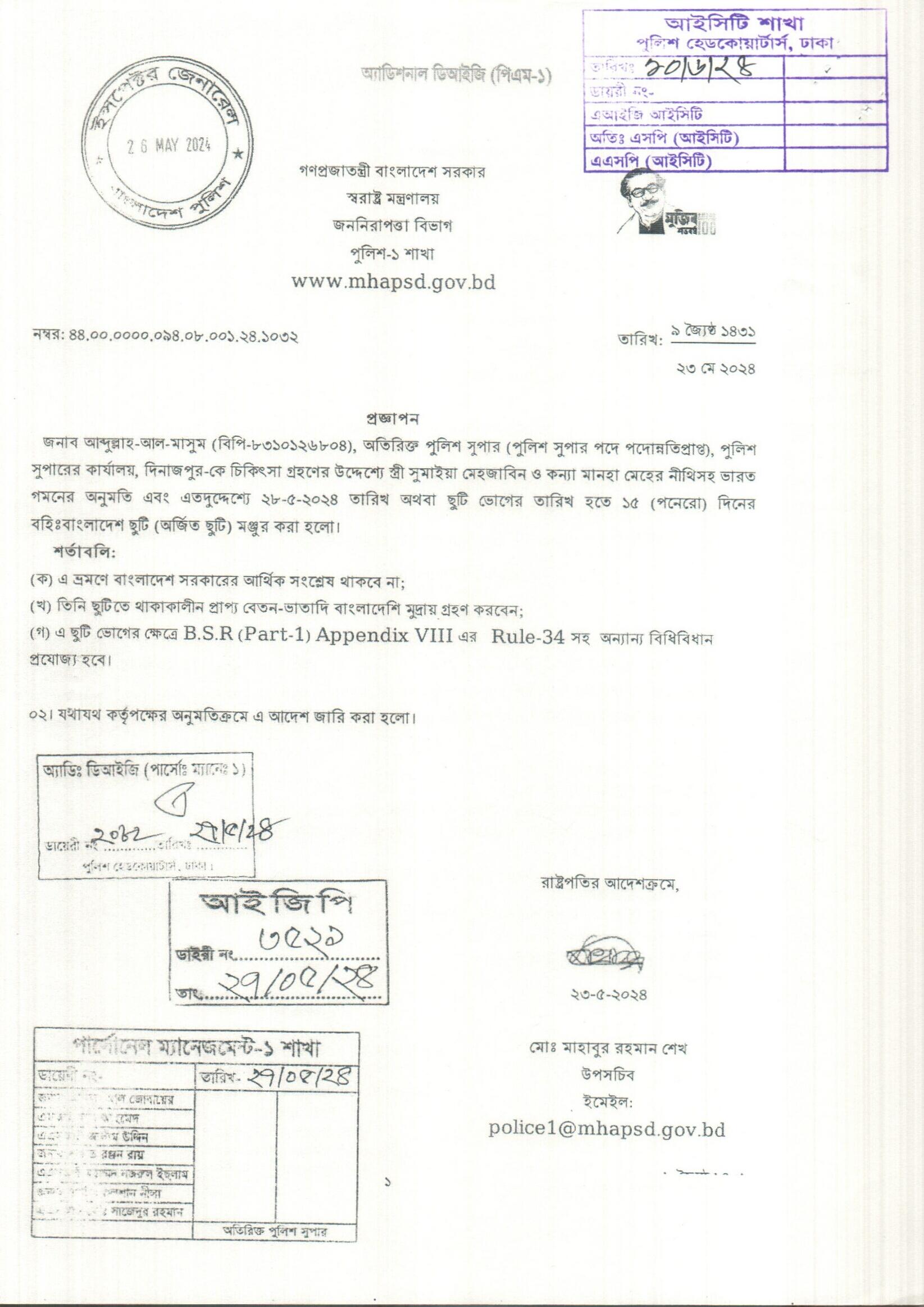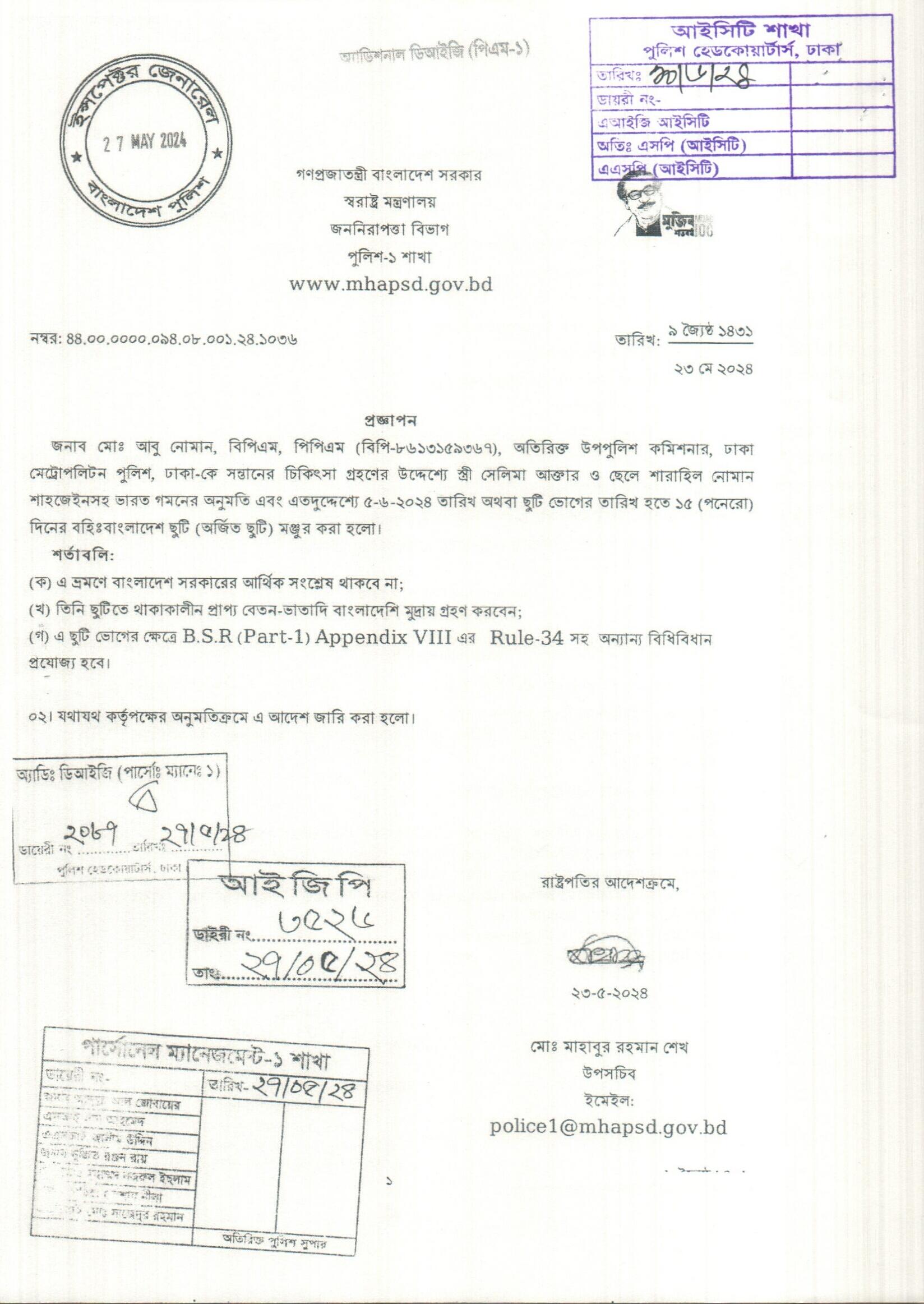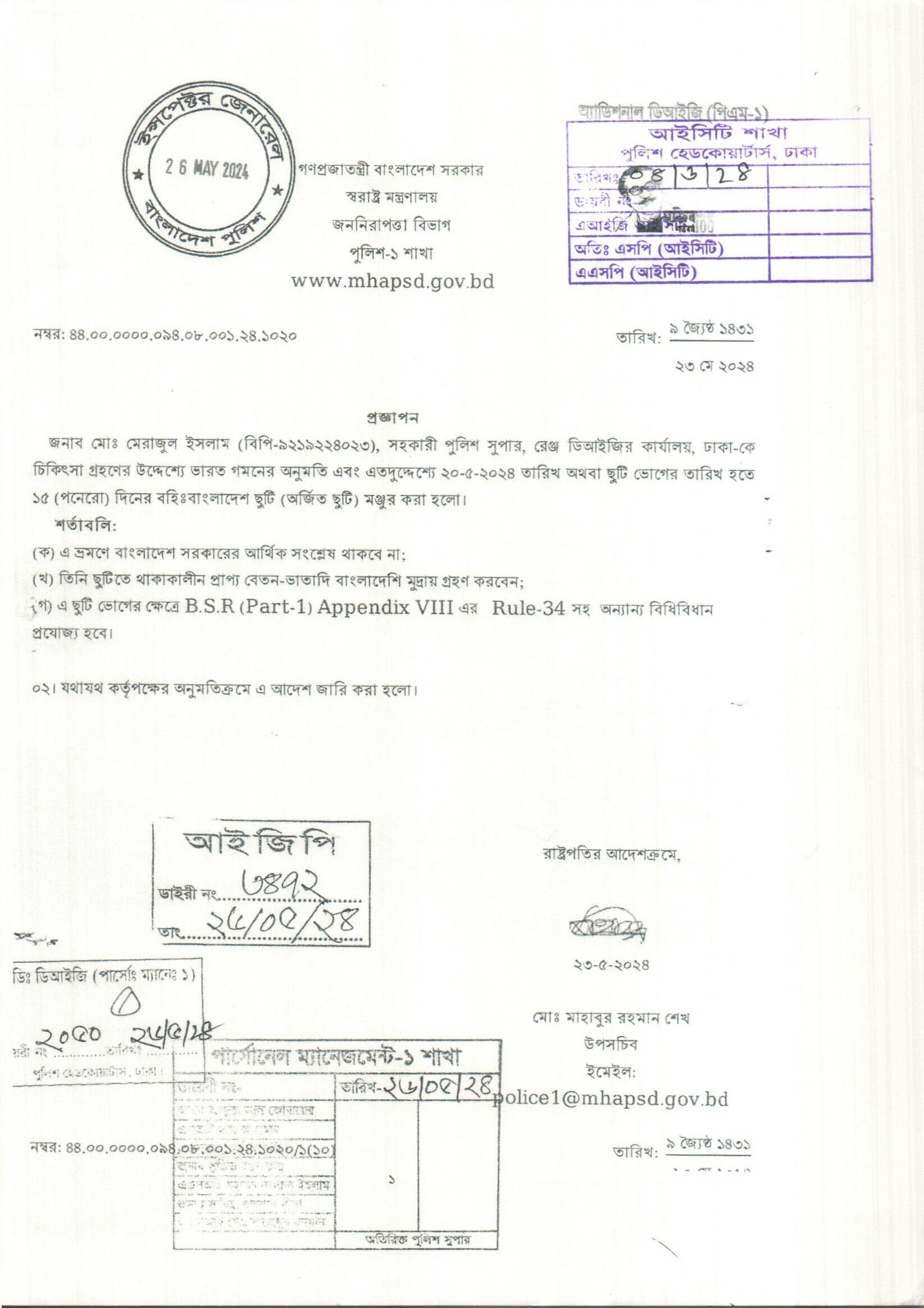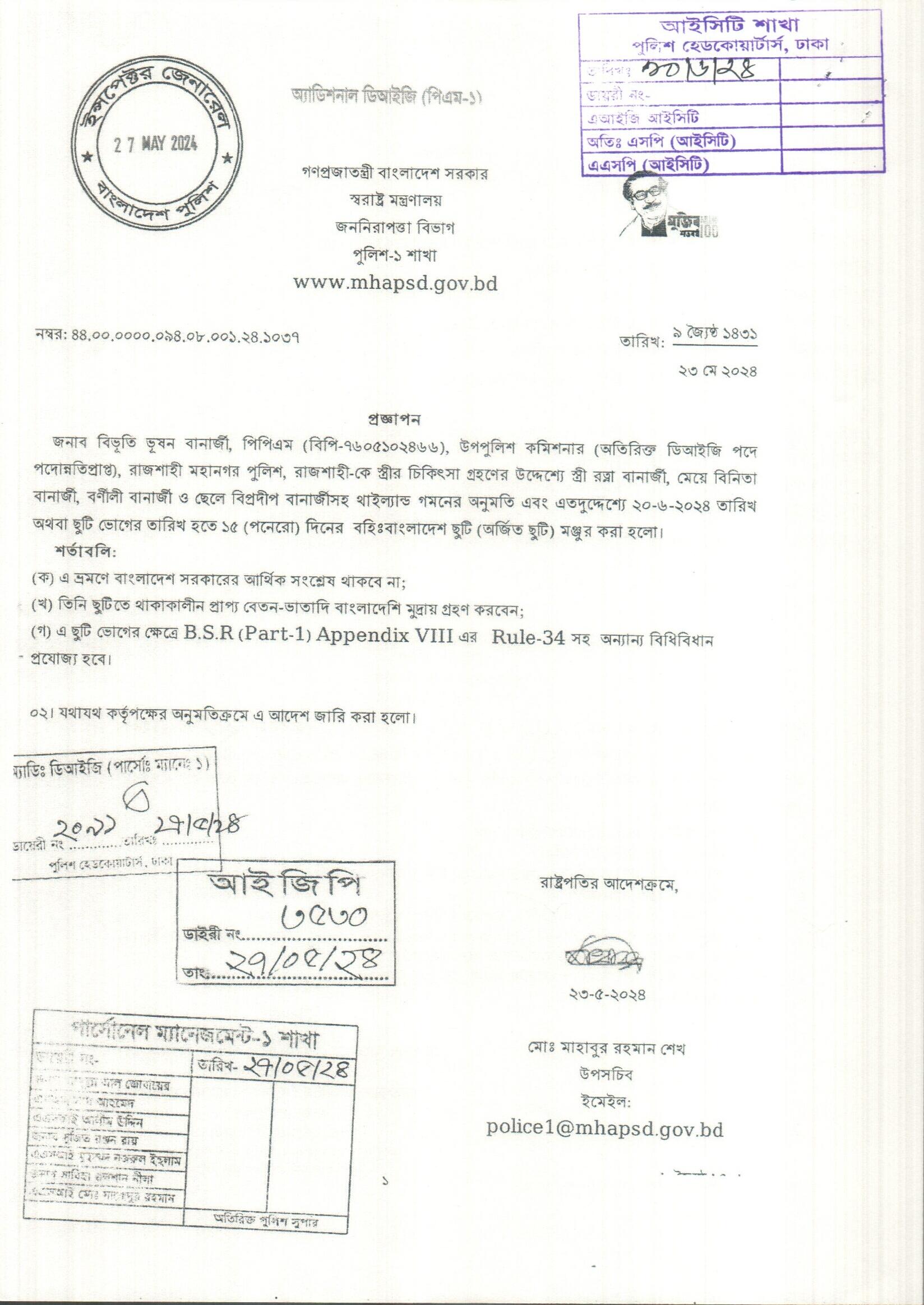 বহিঃ বাংলাদেশ ছুটি, প্রজ্ঞাপন নং- ১০৩৭, তারিখঃ ২৩/০৫/২০২৪ খ্রিঃ।