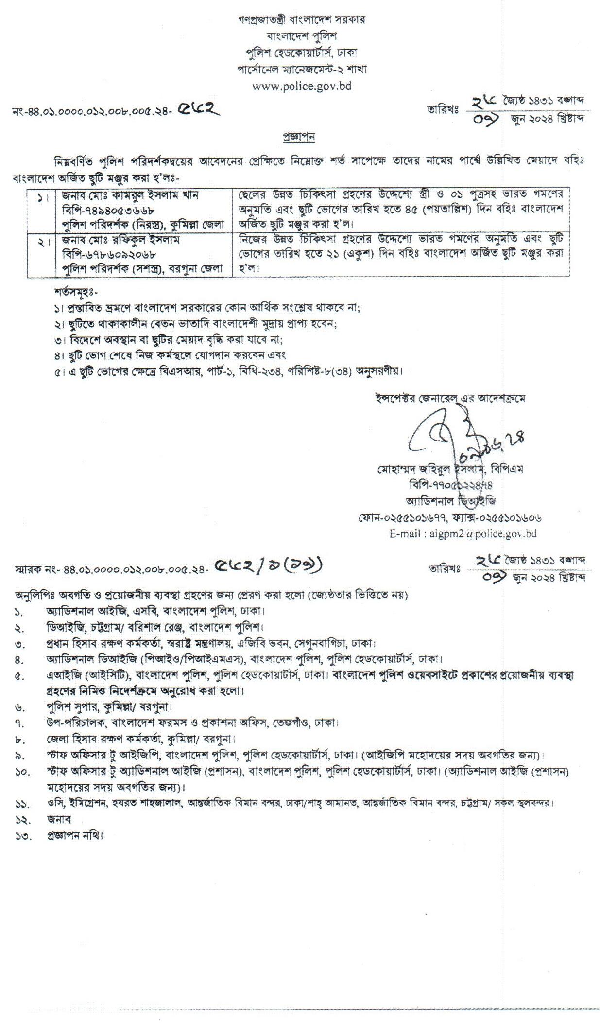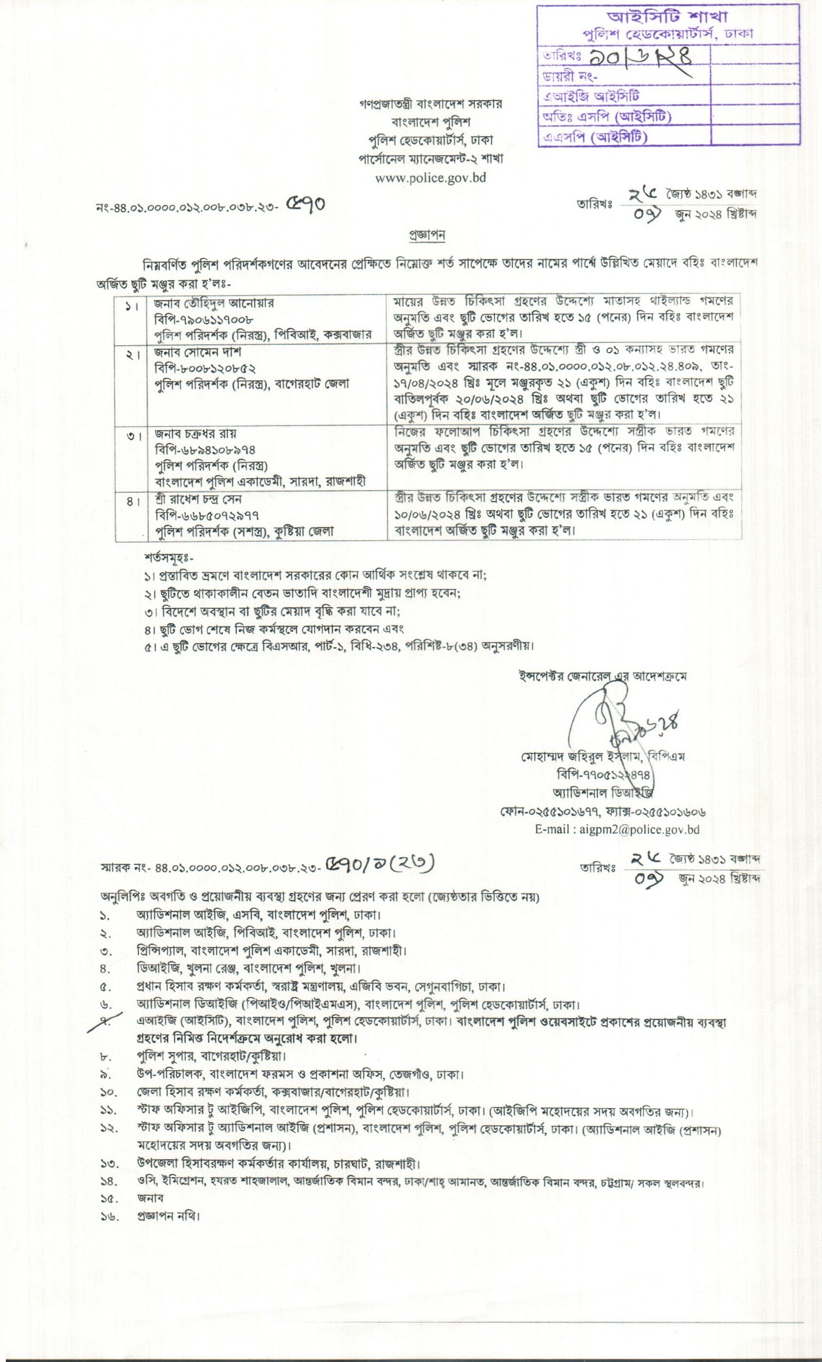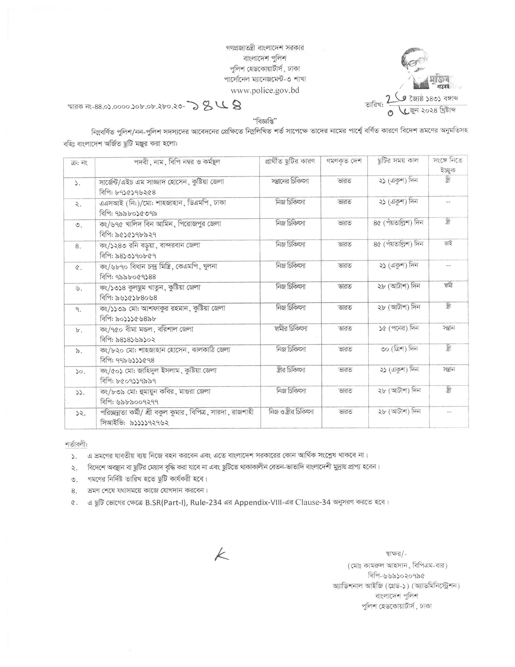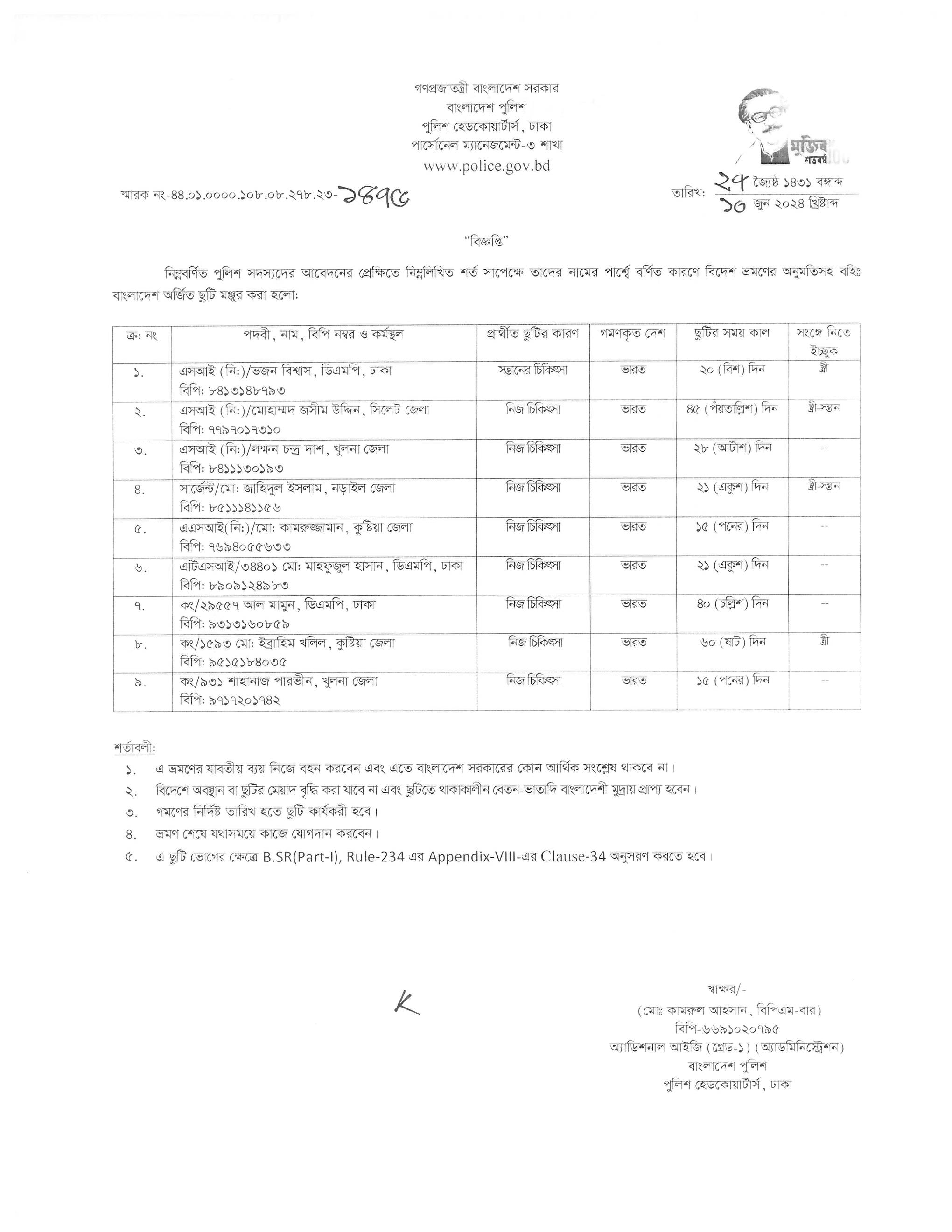 বহিঃ বাংলাদেশ ছুটি, বিজ্ঞপ্তি নং- ১৪৭৫ , তারিখঃ ০৯/০৬/২০২৪ খ্রিঃ।