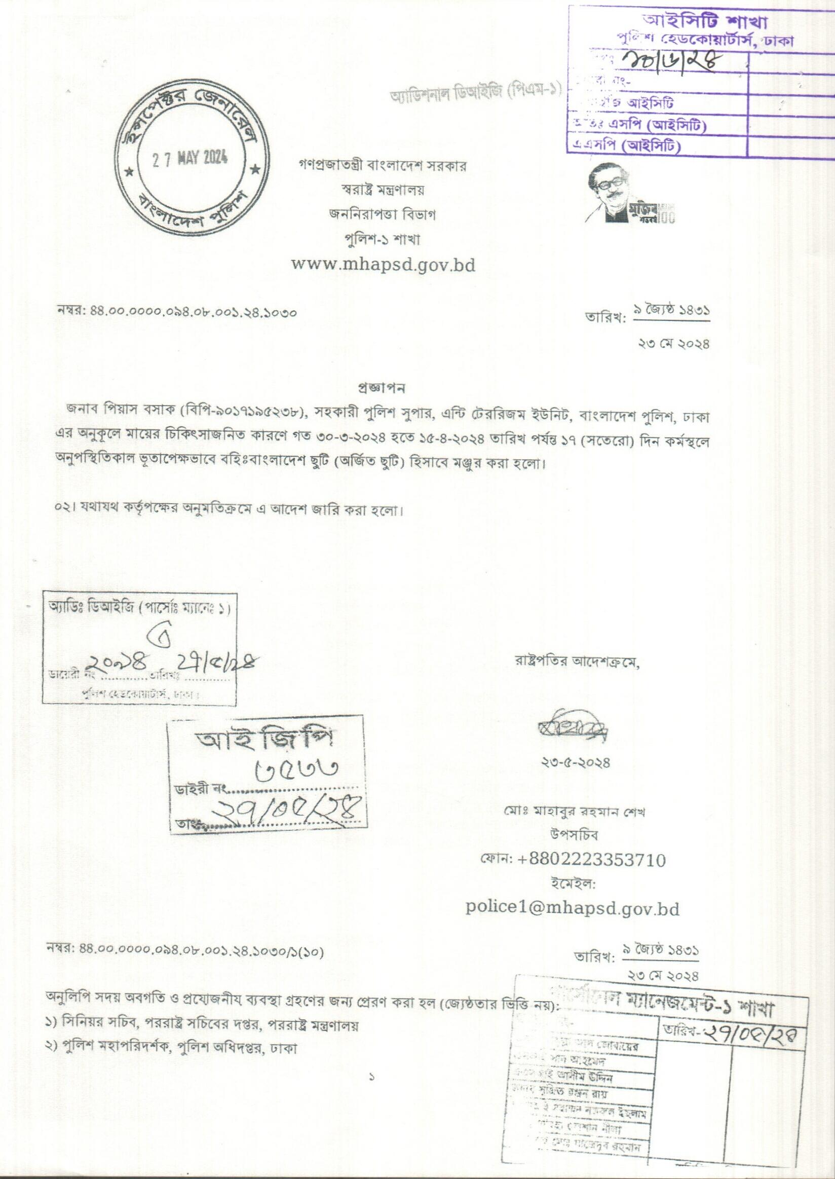 বহিঃ বাংলাদেশ ছুটি, প্রজ্ঞাপন নং- ১০২৮, তারিখঃ ২৩/০৫/২০২৪ খ্রিঃ।