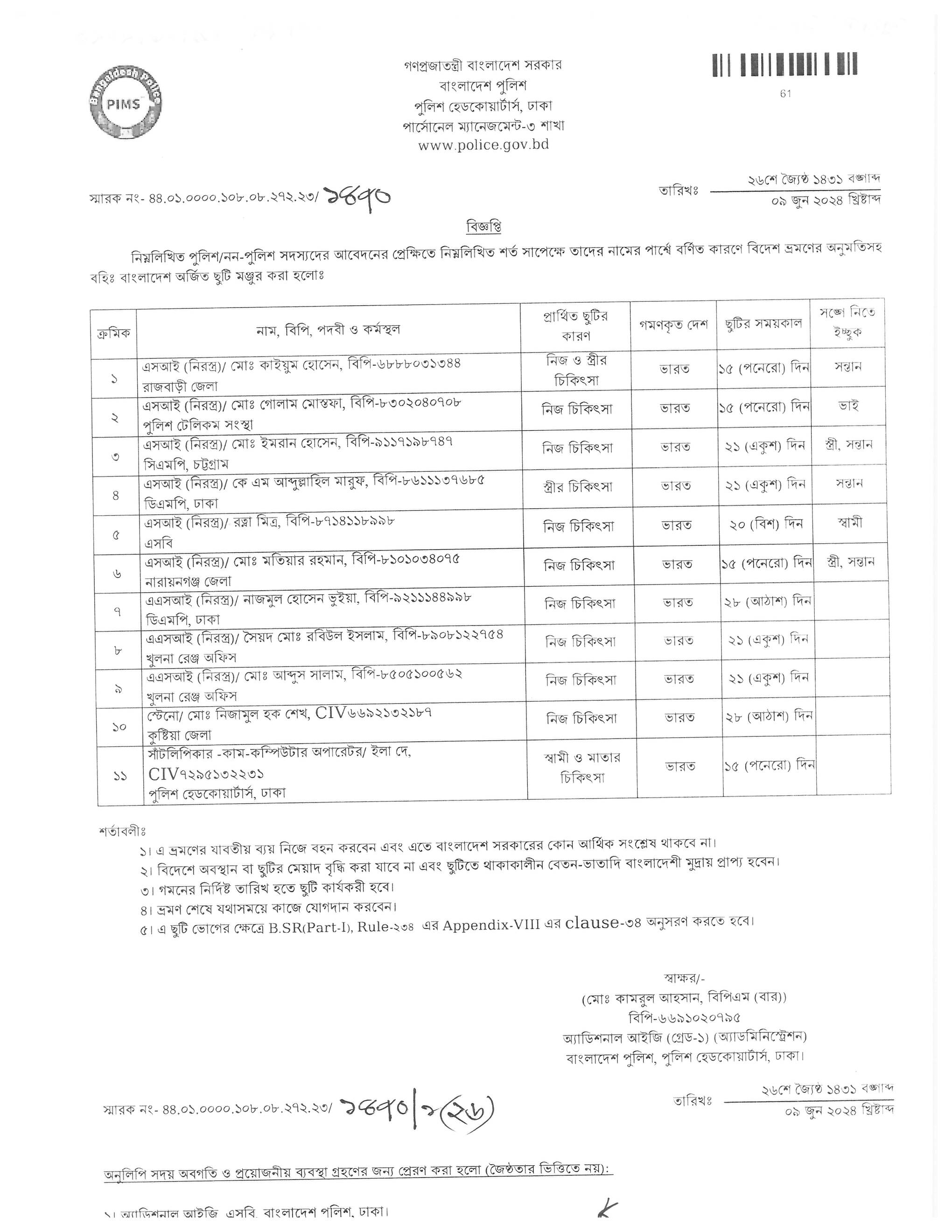 বহিঃ বাংলাদেশ ছুটি, বিজ্ঞপ্তি নং- ১৪৬৫ , তারিখঃ ০৬/০৬/২০২৪ খ্রিঃ।