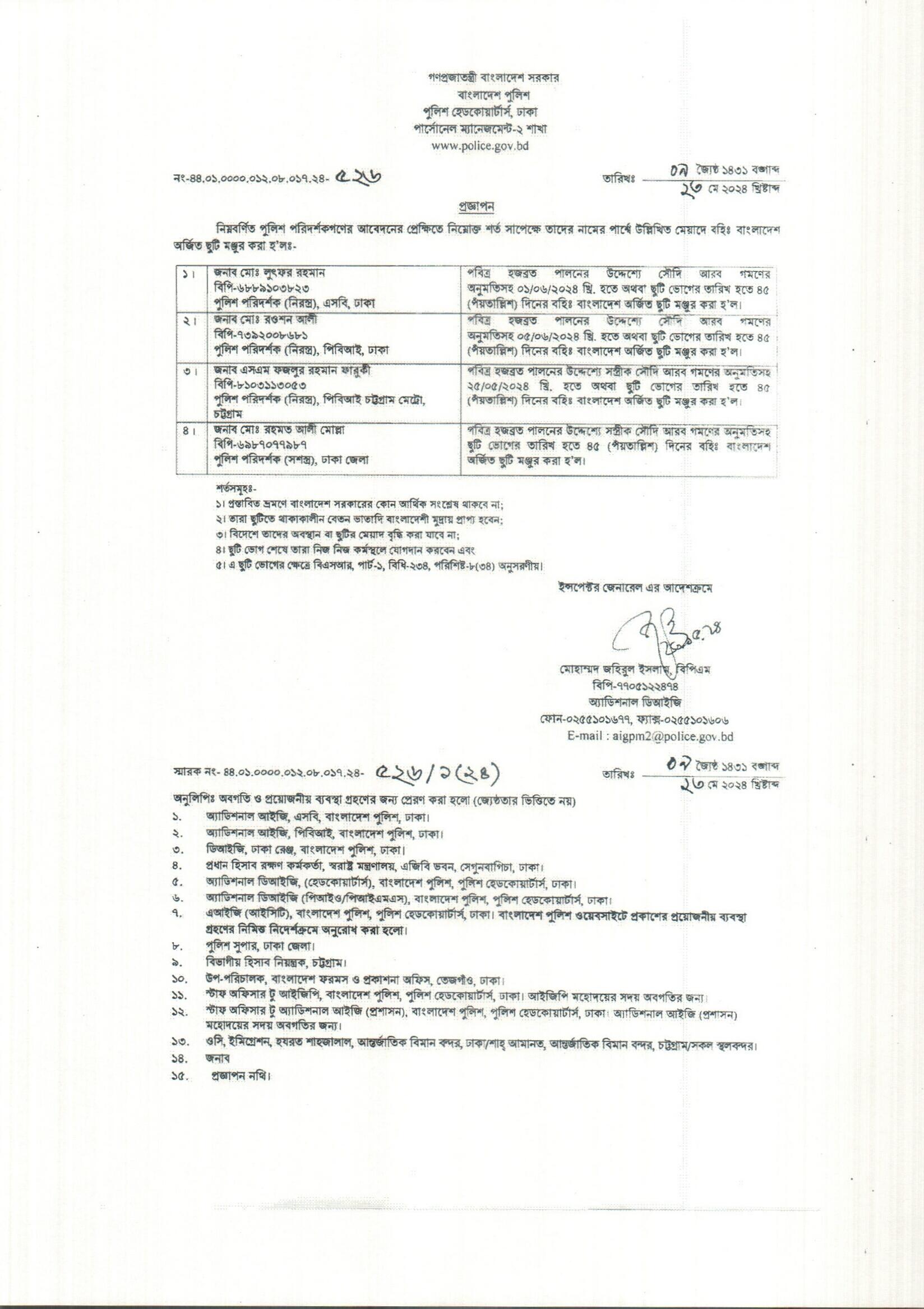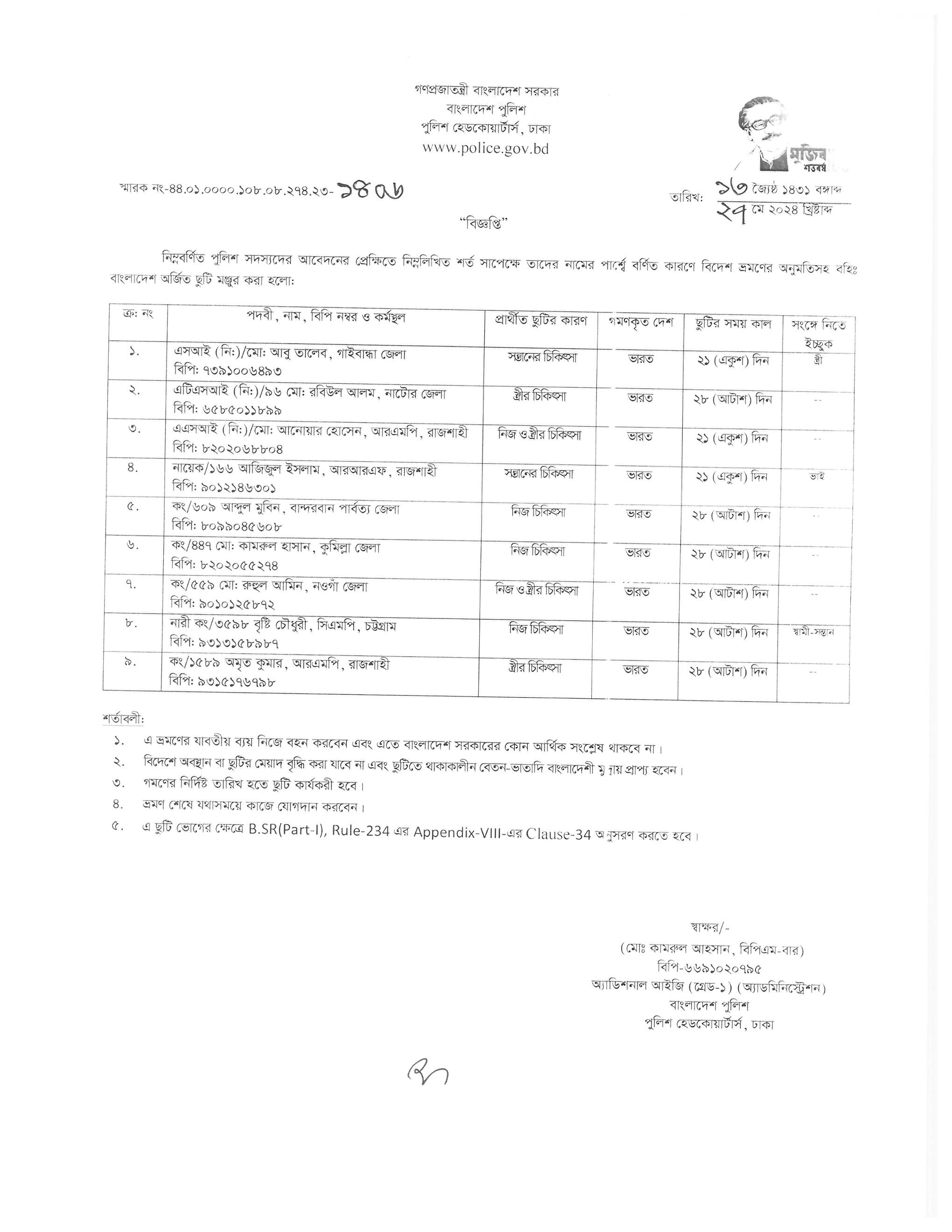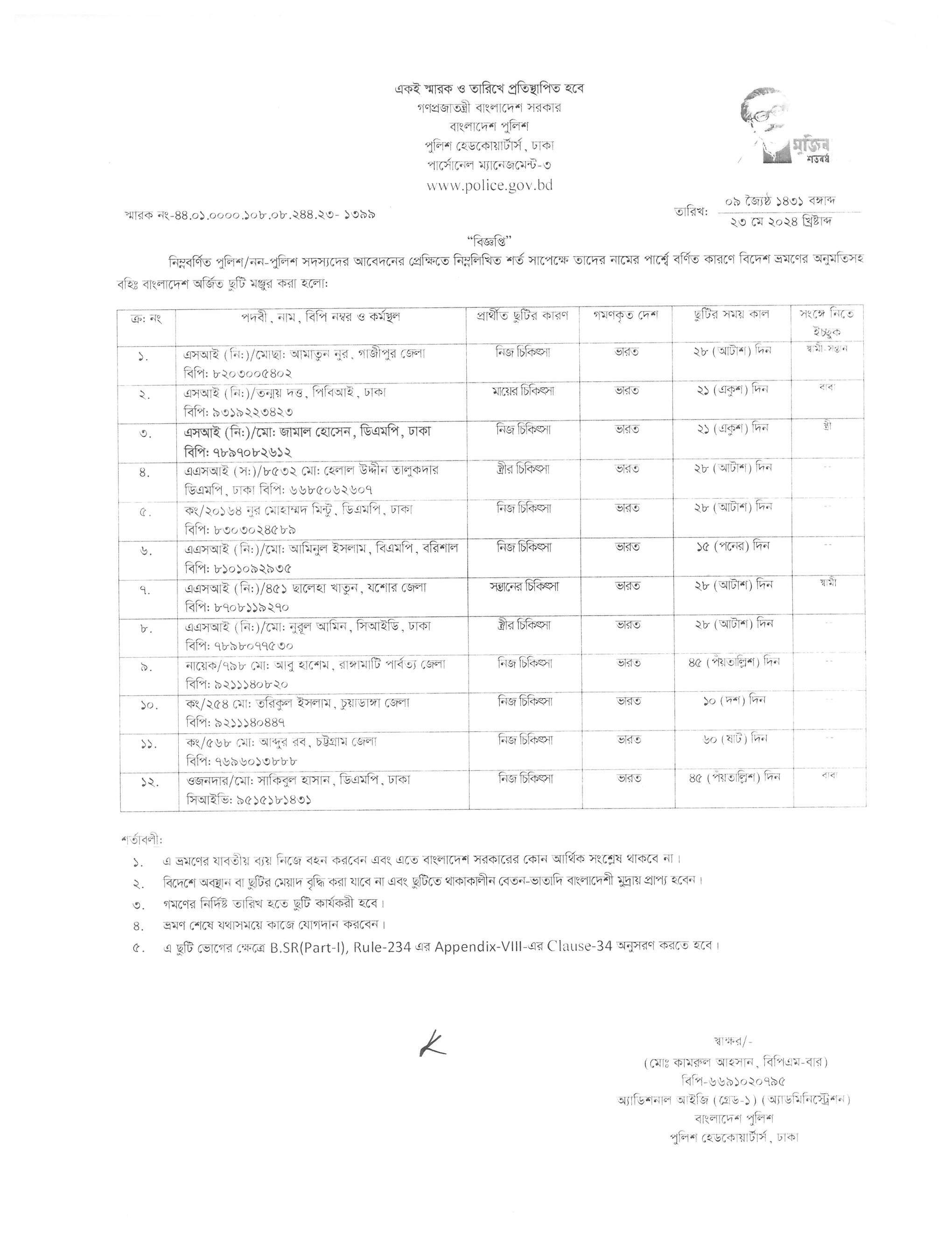 বহিঃ বাংলাদেশ গমন, বিজ্ঞপ্তি নং- ১৪০৮ , তারিখঃ ২৭/০৫/২০২৪ খ্রিঃ।