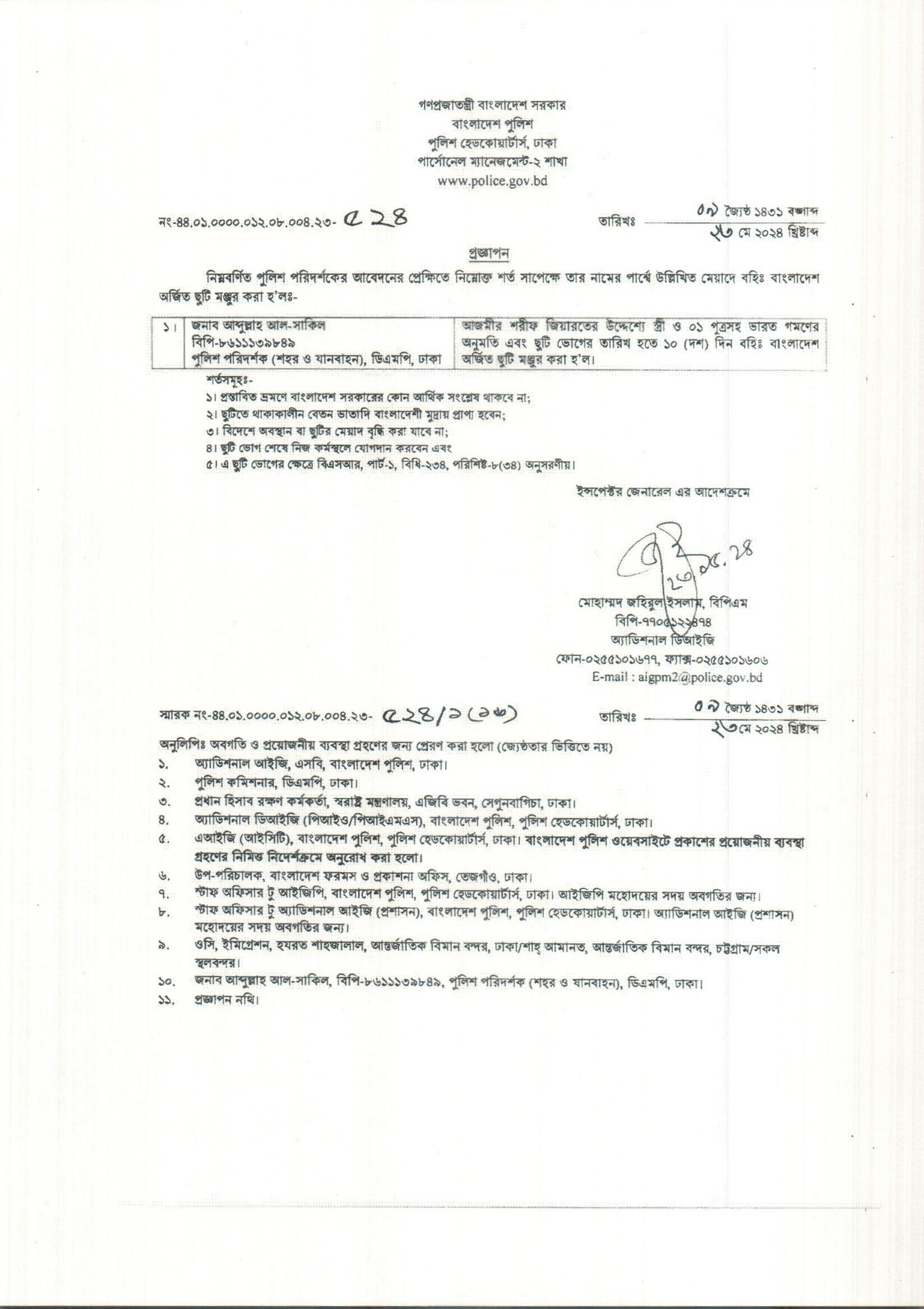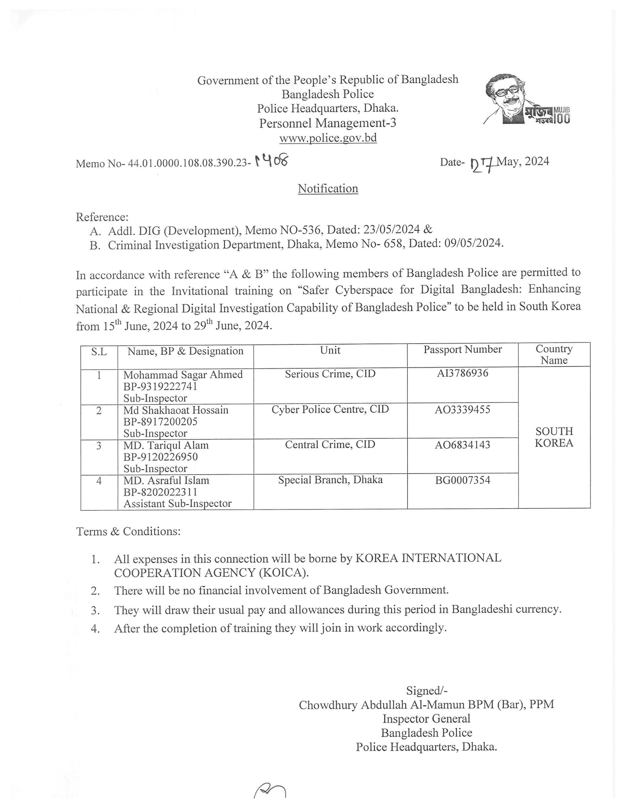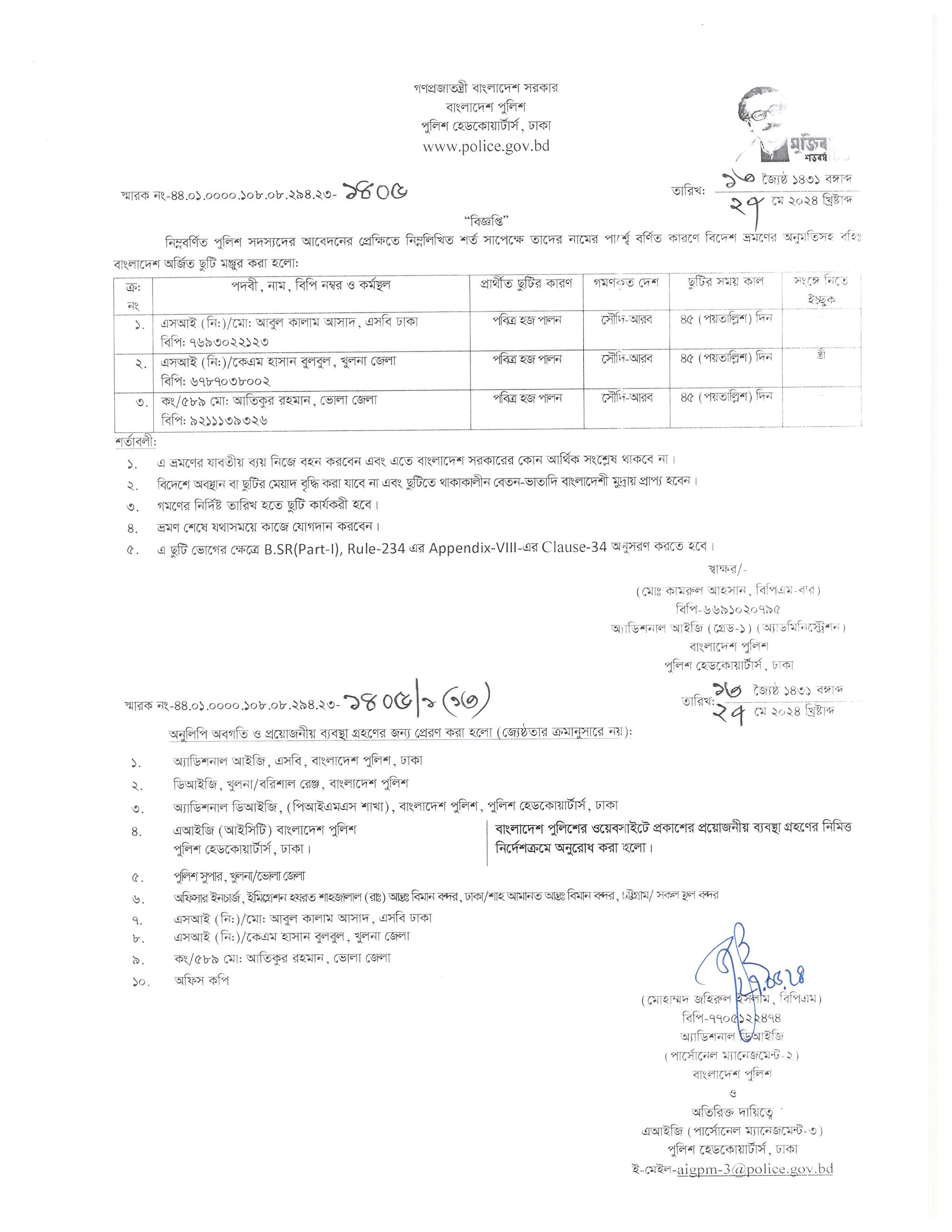 বহিঃ বাংলাদেশ গমন, বিজ্ঞপ্তি নং- ১৪০৮ , তারিখঃ ২৭/০৫/২০২৪ খ্রিঃ।
