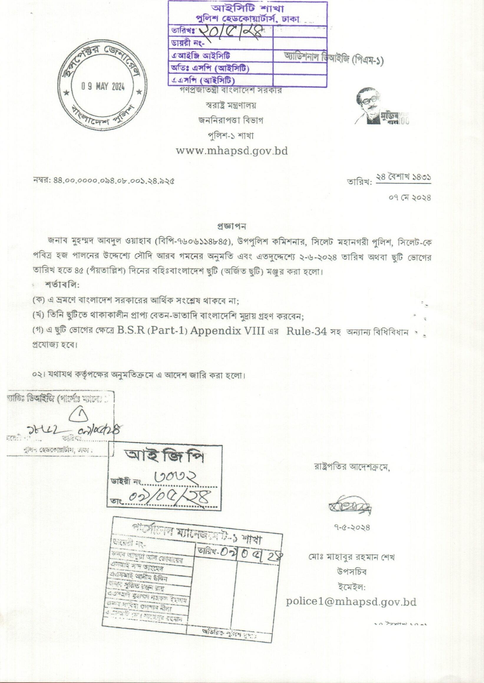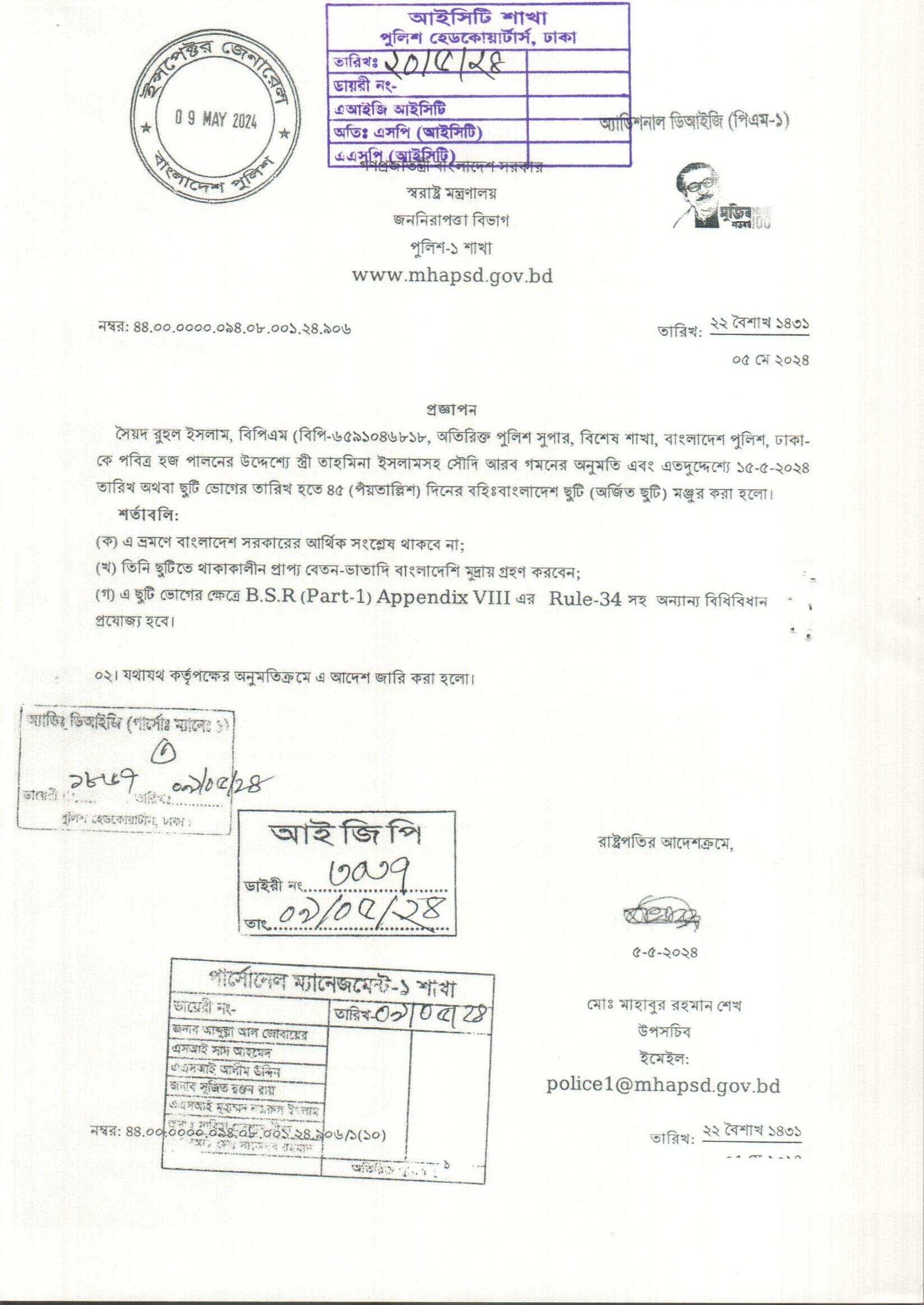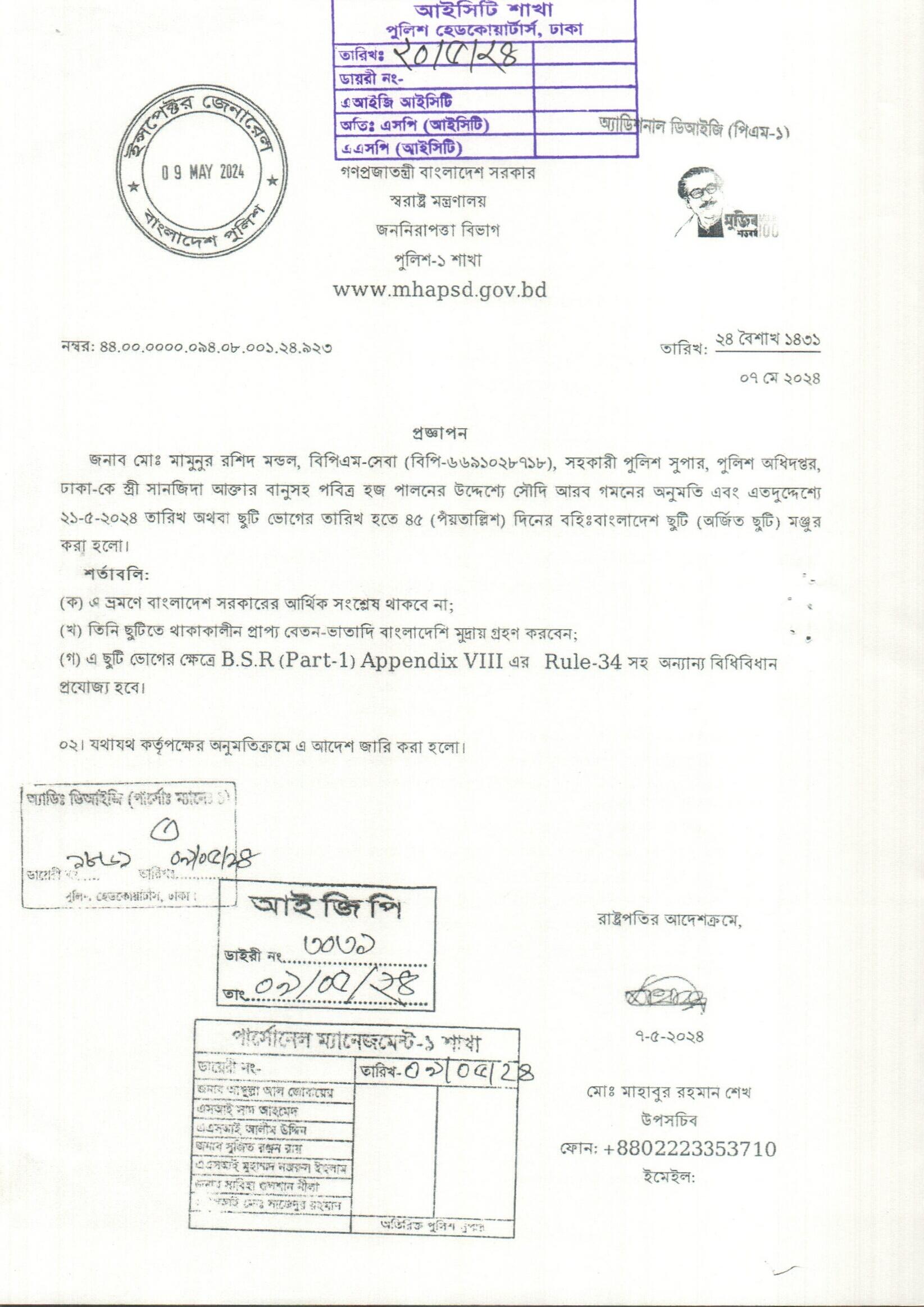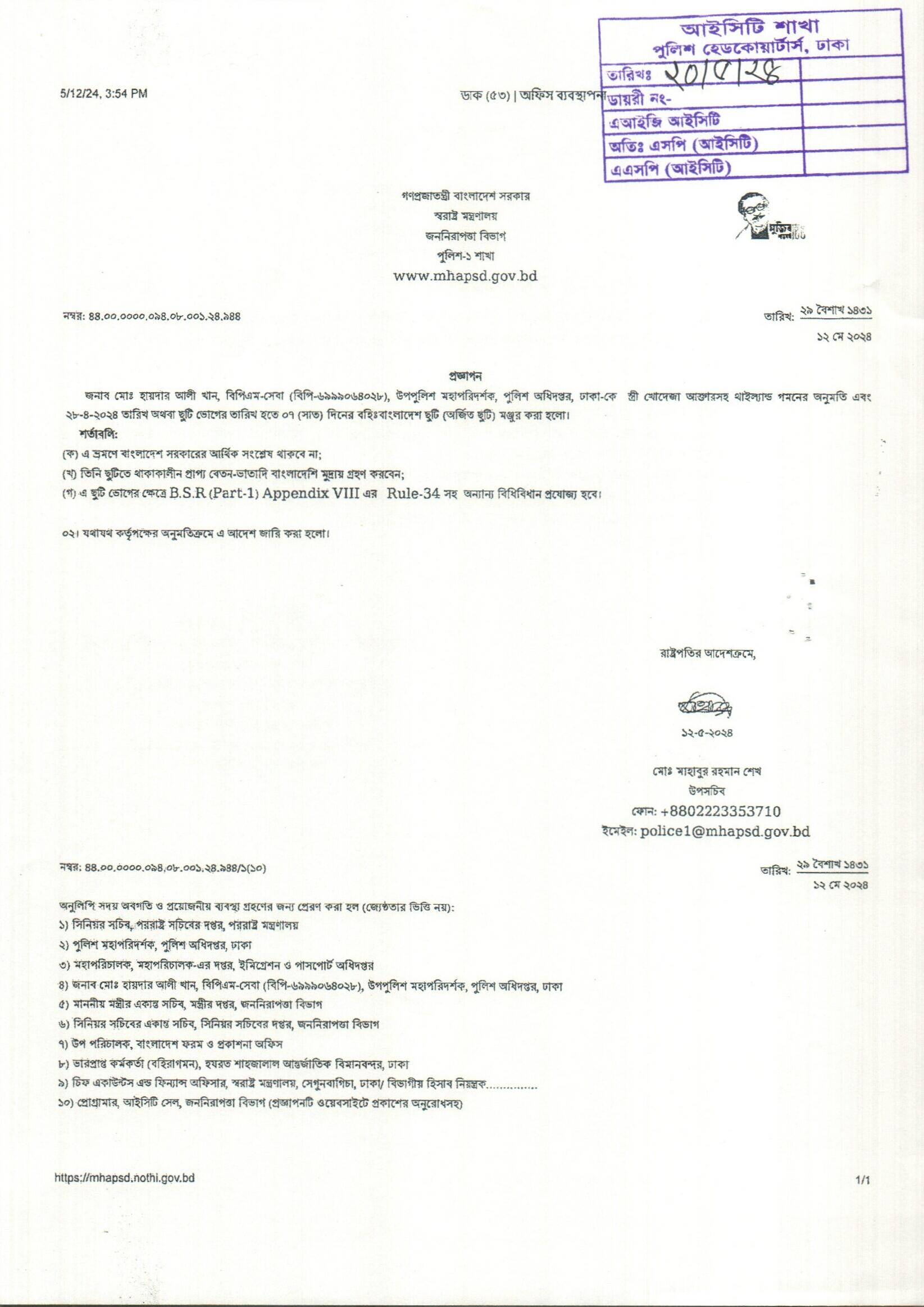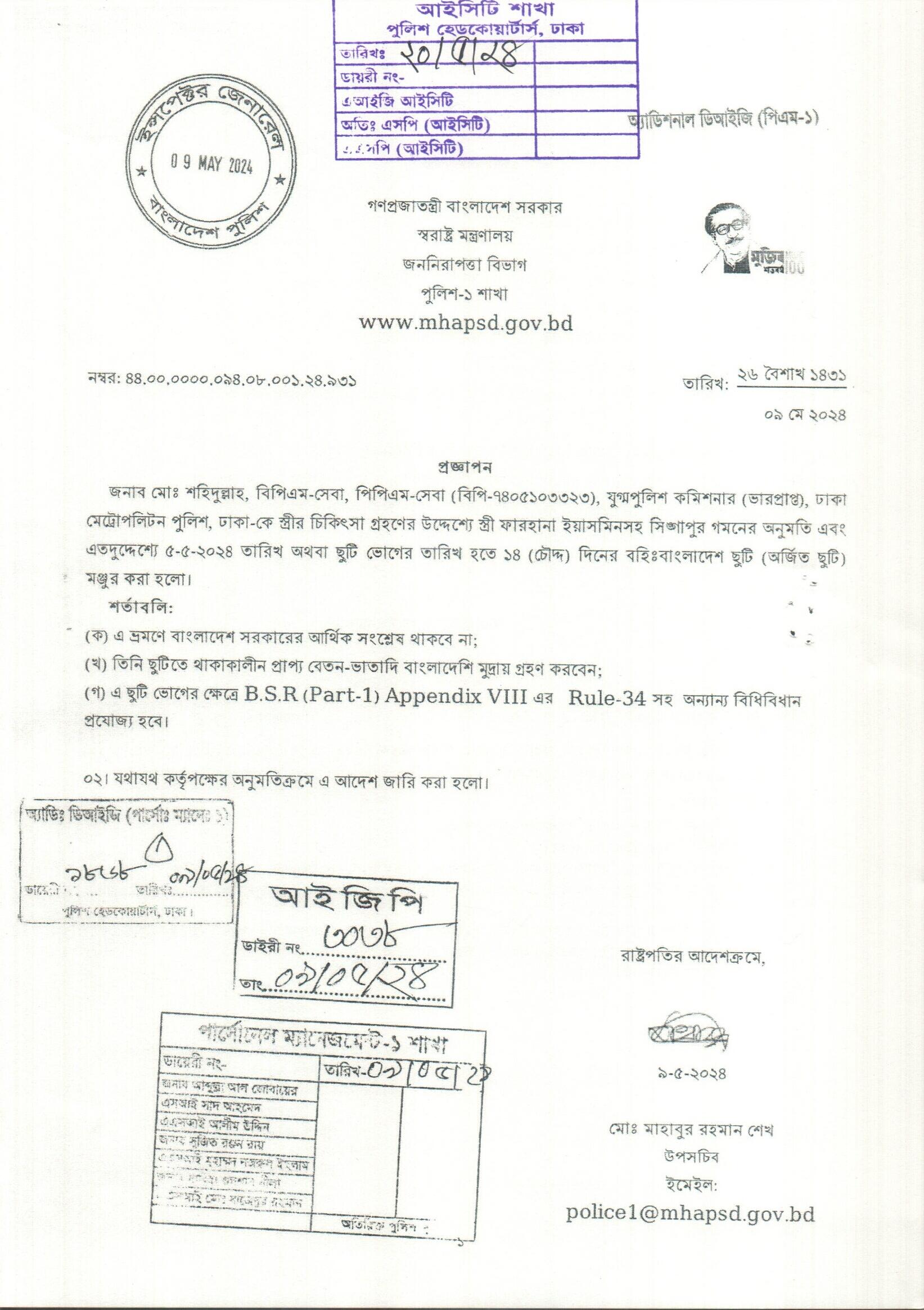বহিঃ বাংলাদেশ ছুটি, প্রজ্ঞাপন নং- ৯৩১, তারিখঃ ০৯/০৫/২০২৪ খ্রিঃ।