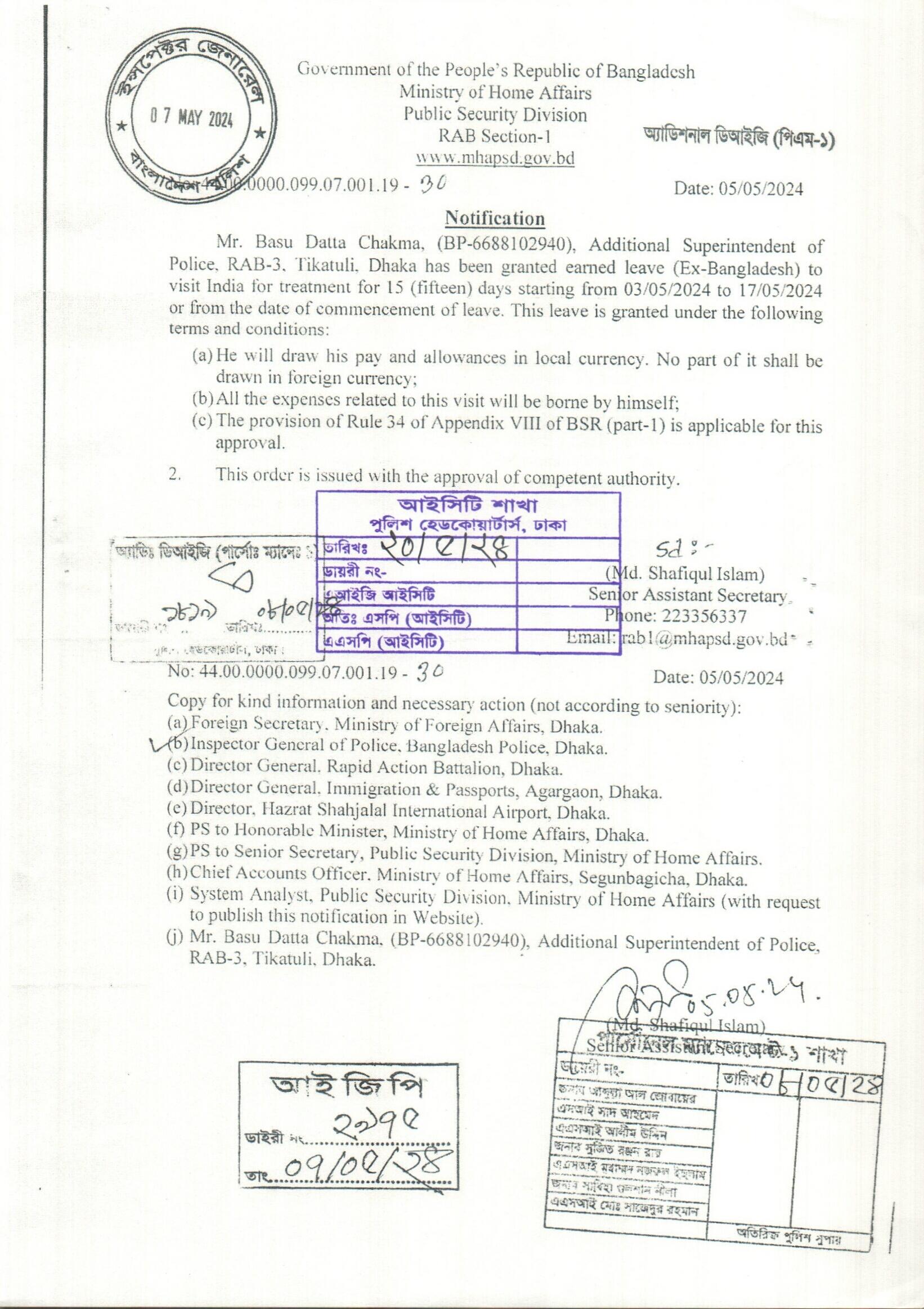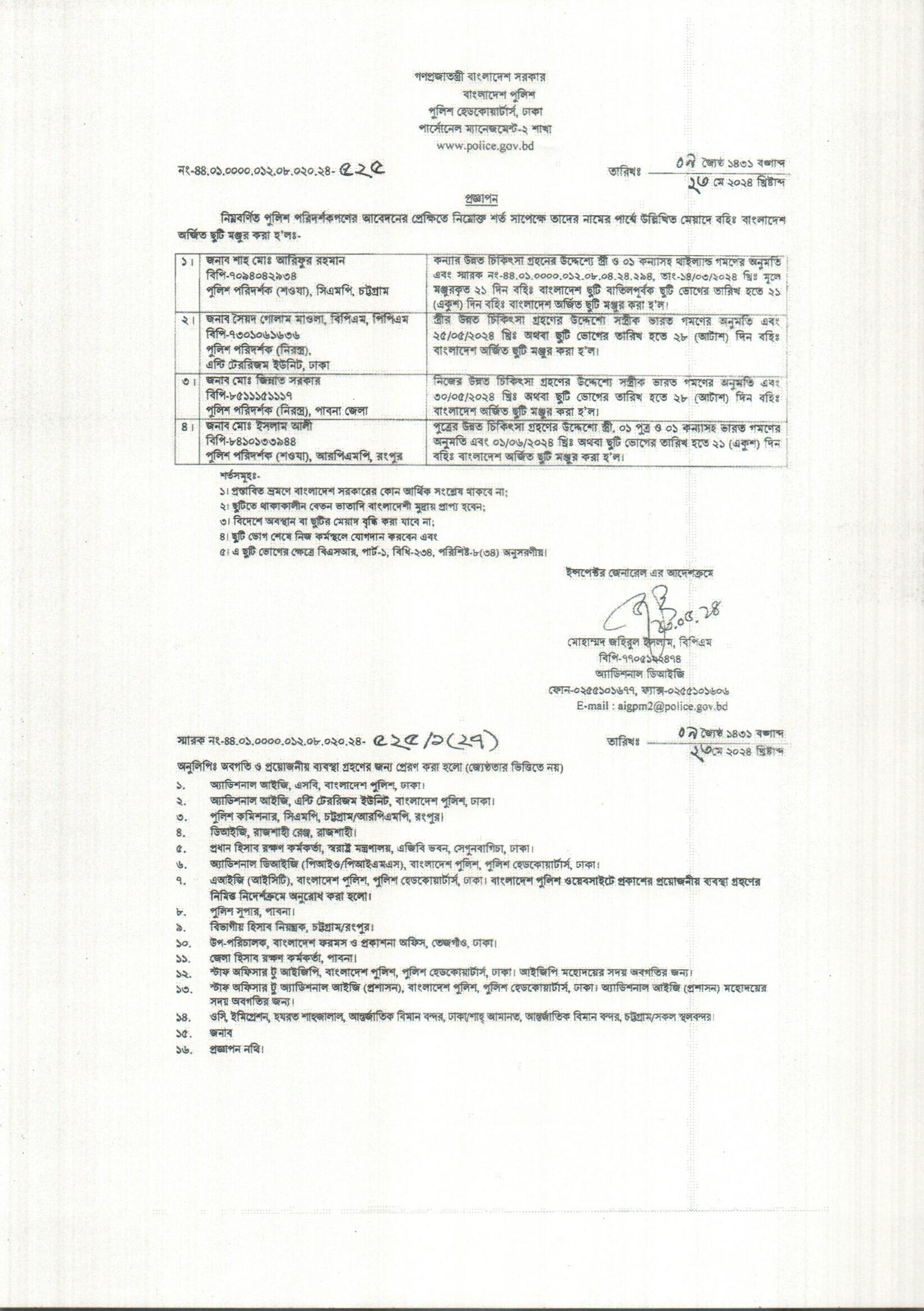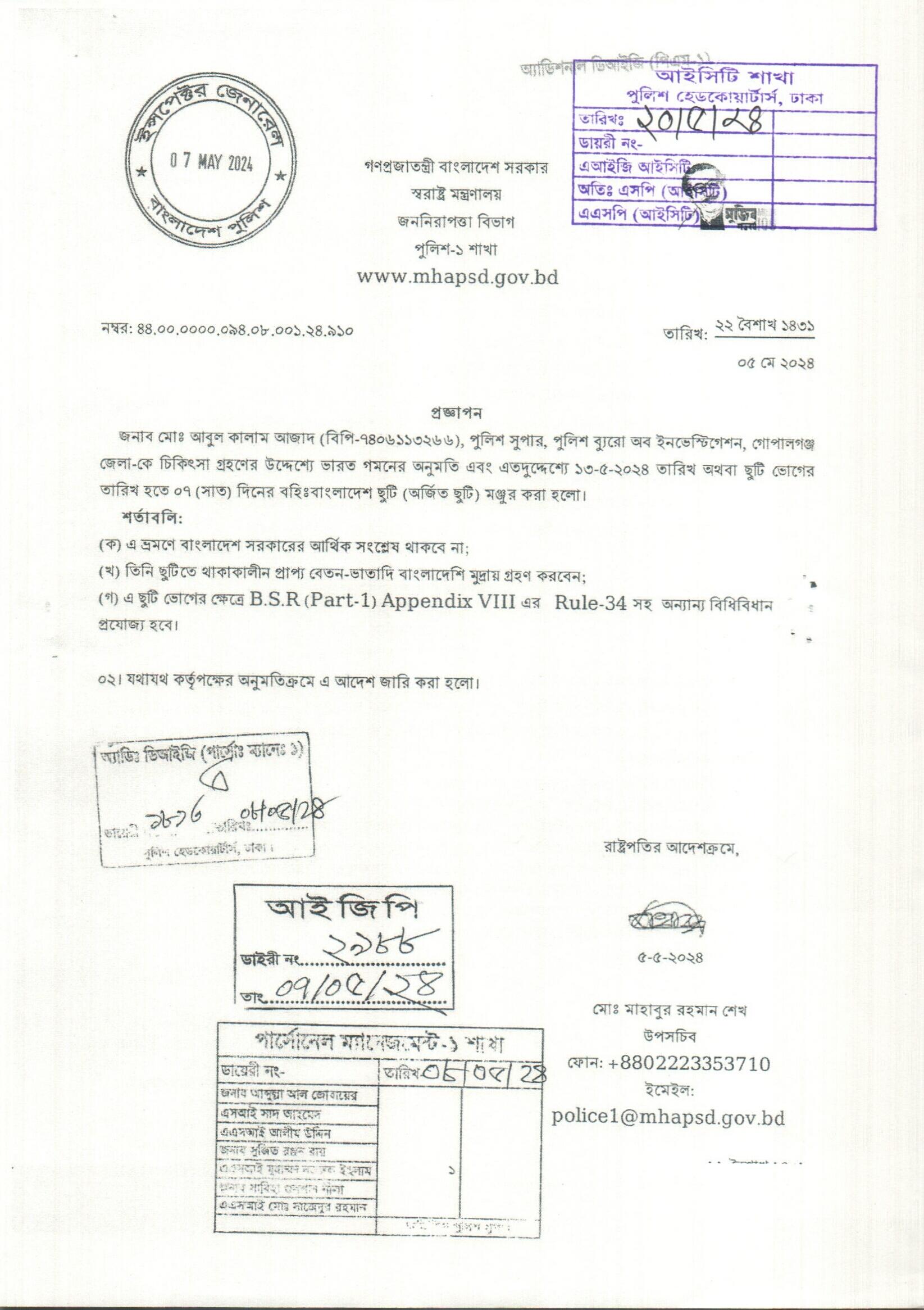 বহিঃ বাংলাদেশ ছুটি, প্রজ্ঞাপন নং- ৯২৩, তারিখঃ ০৭/০৫/২০২৪ খ্রিঃ।