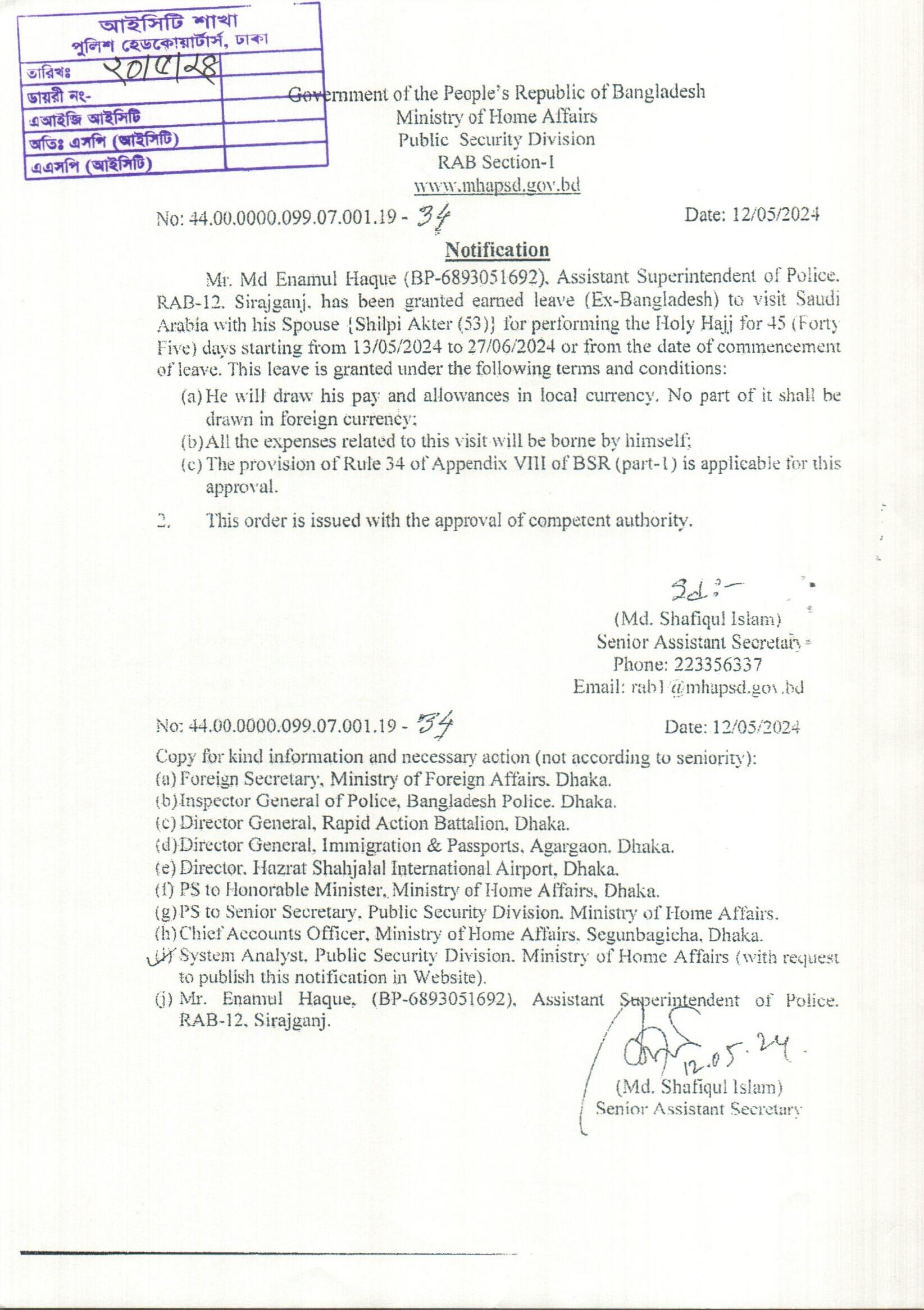 বহিঃ বাংলাদেশ ছুটি, প্রজ্ঞাপন নং- ৩৪, তারিখঃ ১২/০৫/২০২৪ খ্রিঃ।