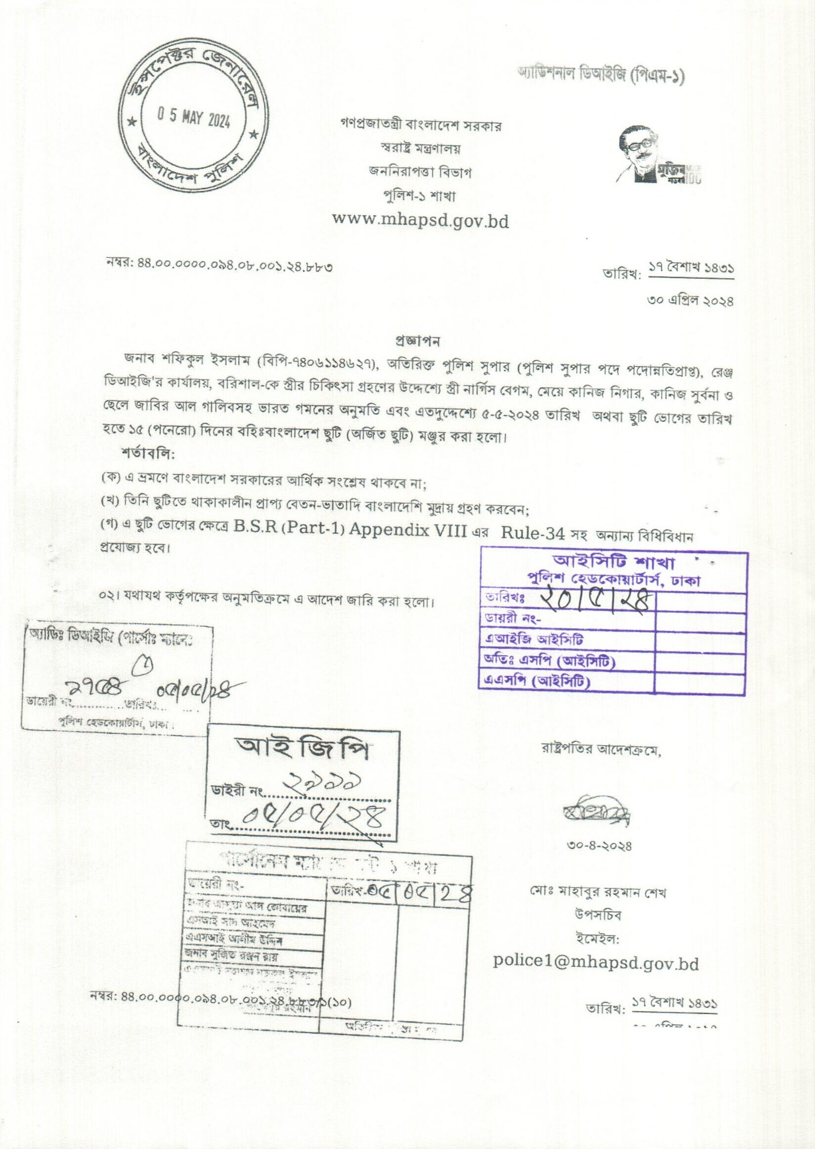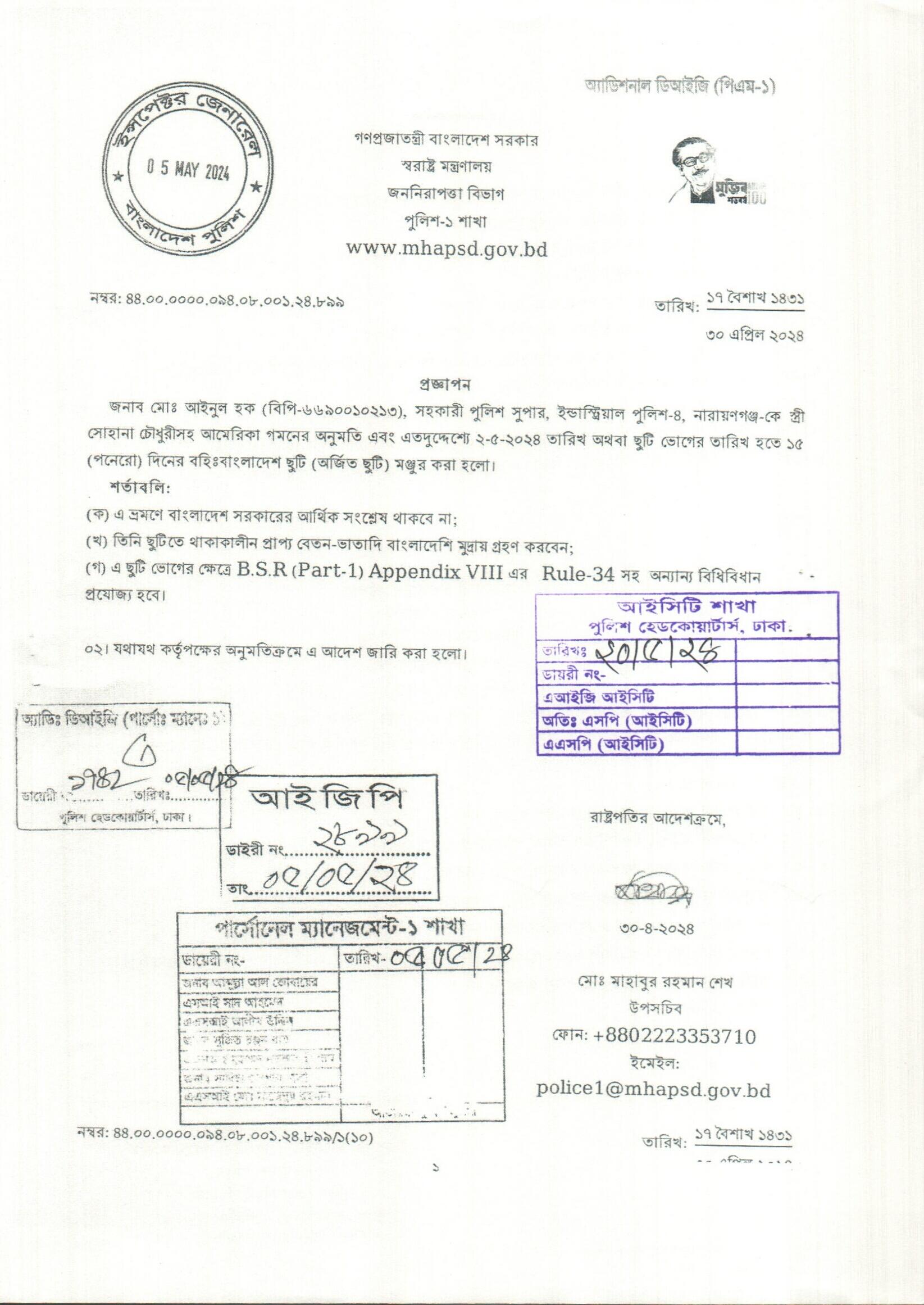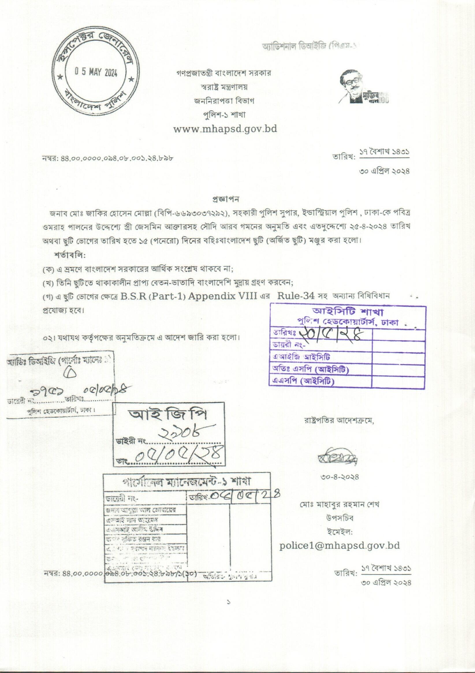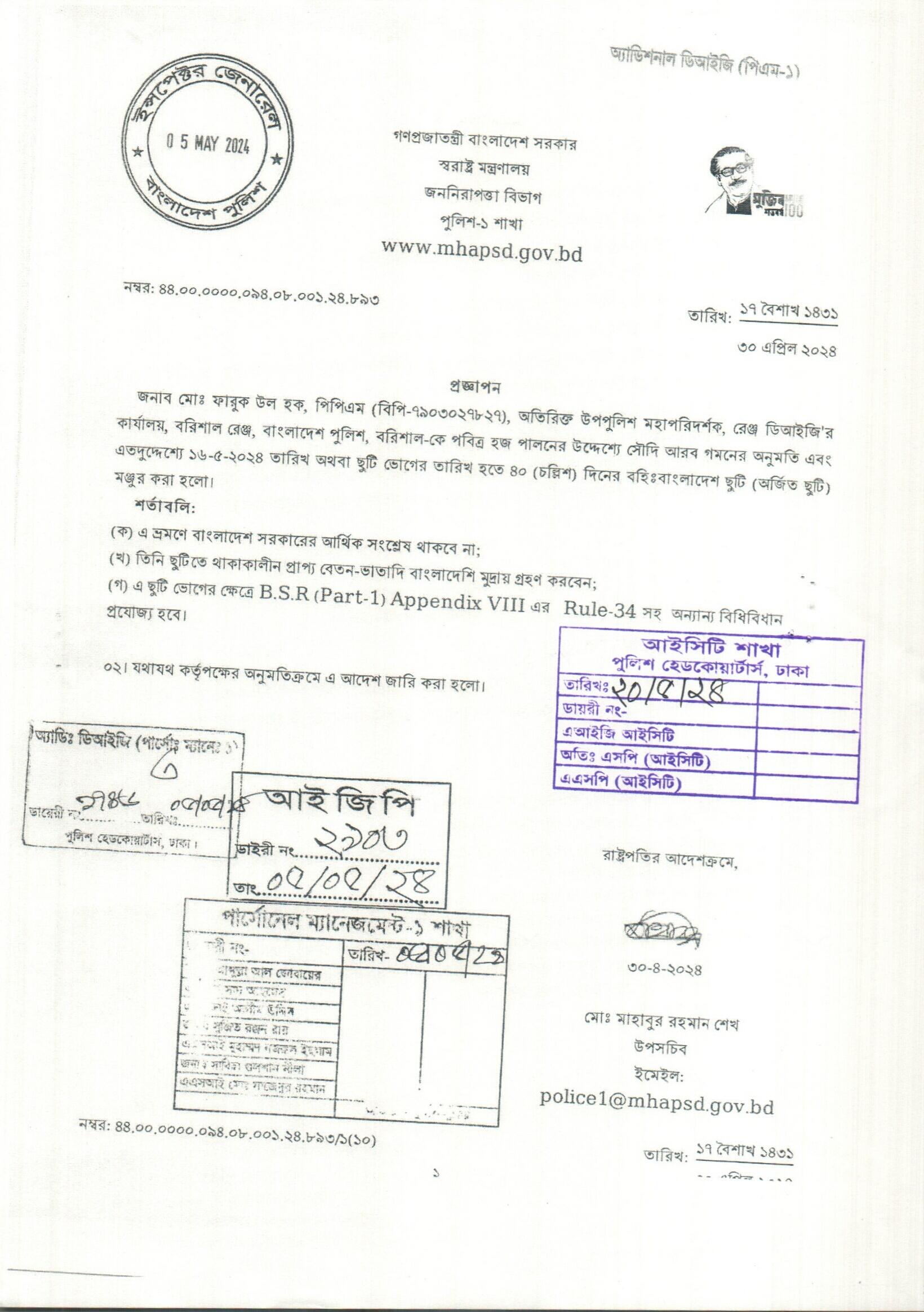 বহিঃ বাংলাদেশ ছুটি, প্রজ্ঞাপন নং- ৮৯৩, তারিখঃ ৩০/০৪/২০২৪ খ্রিঃ।