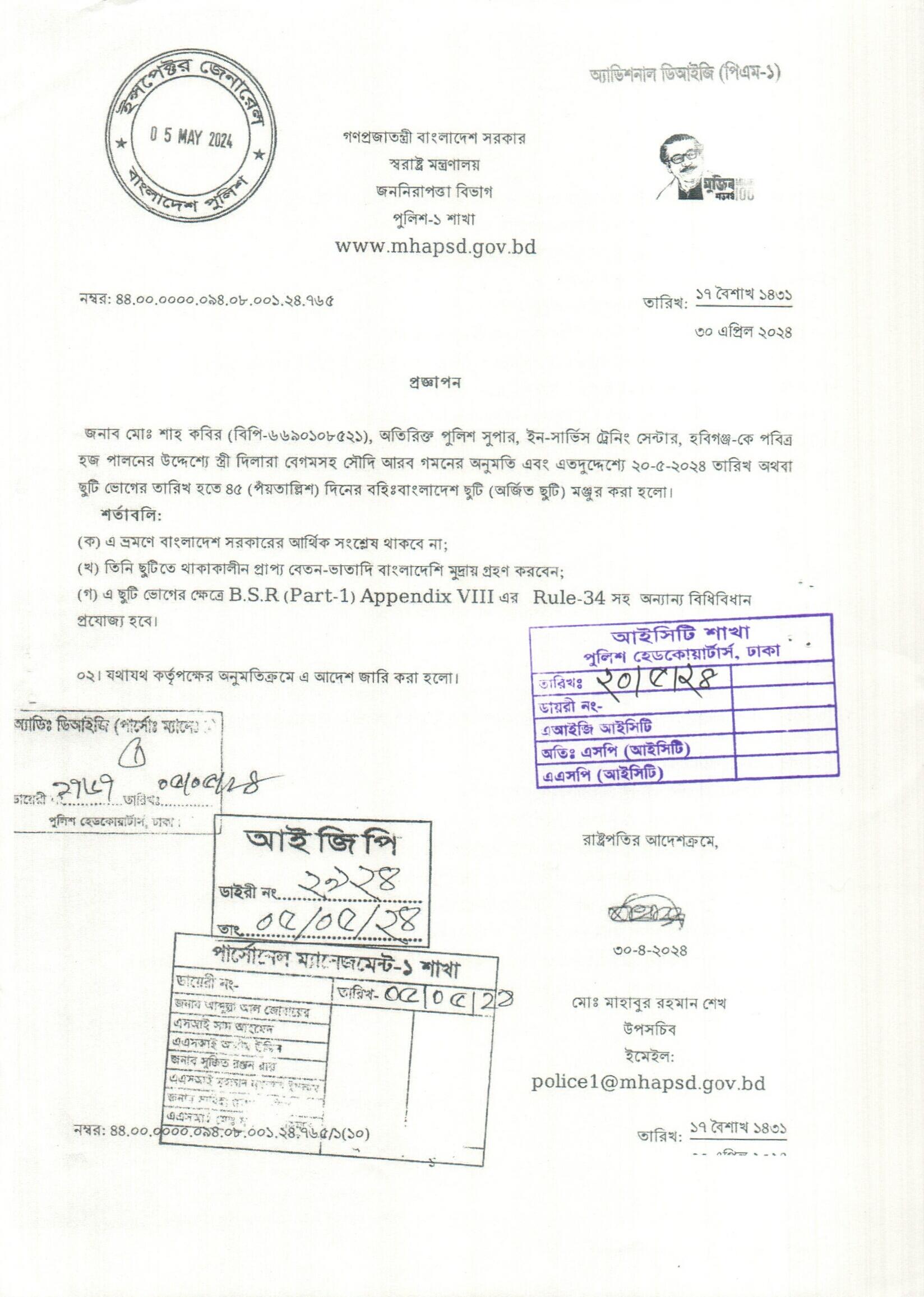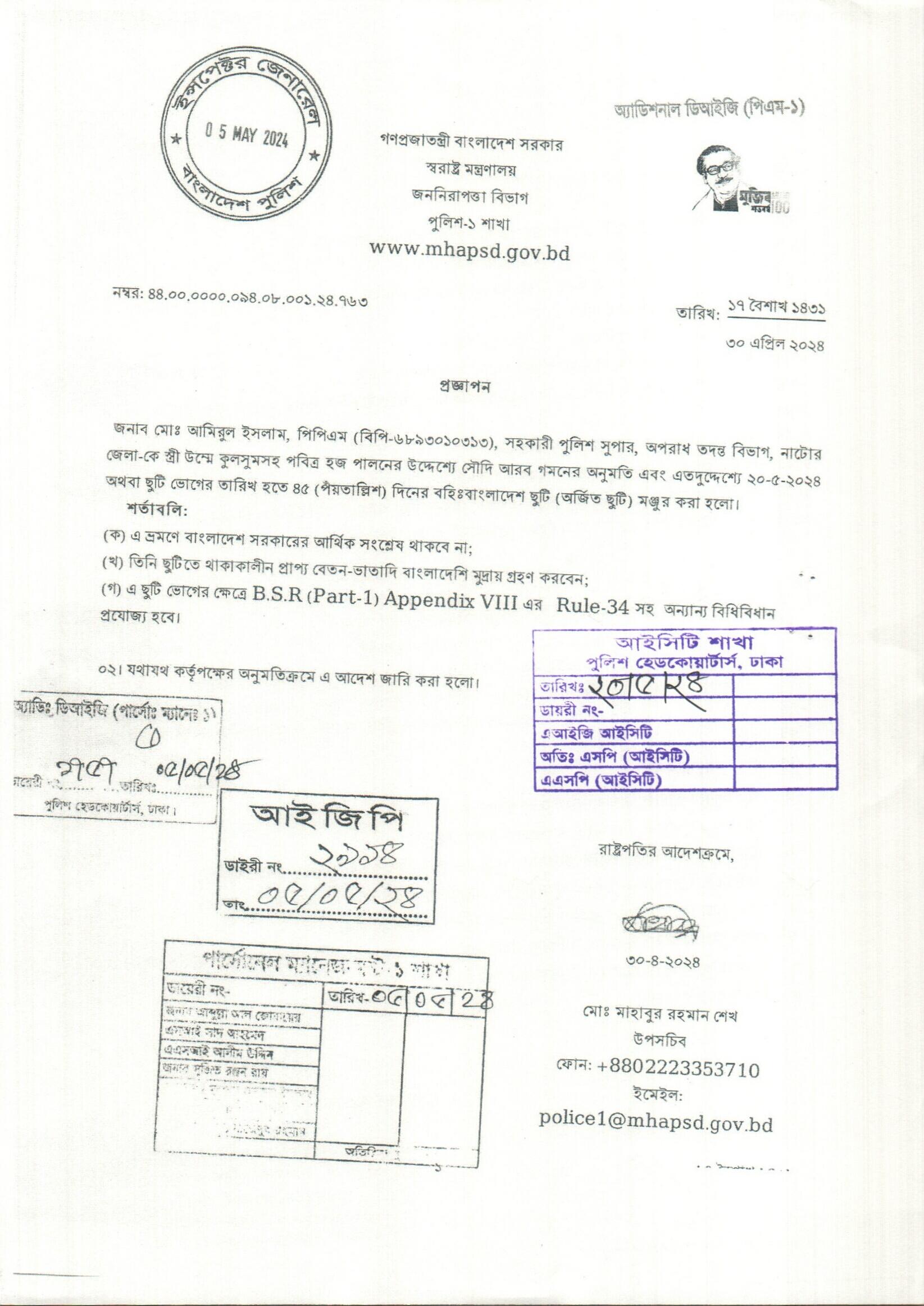বহিঃ বাংলাদেশ ছুটি, প্রজ্ঞাপন নং- ৭৬৫, তারিখঃ ৩০/০৪/২০২৪ খ্রিঃ।