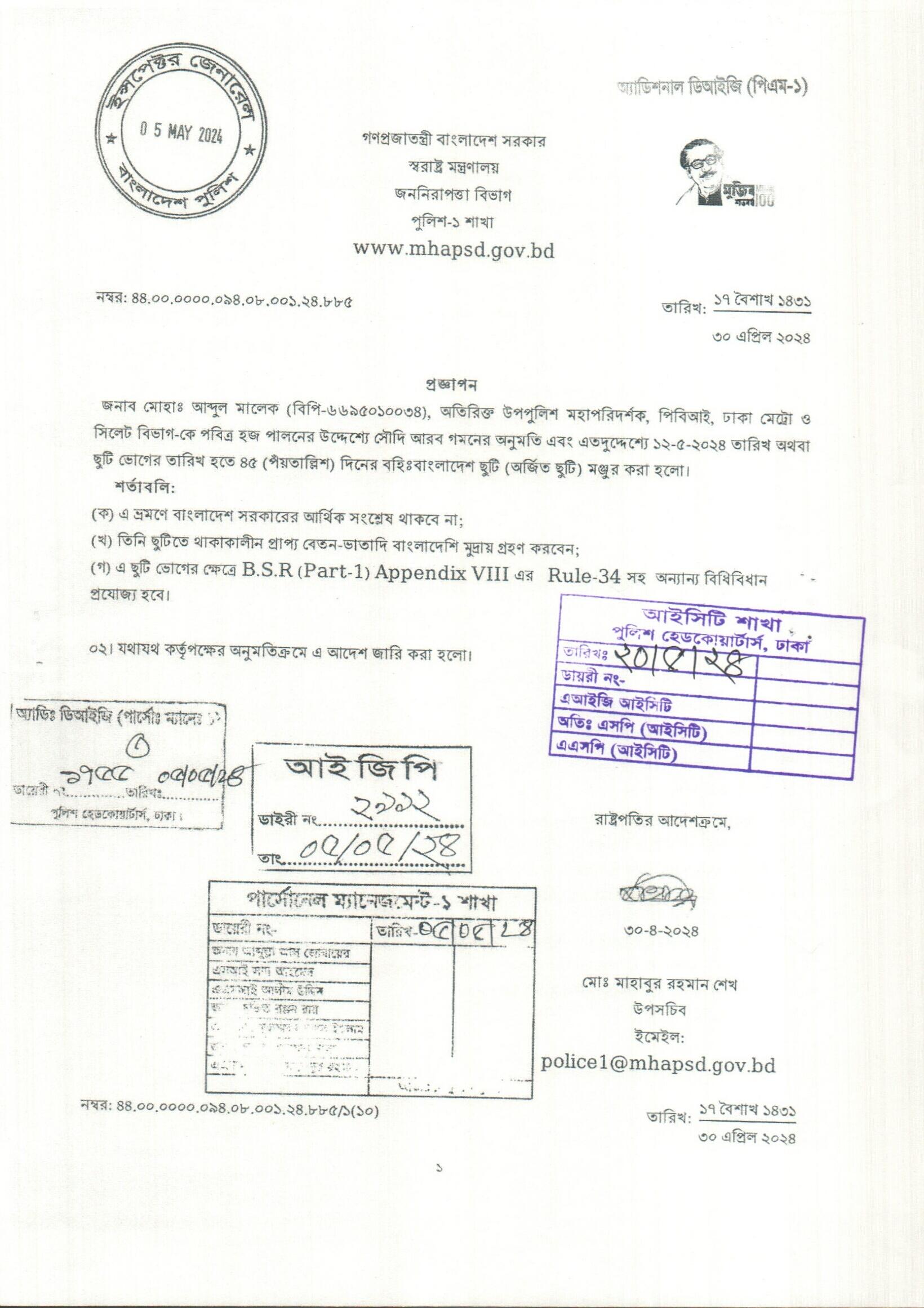 বহিঃ বাংলাদেশ ছুটি, প্রজ্ঞাপন নং- ৮৮৫, তারিখঃ ৩০/০৪/২০২৪ খ্রিঃ।
