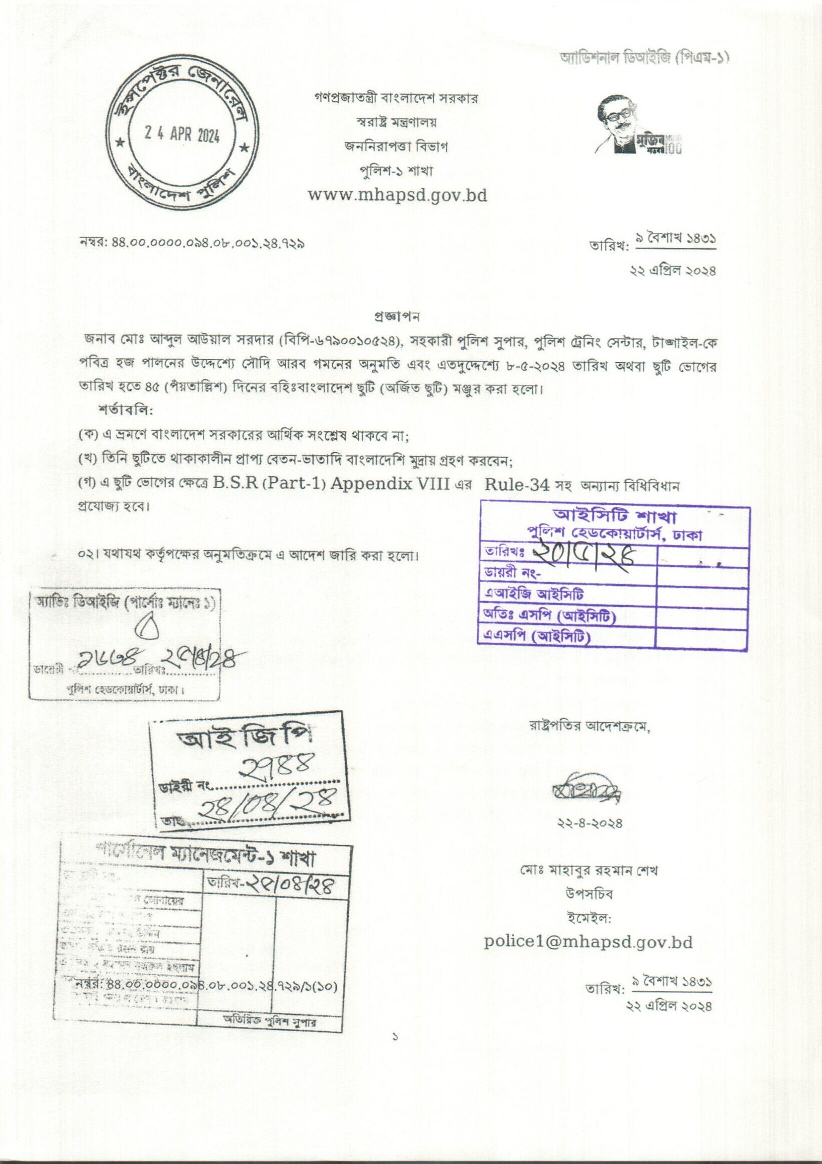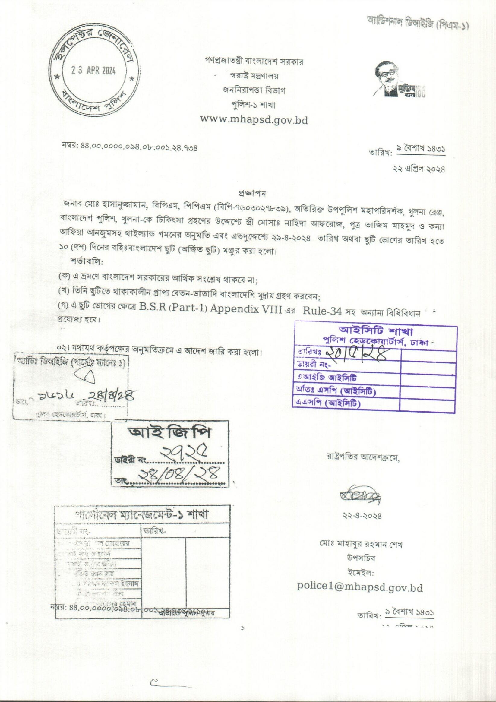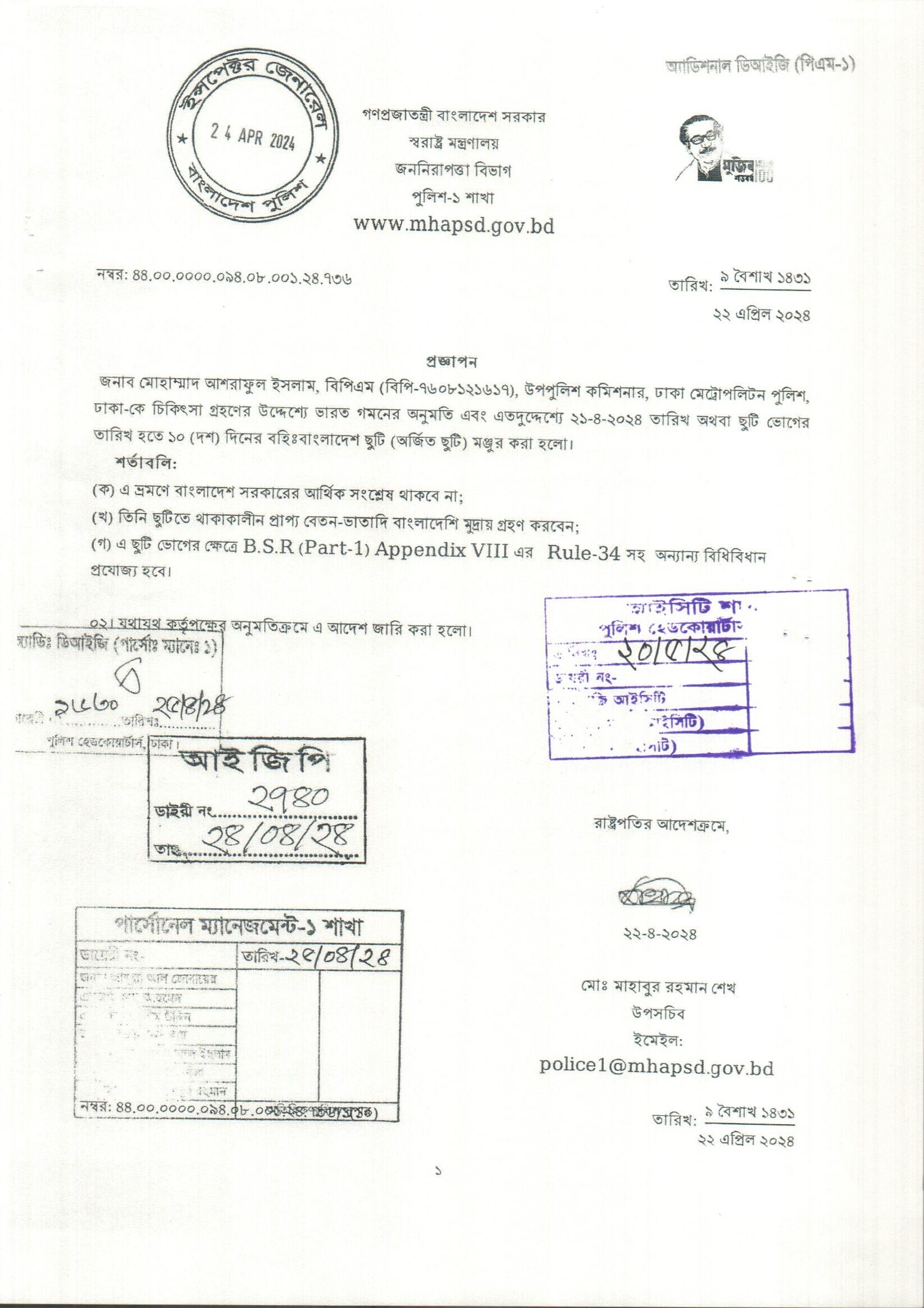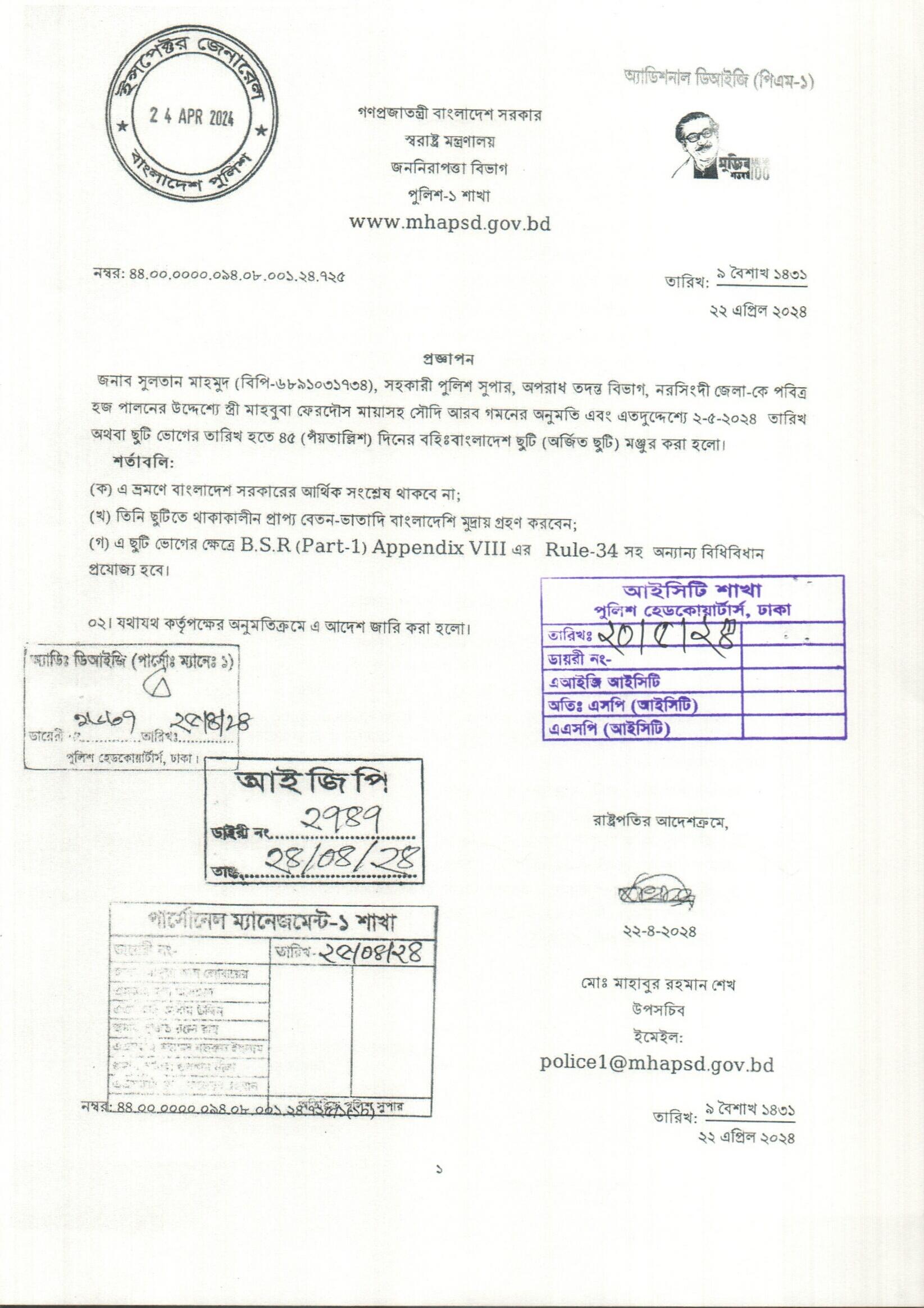 বহিঃ বাংলাদেশ ছুটি, প্রজ্ঞাপন নং- ৭২২, তারিখঃ ২২/০৪/২০২৪ খ্রিঃ।