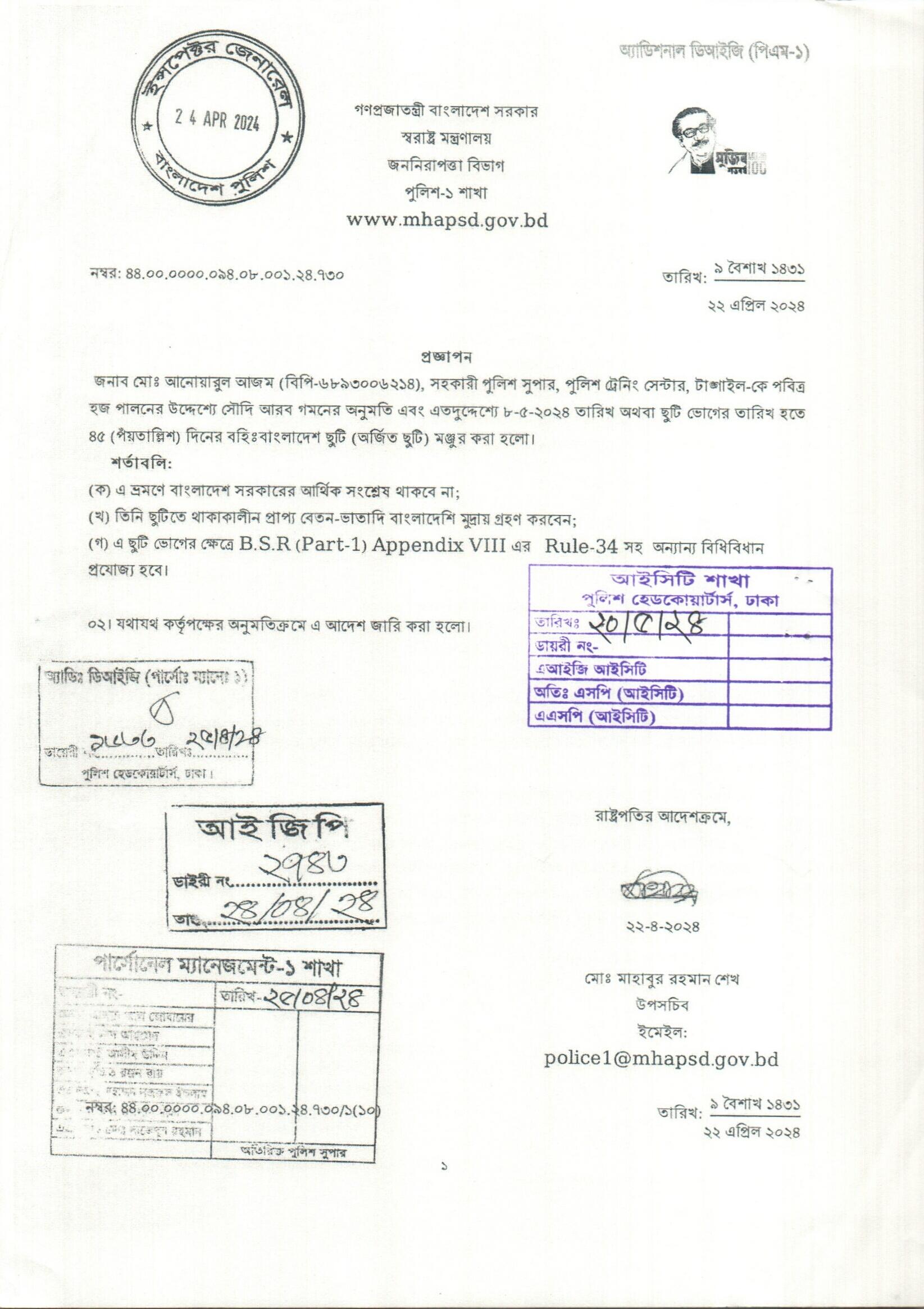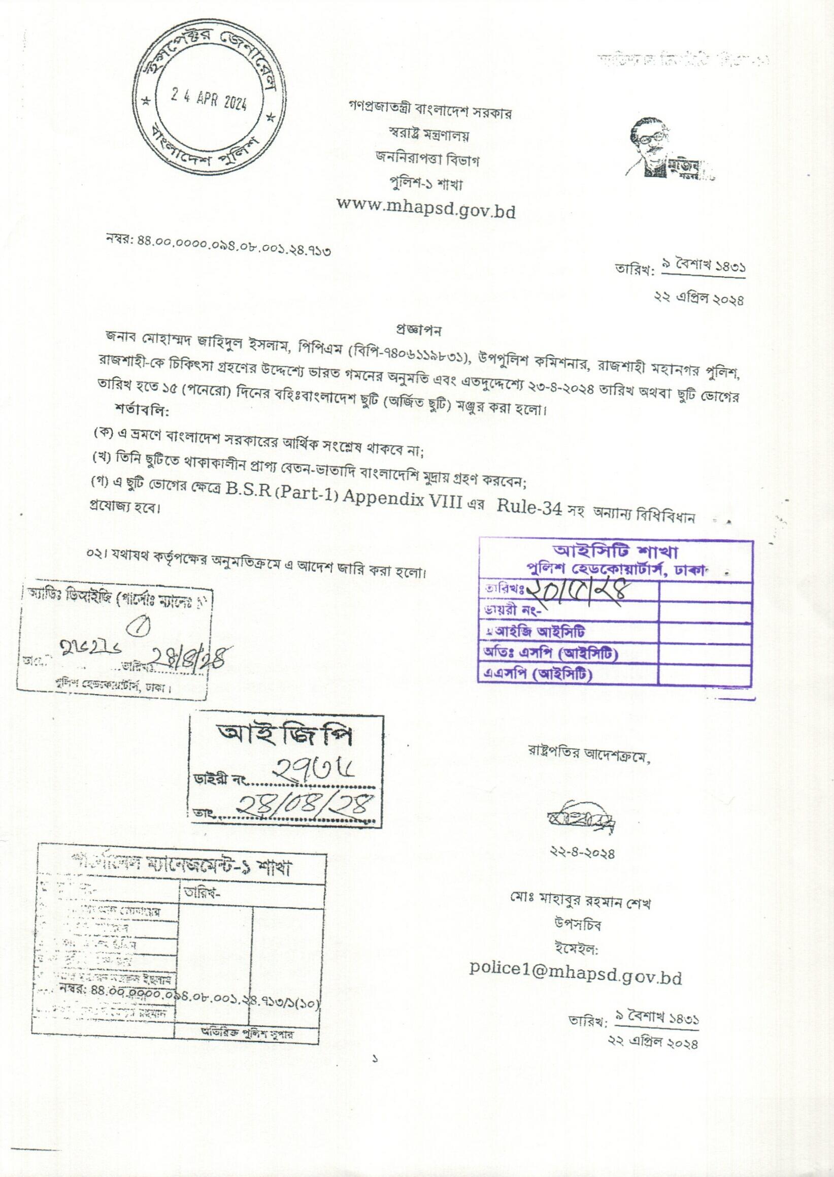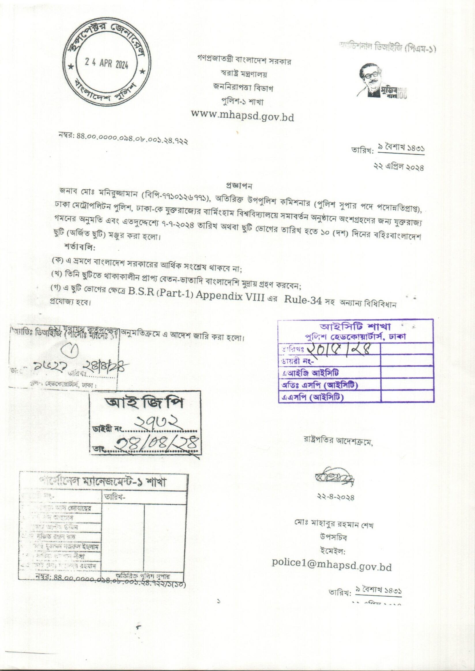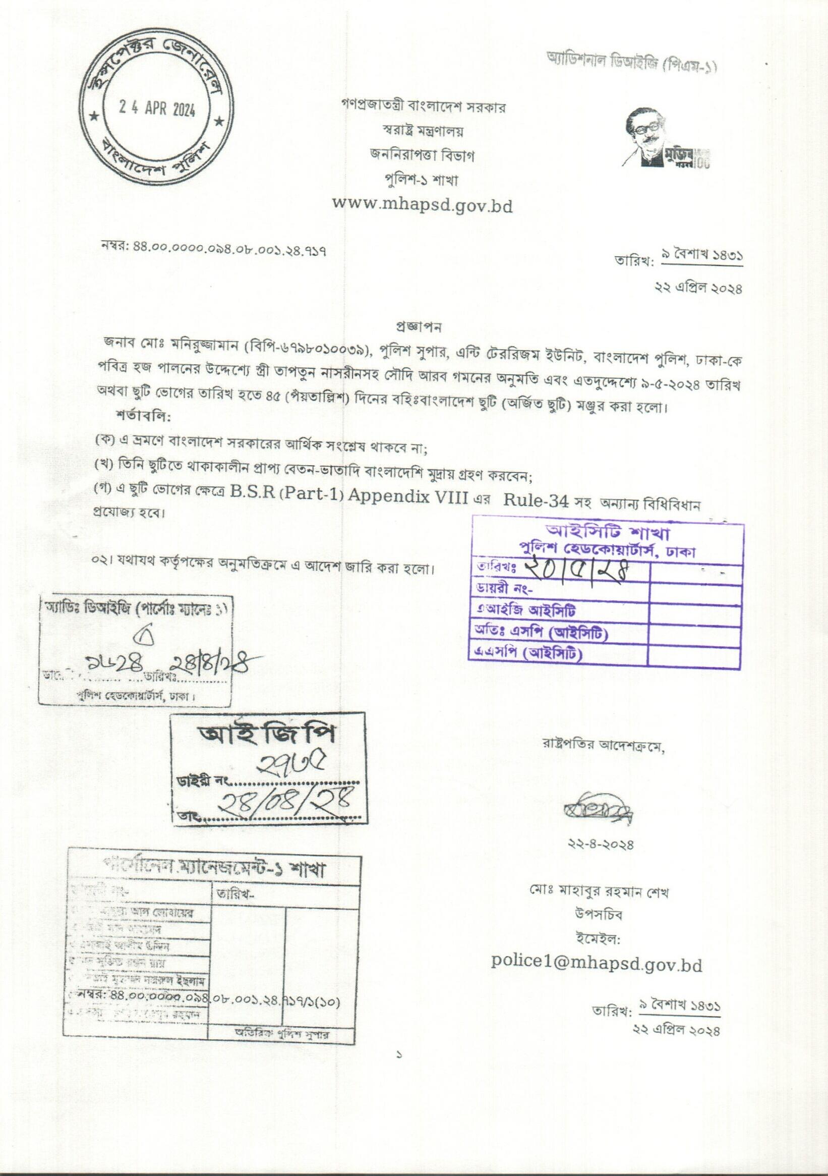 বহিঃ বাংলাদেশ ছুটি, প্রজ্ঞাপন নং- ৭২২, তারিখঃ ২২/০৪/২০২৪ খ্রিঃ।